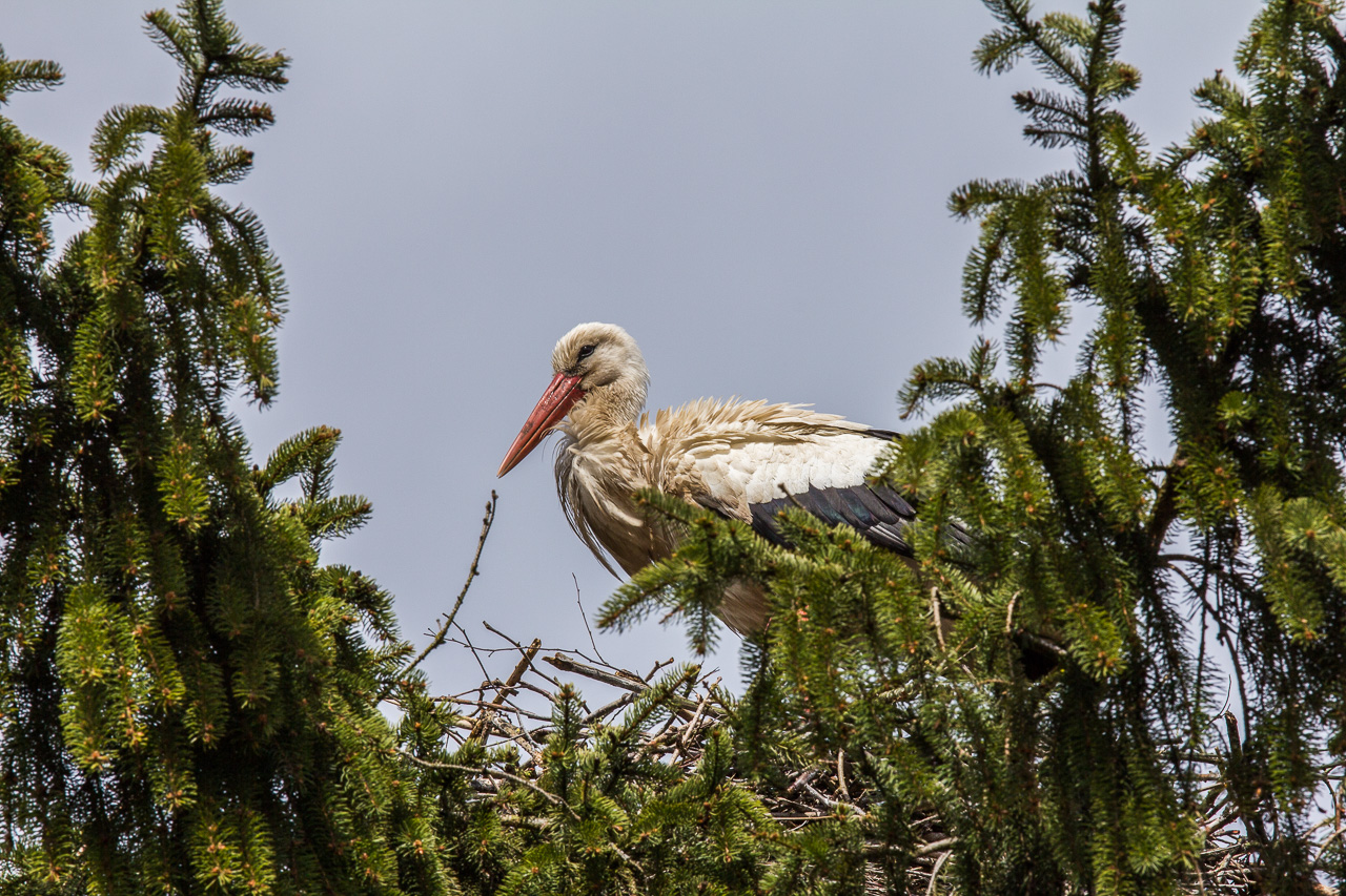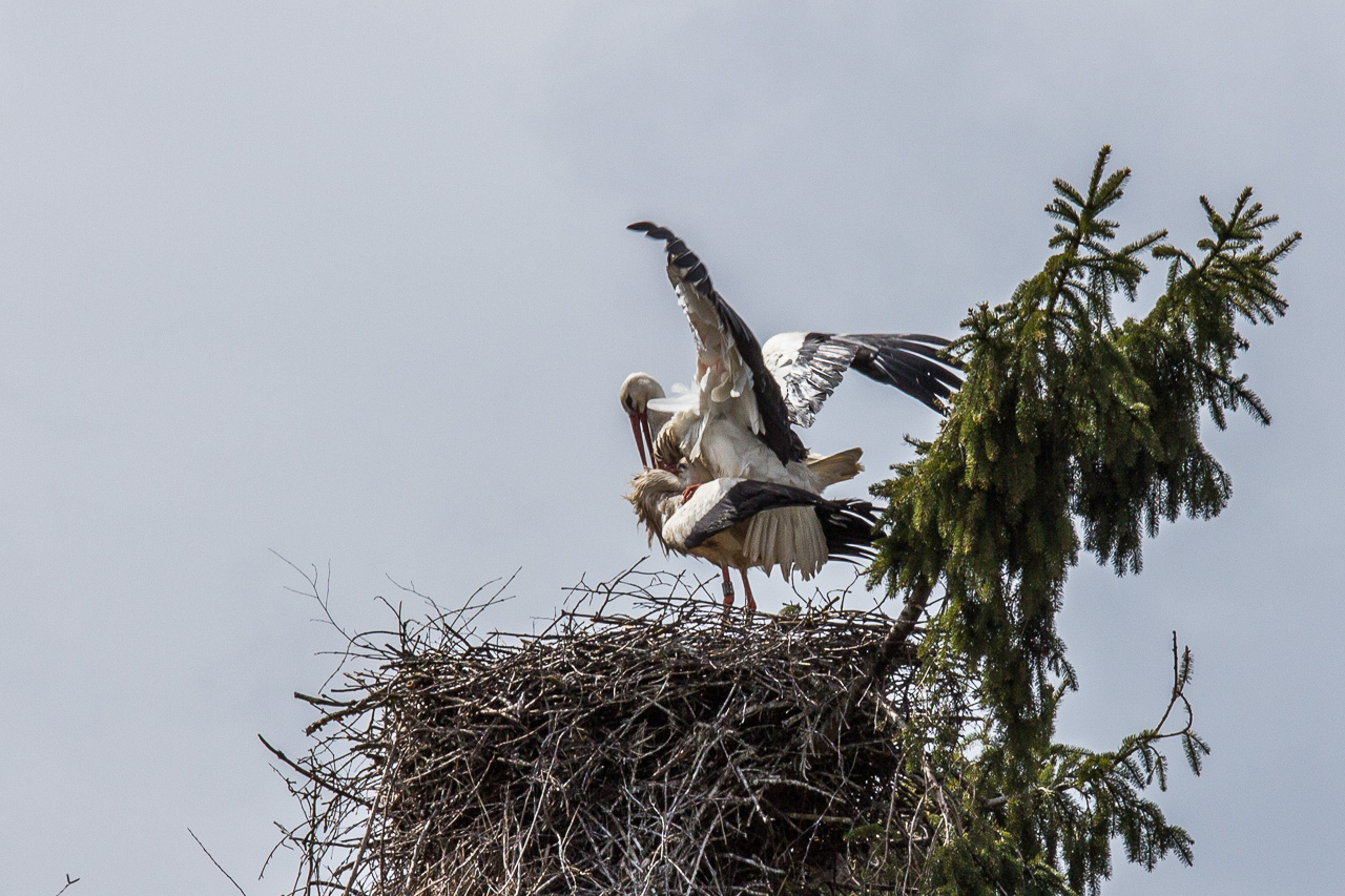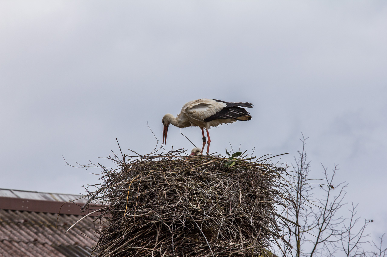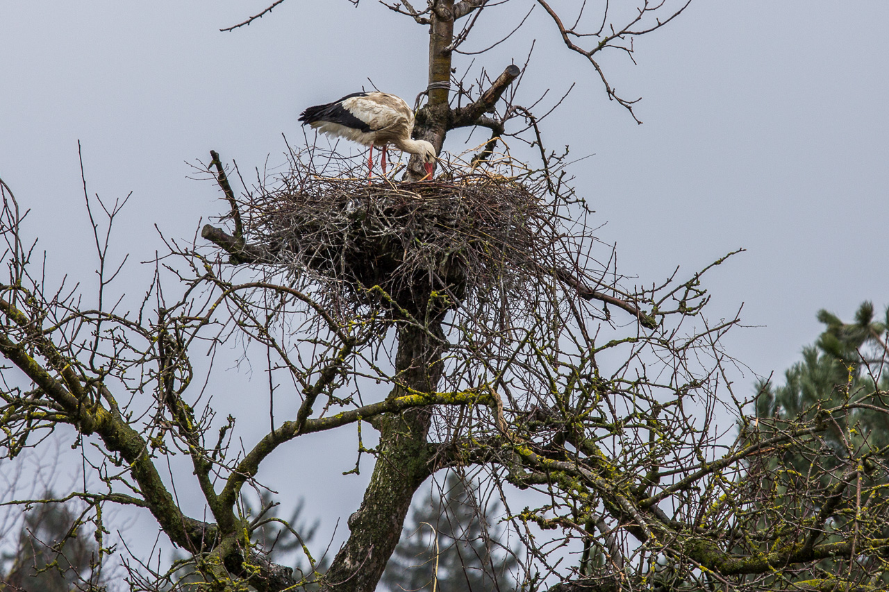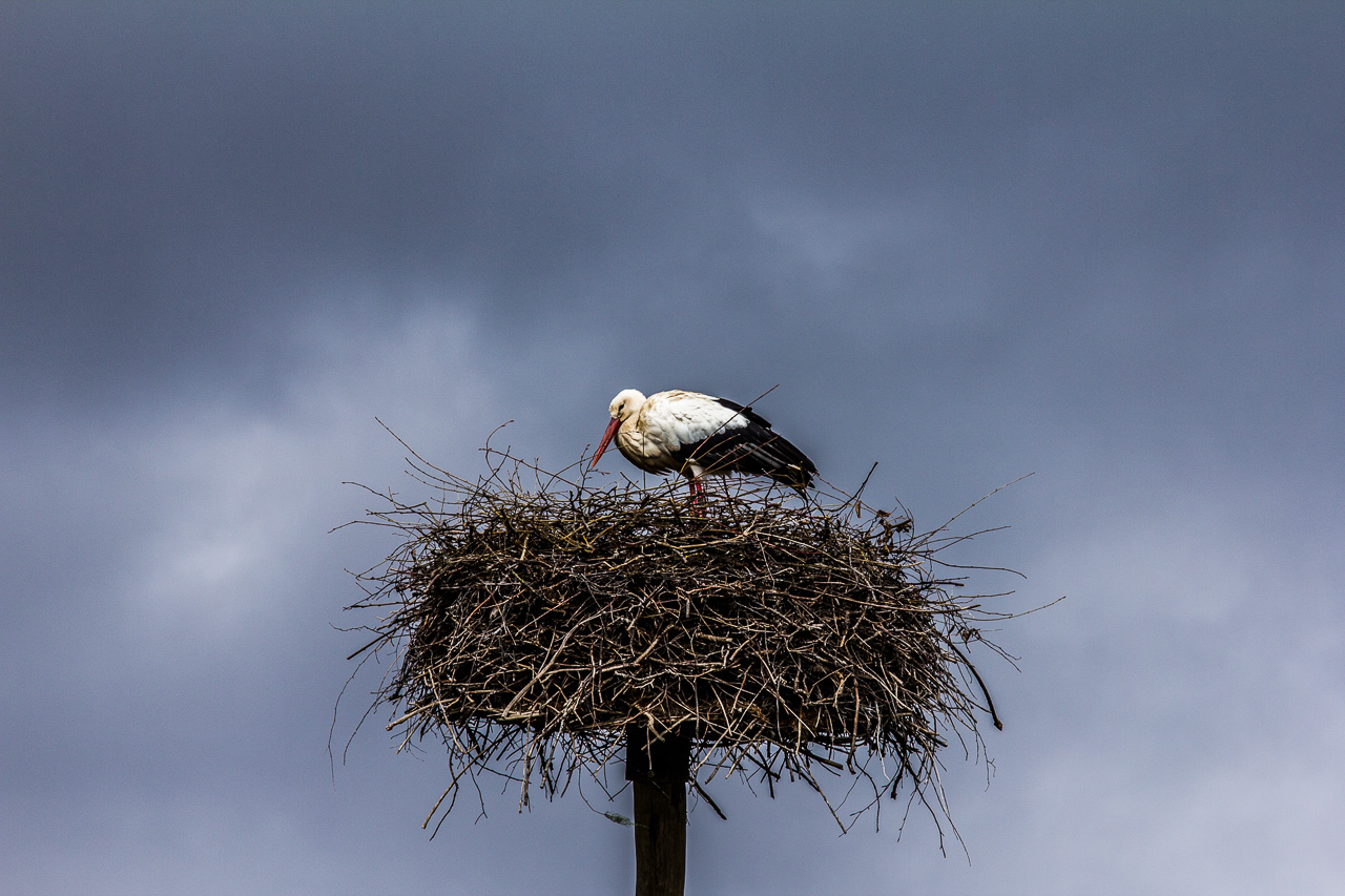 Trotz Regen gehen wir weiter, überall fliegen, schreiten und nisten Störche. Das Murimoos beherbergt die zweitgrösste Storchenkolonie der Schweiz nach jener von Altreu bei Solothurn. Zum Glück werden die Spielhäuser auch ausgestellt, so können wir dort vor dem Regen Zuflucht suchen und die Störche beobachten. Auf den Bäumen und auf den Ökonomiegebäuden reiht sich Horst an Horst. Wir durchqueren den Betrieb, Rinderställe, Schafställe und Schweineställe können besichtigt werden. Ein Hide ermöglicht den Blick auf eine Sumpffläche, wo Störche nach Nahrung stochern.
