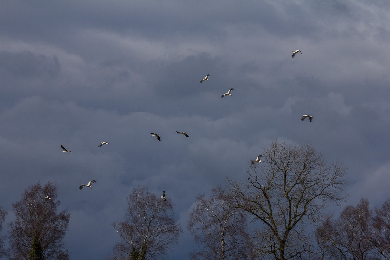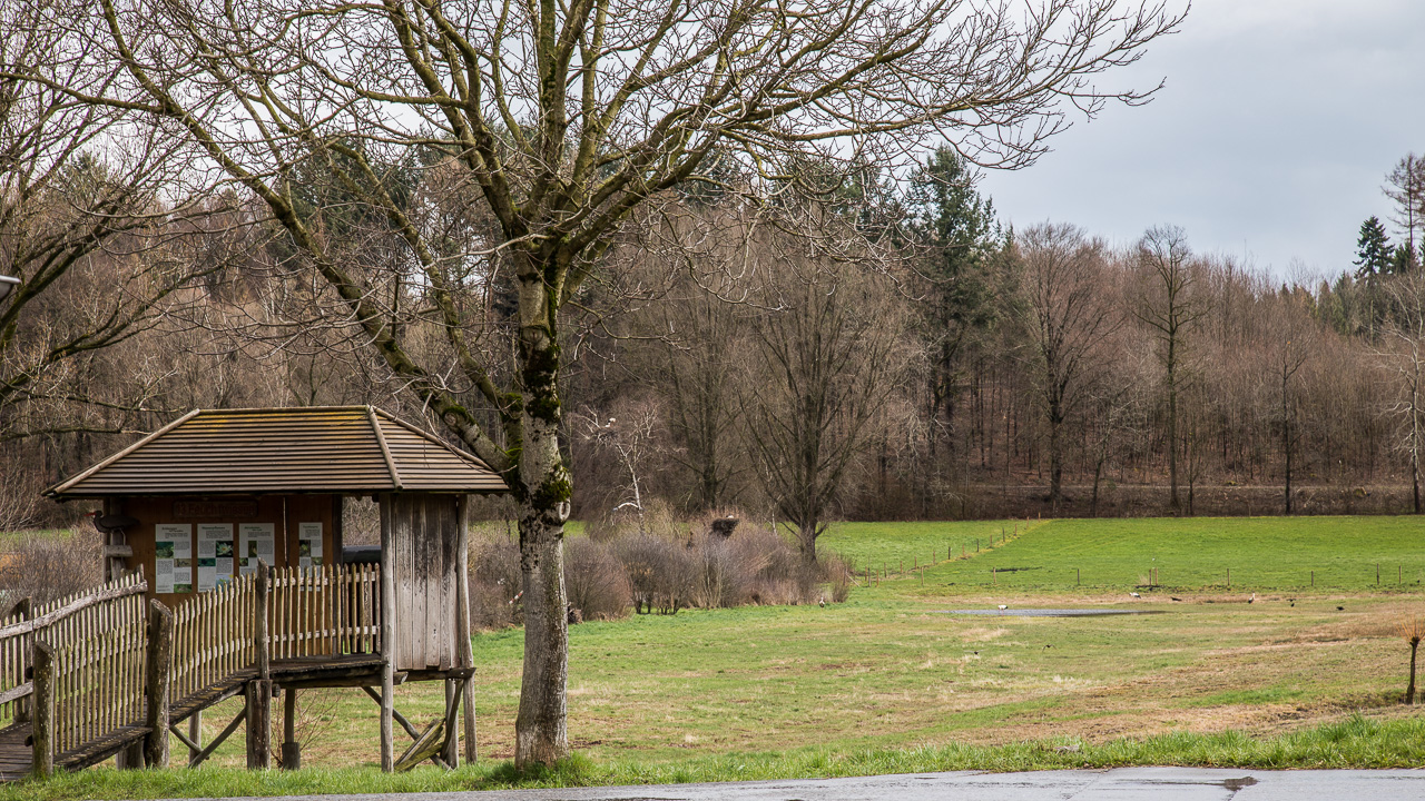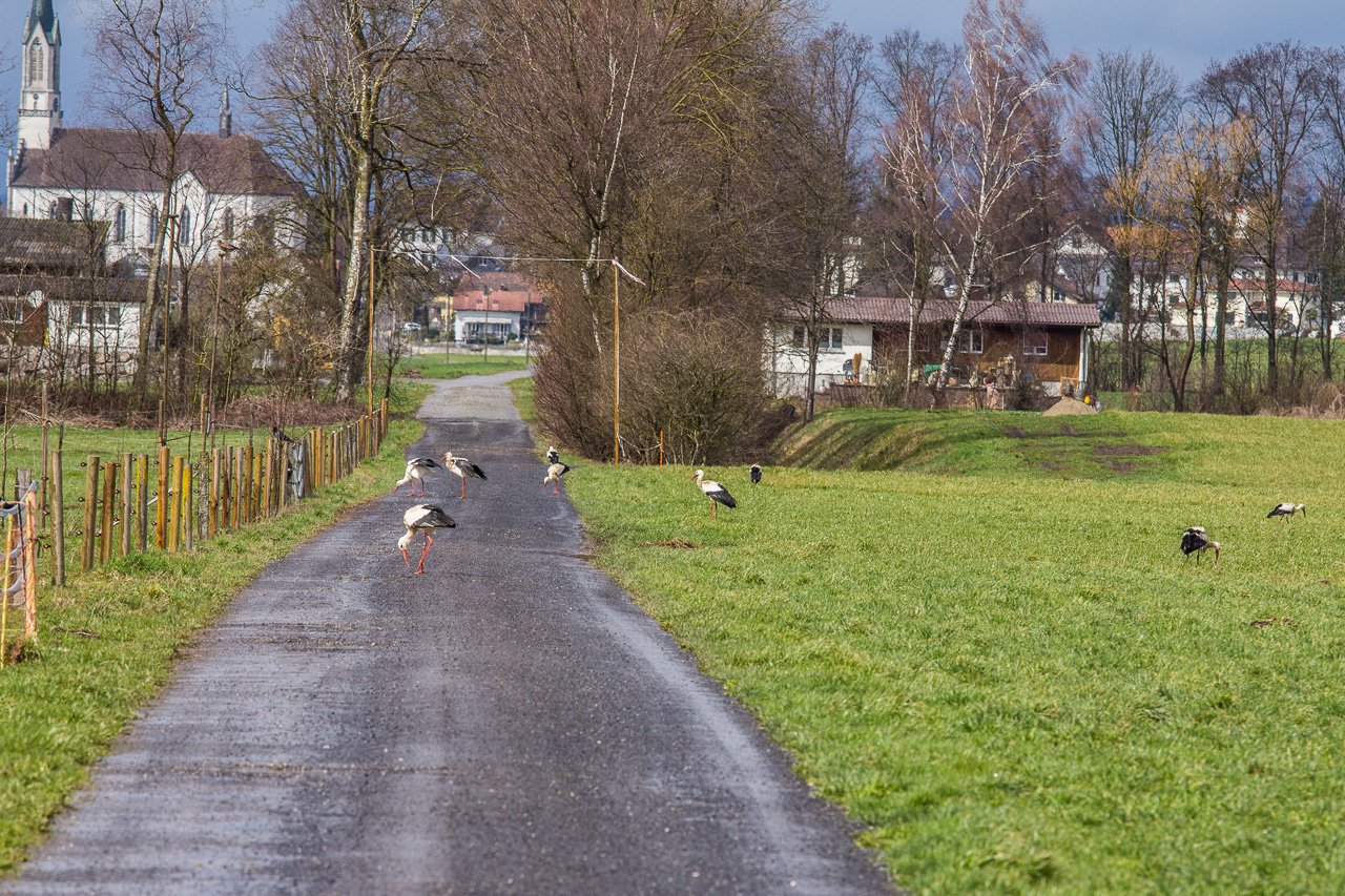Der Murimoosweg ist ein 3.5 Kilometer langer Rundweg mit 21 Informationstafeln, die das Murimoos näher bringen. Angesichts des Wetters verzichten wir auf den ganzen Weg, wollen aber noch einen Blick auf die Felder werfen, wo wir über 30 Störche entdecken können und zirka 10 Rotmilane.
