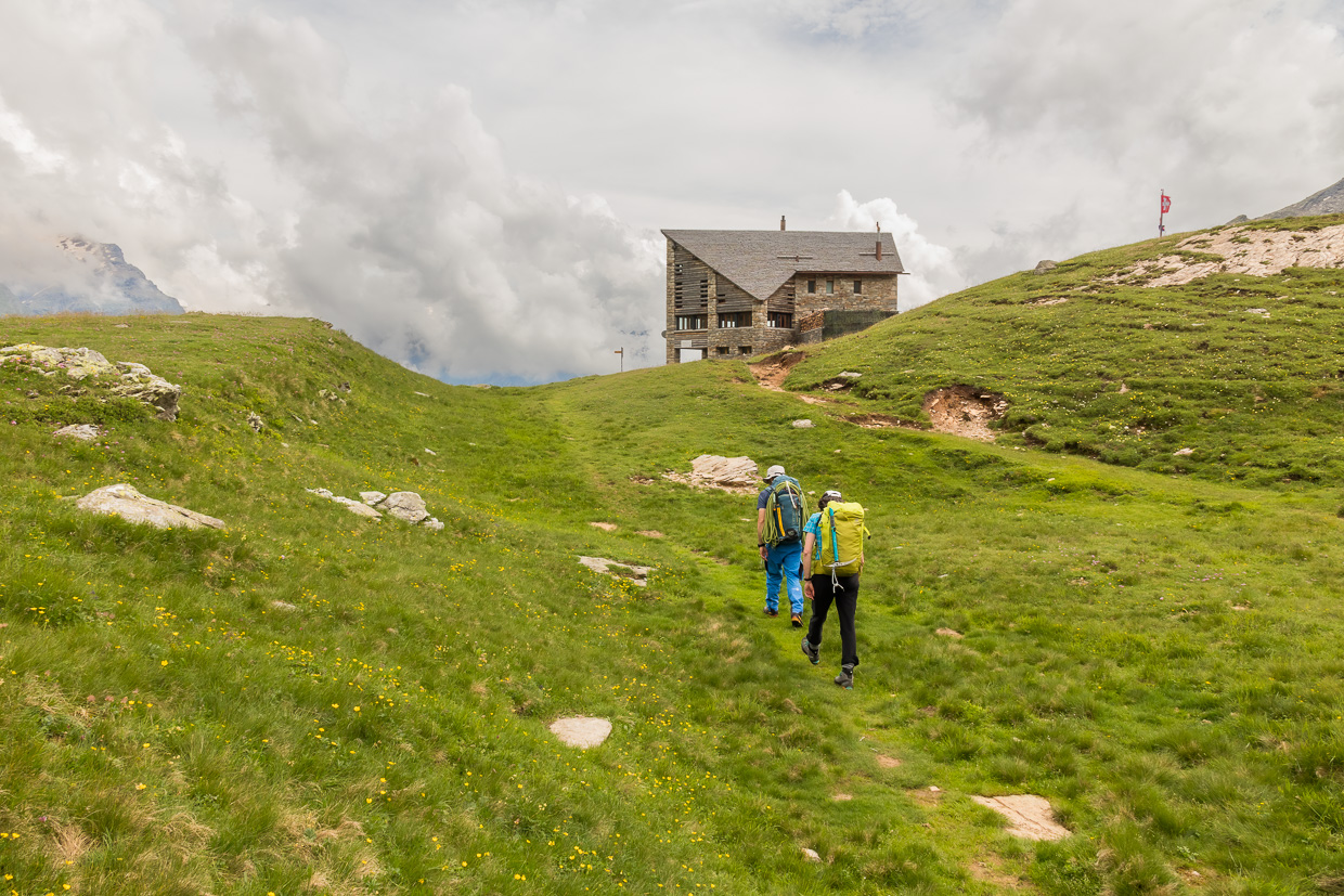 Die Tour war ausgeschrieben im Tourenprogramm des SAC Homberg, aber ausser der Frau und ich interessierte sich offensichtlich niemand dafür. Schade, die Leute haben viel verpasst, aber gut für uns. So fahren wir zu Dritt, der Tourenleiter, die Frau und ich, mit dem Zug ins Tessin. In Malvaglia transportiert uns eine in die Jahre gekommene Seilbahn hoch, bevor der schweisstreibende Aufstieg in die Capanna Quarnei beginnt. Wegen vorangegangenen Unwettern sind verschiedene Wanderwege gesperrt, wir müssen verschiedene Umleitungen nehmen. Nach knapp vier Stunden erreichen wir die Hütte. Das Rheinwaldhorn verhüllt sich in Wolken, wir sehen unser Ziel nicht.