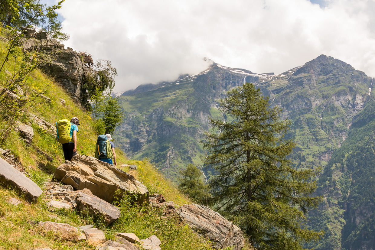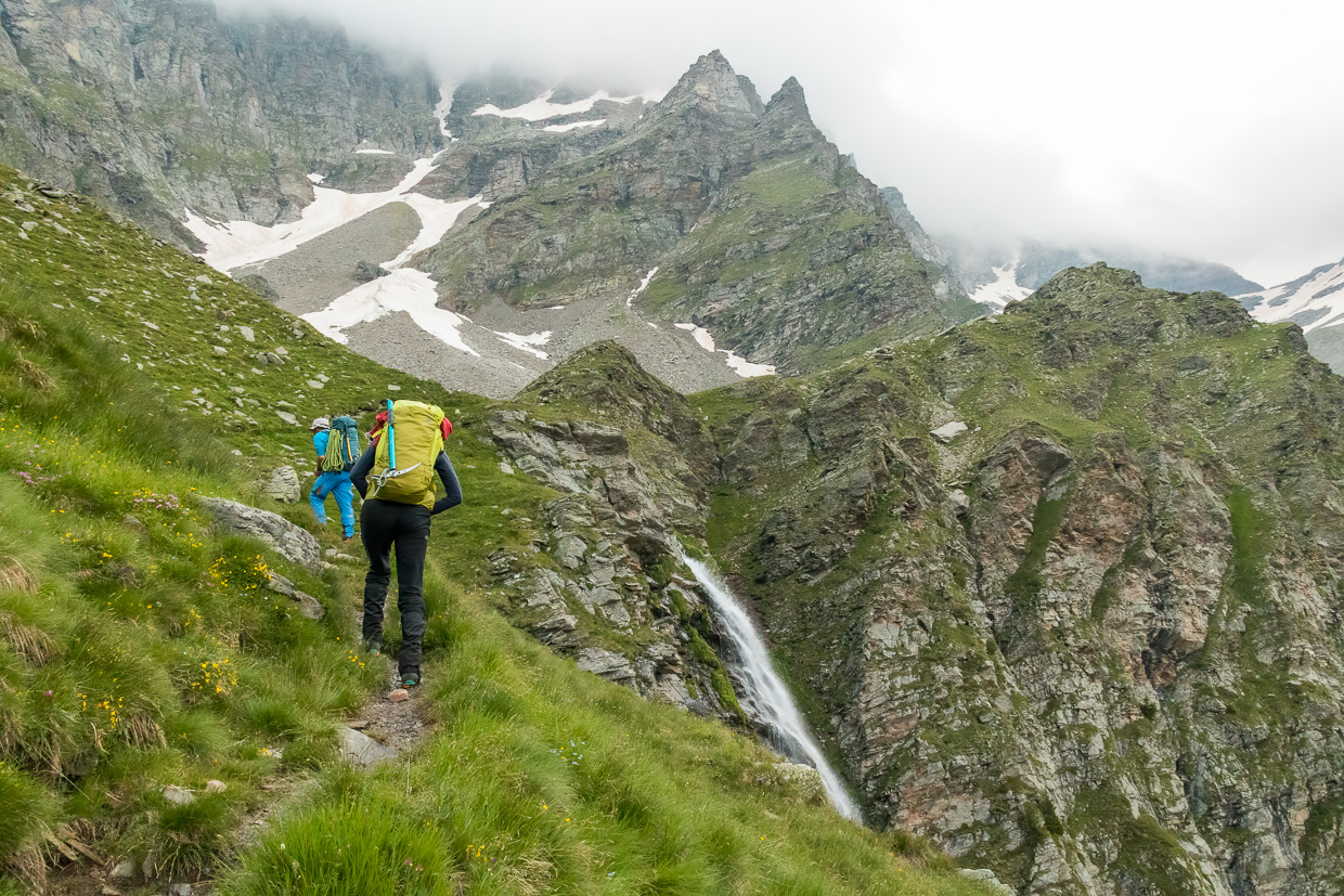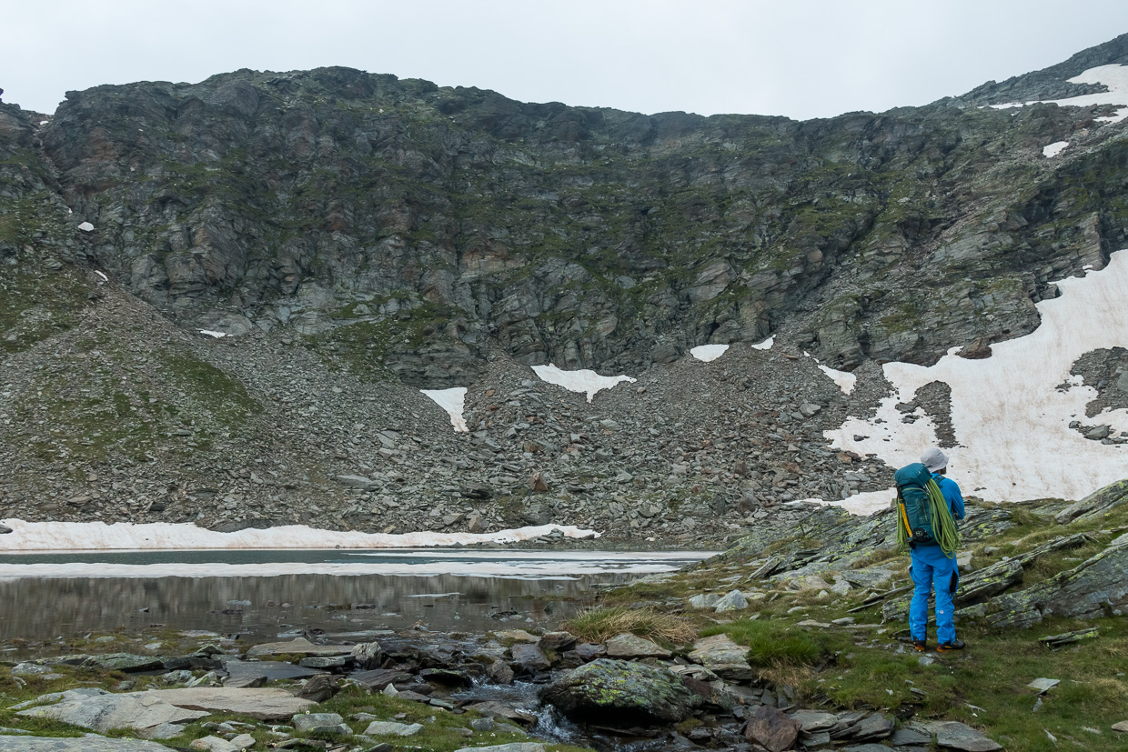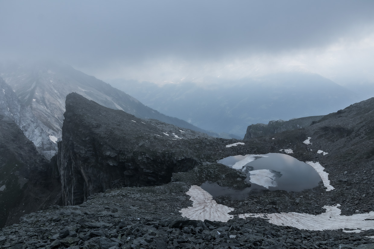 Am nächsten Morgen brechen wir um fünf Uhr auf, es dämmert. Wir überqueren die Alpe di Quarnei und steigen dann steil hoch zum Passo di Laghetto. Das Gelände hat es in sich für einen Bergwanderweg, zum Teil geht, nein kraxelt man quasi mitten im Bach hoch. Oben auf dem Pass blicken wir auf den Laghetto dei Cadabi, der noch teilweise von Eis bedeckt ist.