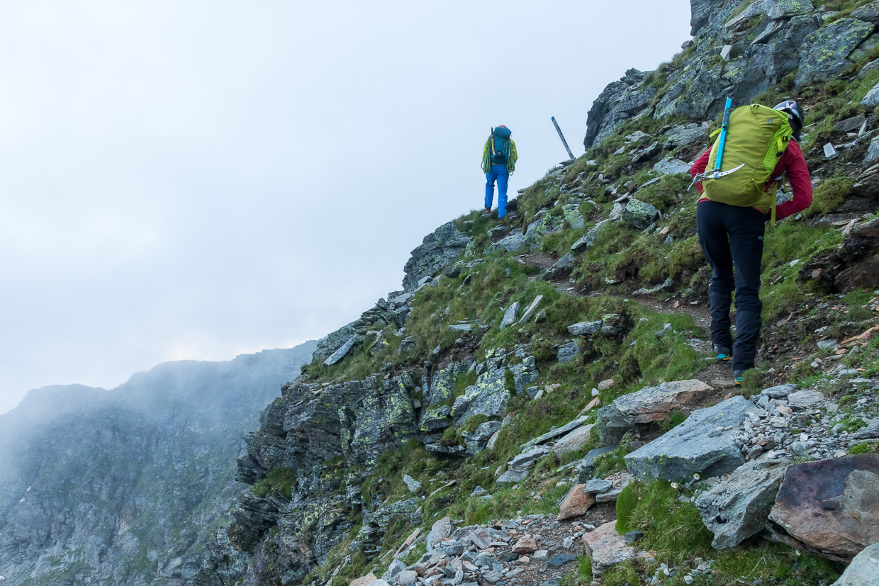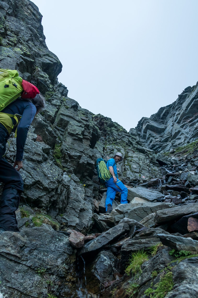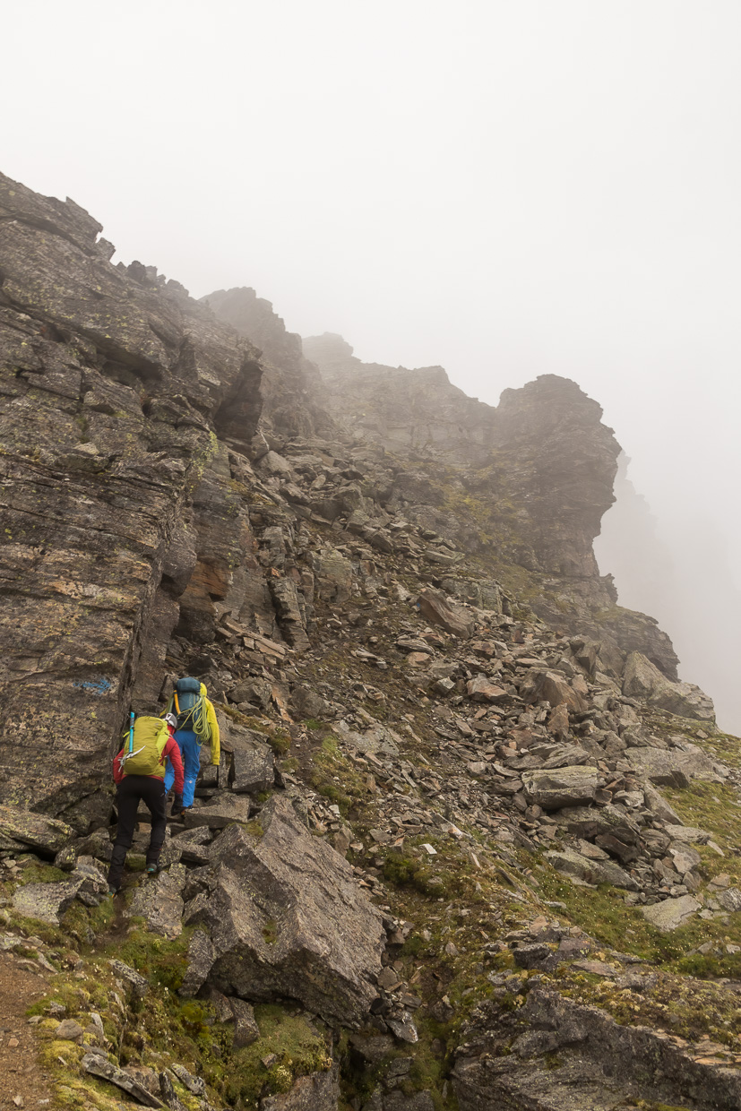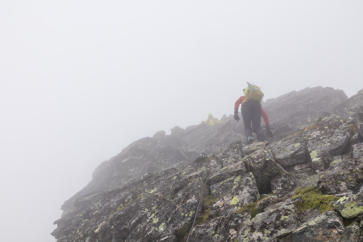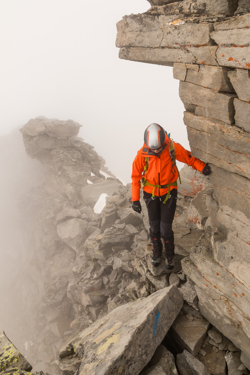 Nun wird es Ernst, wir ziehen die Helme an. Zuerst steigen wir über Felsblöcke, ohne die Hände zu benötigen, weiter oben wird es steiler. Wir stecken immer noch mitten im Nebel, sprich der Wolke, die das Rheinwaldhorn umwabert, was der Tour etwas Mystisches verleiht. Zwei junge Männer, die uns anfangs gefolgt sind, haben eine anderes Ziel, wir sind ganz alleine unterwegs am Grat. Wir steigen in einfacher Kletterei höher, zwischendurch müssen wir Firnfelder überwinden. Die steilen und schwierigeren Stellen sind mit Drahtseilen oder Ketten gesichert. Es macht Spass, in so abwechslungsreichem Gelände unterwegs zu sein. Eine Kletterstelle weist die Schwierigkeit 1 auf und ist mit einem Drahtseil gesichert, lässt sich aber problemlos ohne klettern. Schwieriger ist ein Kamin, der aber ebenfalls mit einem Drahtseil gesichert ist.