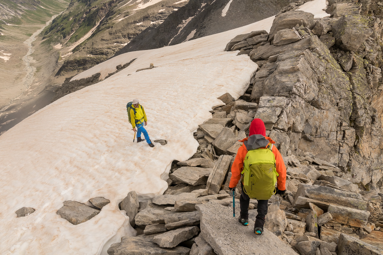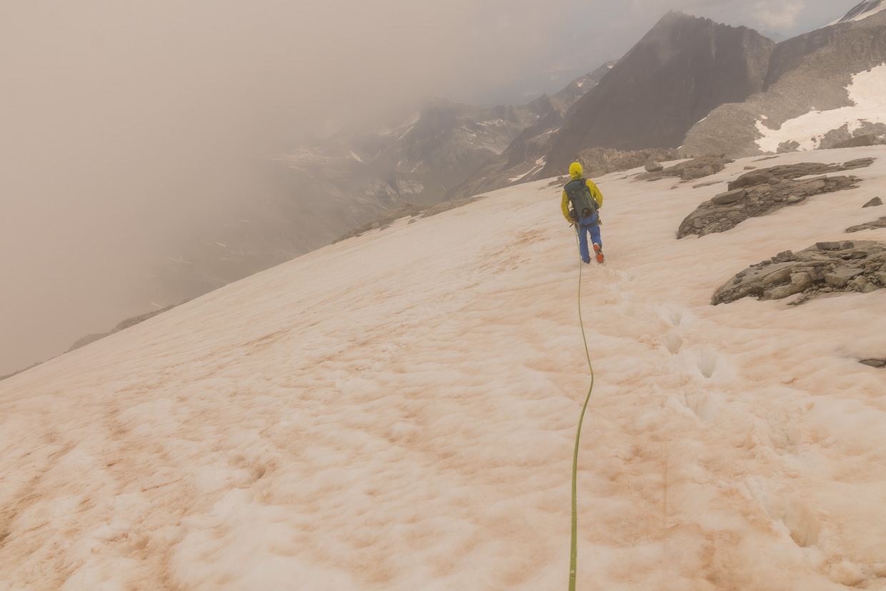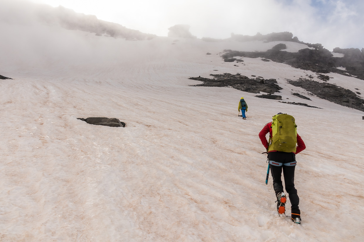 Ein grosses Schneefeld, das sich immer mehr aufsteilt, veranlasst uns, die Steigeisen anzuziehen und den Eispickel hervorzunehmen. Daran sehe ich, dass ich schon lange in die Berge gehe: Pickel und Steigeisen sind noch komplett aus Stahl und wahnsinnig schwer im Vergleich zu neuer Ausrüstung, aber voll funktionstüchtig. Wozu soll ich also neue Ausrüstung kaufen für die paar Hochtouren, die ich mache? Wir steigen weiter hoch, ab und zu versinkt man etwas tiefer im Schnee.