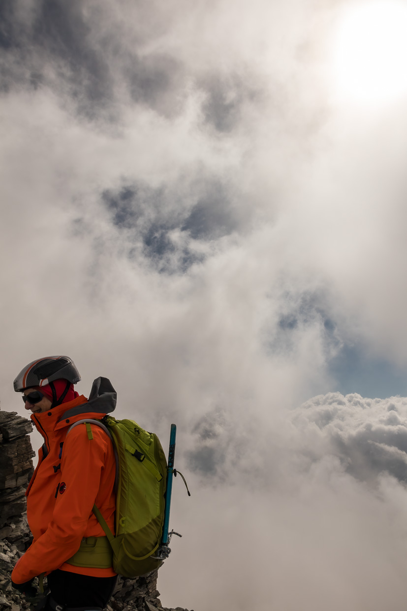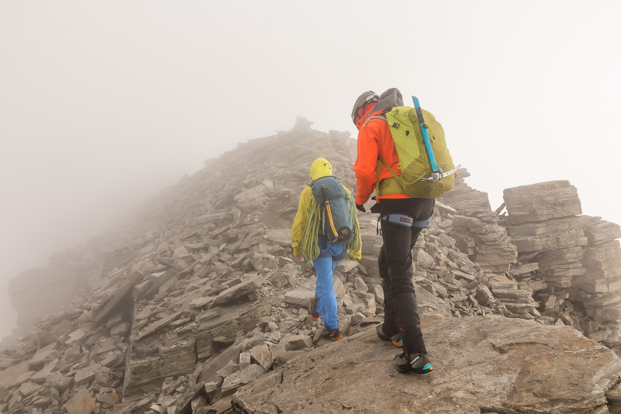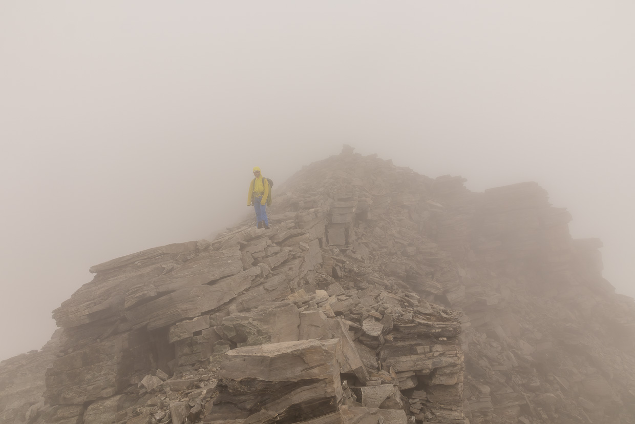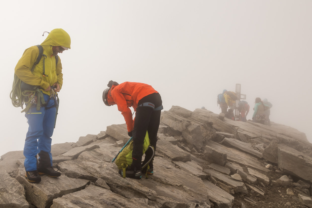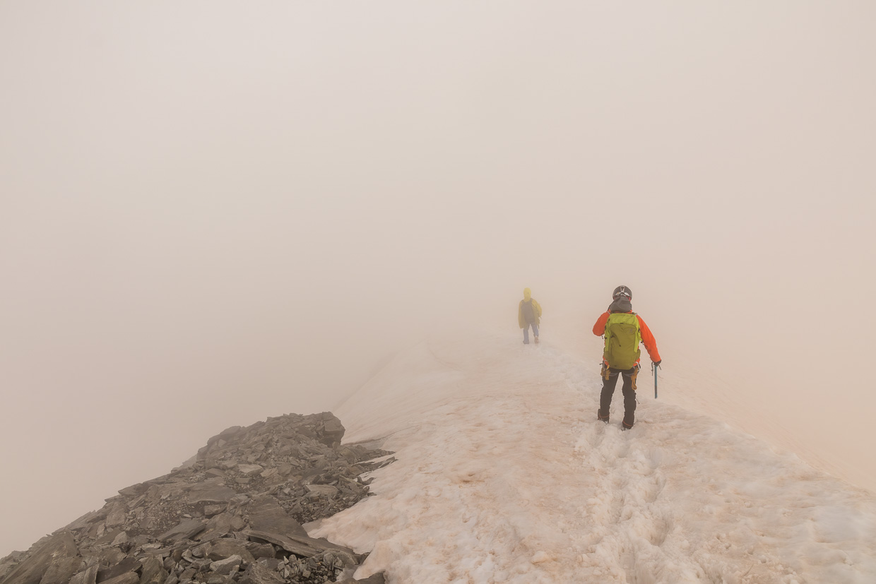 Auf dem Grat ziehen wir die Steigeisen wieder aus, der Rest bis zum Gipfel ist Fels. Kurz davor wird es nochmals interessant, einen Gendarmen muss man rechts umgehen, man hat ziemlich viel Luft unter den Füssen. Aber auch diese Passage ist drahtseilgesichert. Nun bleiben nur noch ein paar Meter über einen Blockgrat, dann haben wir den Gipfel erreicht. Was für eine Aussicht! Würde ich normalerweise schreiben, aber wir haben leider keine, der Gipfel ist immer noch in den Wolken, obwohl vorher ab und zu die Decke aufgerissen ist und wir Sonne und blauen Himmel sahen. Nun ja, ist es eben so, grossartig war die Kletterei trotzdem. Wir sind übrigens nicht die einzigen hier, mehrere Seilschaften kamen von den Adulahütten her, von da ist der Zustieg kürzer und eine reine Gletschertour.