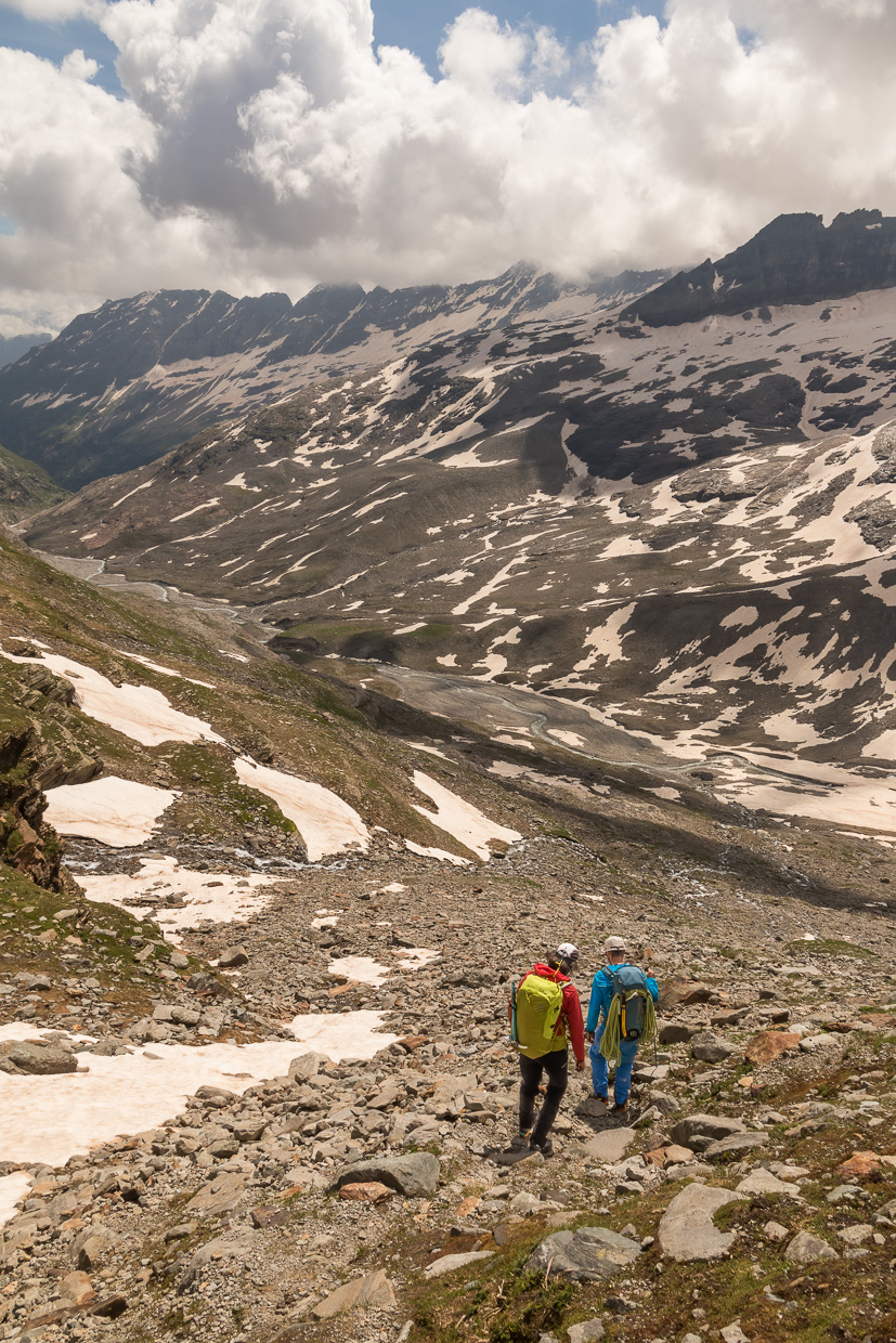 Nun erwartet uns ein langer Abstieg. Da es sich um einen Gletscher handelt, seilen wir an (und damit der Tourenleiter das Seil nicht vergebens mitgenommen hat). Im Schnee geht es rassig abwärts, wir erreichen bald wieder Fels, wo wir uns den Eissachen und des Seiles entledigen. Über Blöcke klettern wir abwärts, dazwischen gibt es immer wieder Schneefelder. Kurz vor der Läntalücke steigen wir ostwärts ab, Schnee- und Geröllfelder wechseln sich ab. Die Wegfindung ist nicht ganz einfach und wird es auch weiter unten ohne Schneefelder nicht. Wir müssen immer wieder Bäche überqueren.