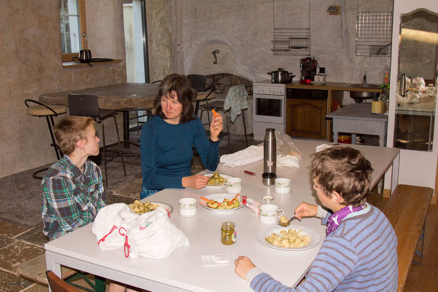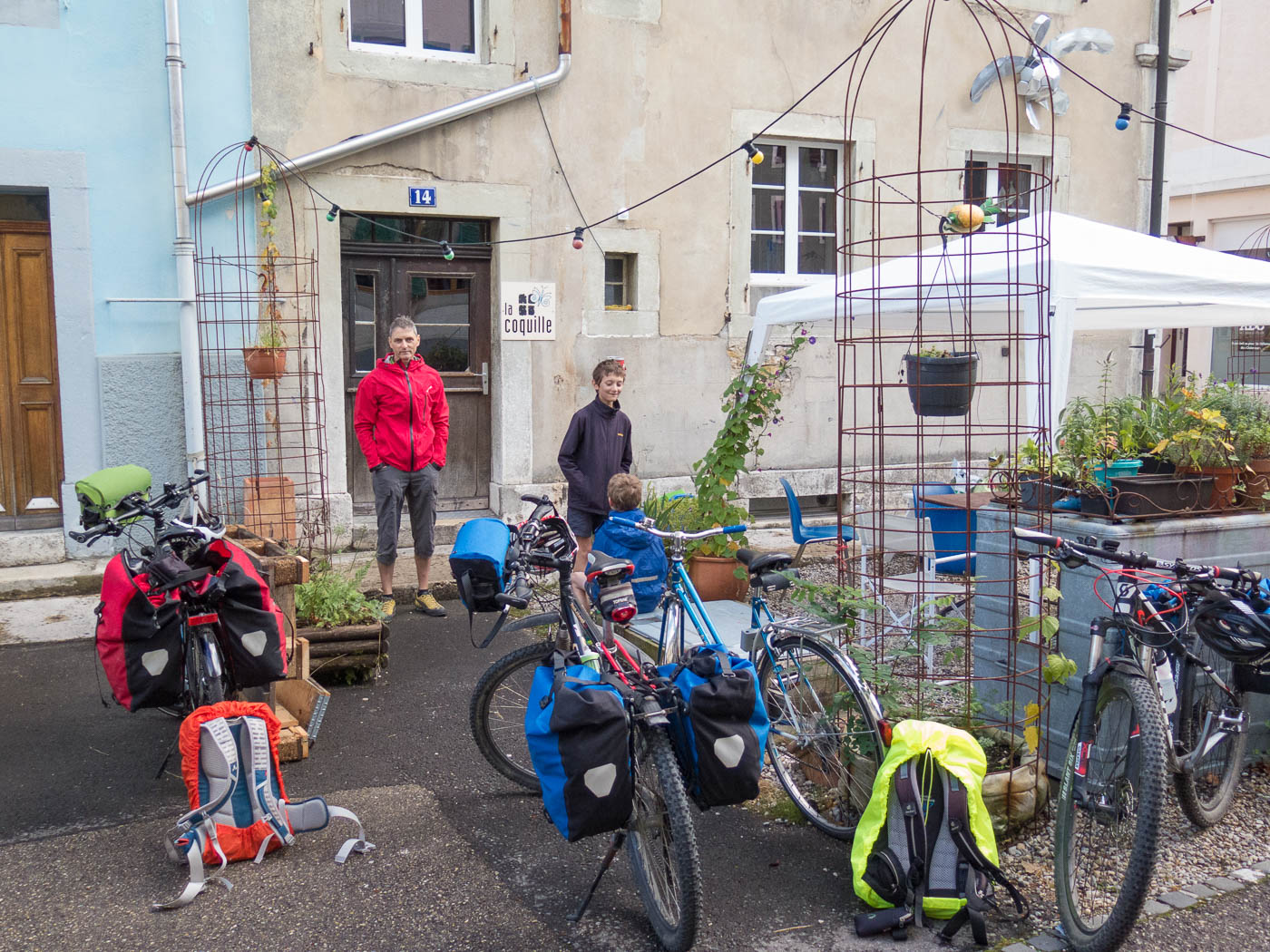 Wir suchten unsere Unterkunft, „La Coquille“. Es dauerte eine Weile, bis jemand kam und uns das Zimmer zeigte. Es war eine einfache Herberge, aber mit allem, was man braucht für eine Nacht. Auch selber kochen kann man, was wir denn auch taten. Übernachtung mit Frühstück kostete 117 Franken. Nein, nicht pro Person, für alle vier zusammen!