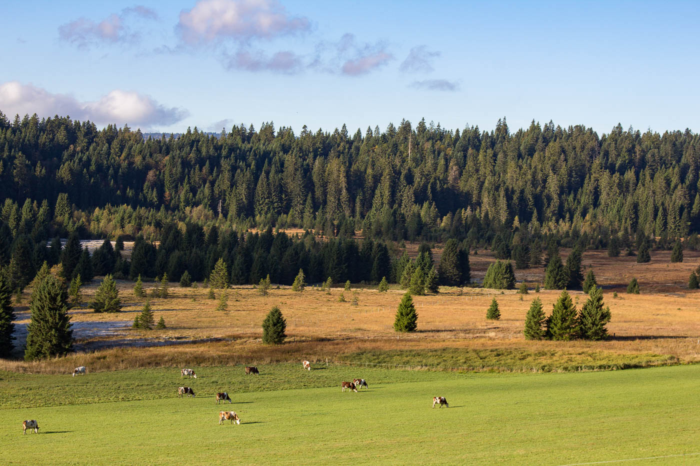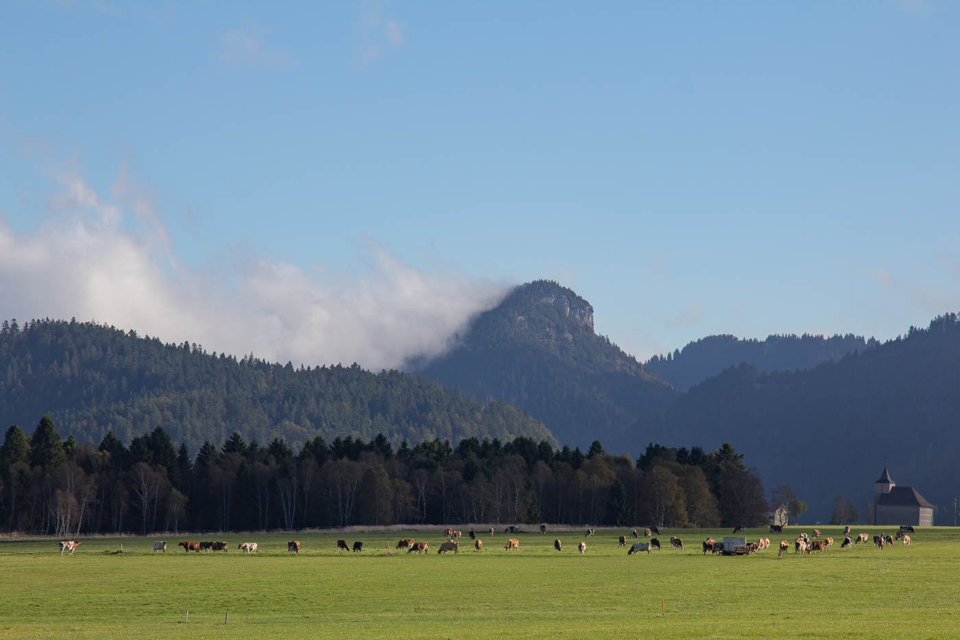 Erstaunlich, wie man im Jurabogen in den abgelegensten Dörfern Uhrenfabriken antrifft, die weltweit bekannt sind. So fahren wir gleich beim Start an der Fabrik der Nobelmarke Piaget vorbei. Das Dorf ist klein, hat aber eine Bäckerei, die wir nicht links liegen lassen können. Auf der Hauptstrasse geht unsere Reise weiter, der Verkehr hält sich zum Glück in Grenzen. Heute scheint die Sonne, aber es weht wieder ein kühler Wind. Wir durchqueren sanftes Hügelland mit Weiden und Wäldern, überqueren bereits ein erstes Pässlein, bevor wir in rasantem Tempo nach La Vraconnaz hinunter brausen. Rechterhand liegt das „Mouille de La Vraconnaz“, das Nasse von Vraconnaz, ein Hochmoor, das für mich sehr anziehend ist. Etwas für die Bucket-List.