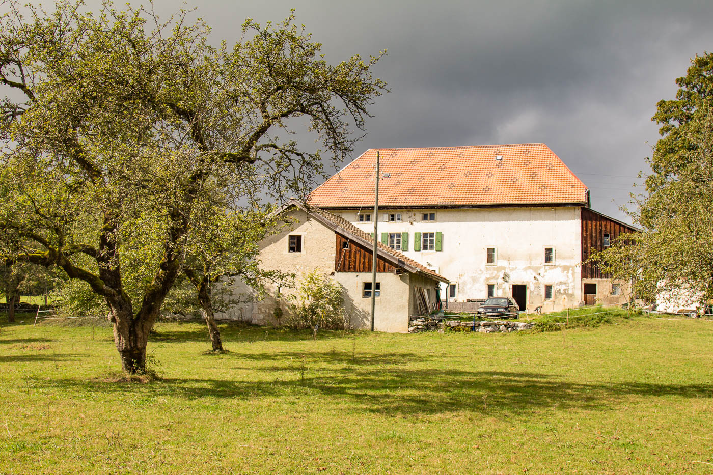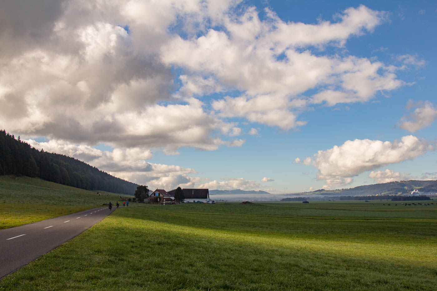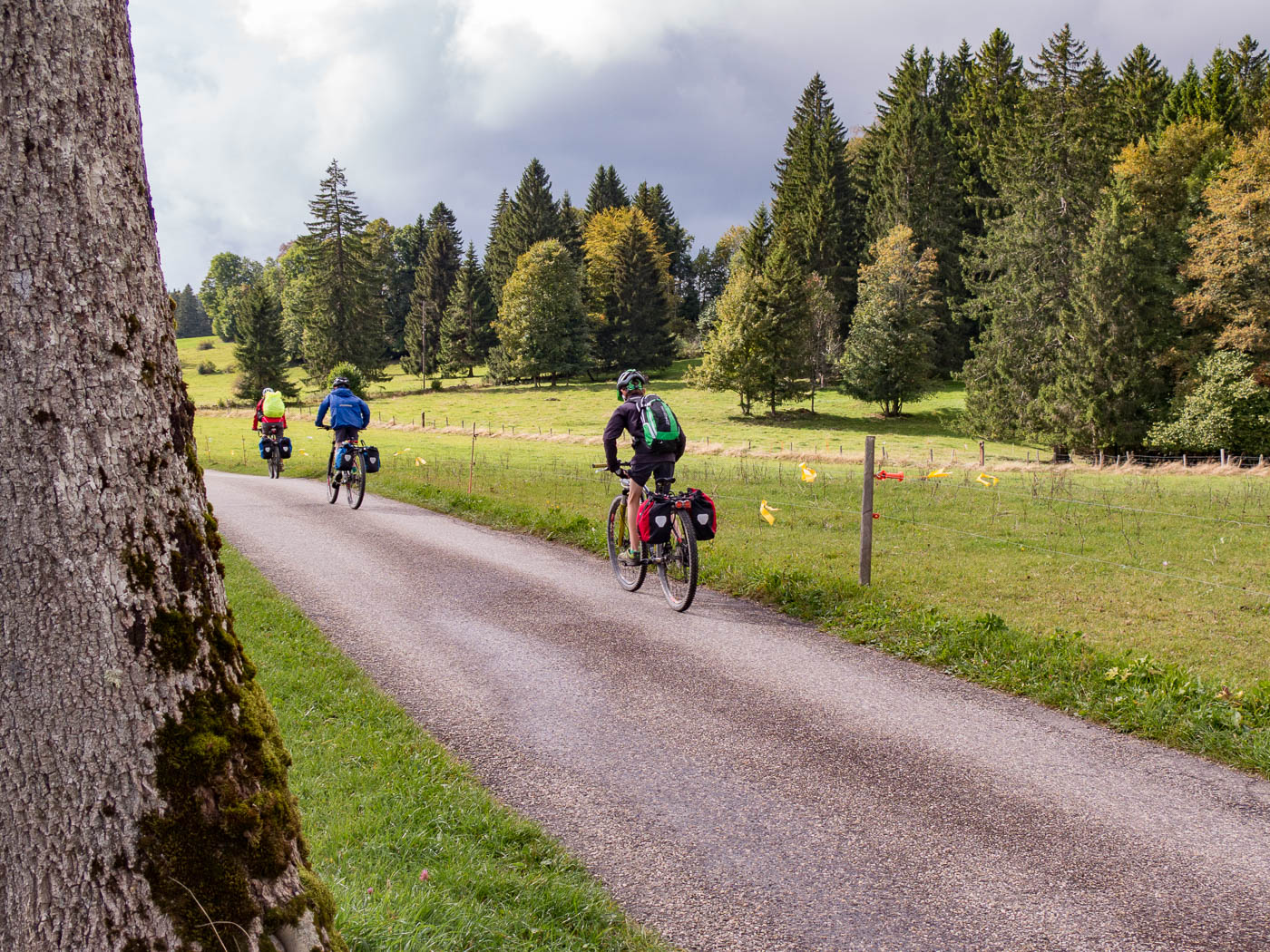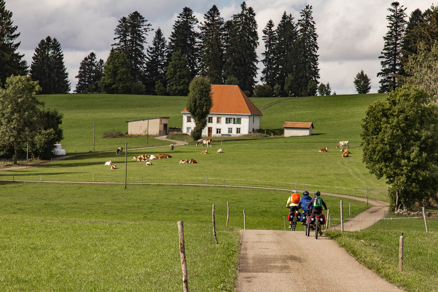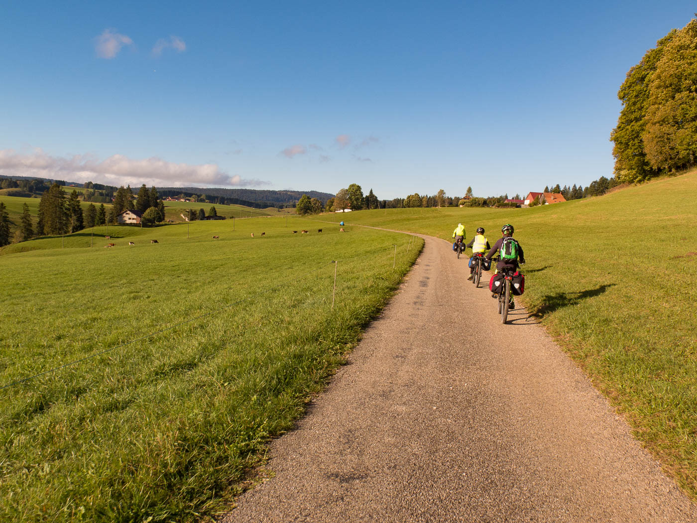 Wunderschöne alte Bäume säumten unseren Weg. Im gewohnten Auf und Ab fuhren wir an einsamen Bauernhöfen, an Kuh- und Pferdeweiden und an Wäldern vorbei. Unterwegs holten wir ein Paar ein, das dieselbe Route zu fahren schien. Bei einer Pause verpassten wir aber den Anschluss wieder. Als es einen namenlosen Pass hochging, hatten wir die beiden aber wieder eingeholt, sind jedoch gleich wieder abgehängt worden, da wir auf der Passhöhe schon wieder pausierten. Auf der Fahrt hinunter nach La Sagne wurde es immer kühler. Im Dorf trafen wir ihn vom Velofahrerpaar wieder an. Wir fuhren nun über die Weiten des Vallée des Ponts. Mit der Sonne war es vorerst vorbei, es wurde empfindlich kalt (salopp ausgedrückt war es arschkalt). Wir zogen an, was wir dabei hatten, trotzdem hatten wir immer noch kalt. Es war wohl unter Null, eine steife Brise wehte uns ins Gesicht.