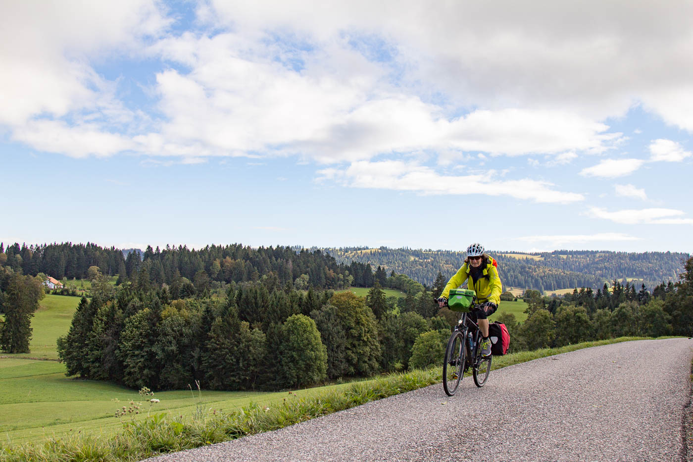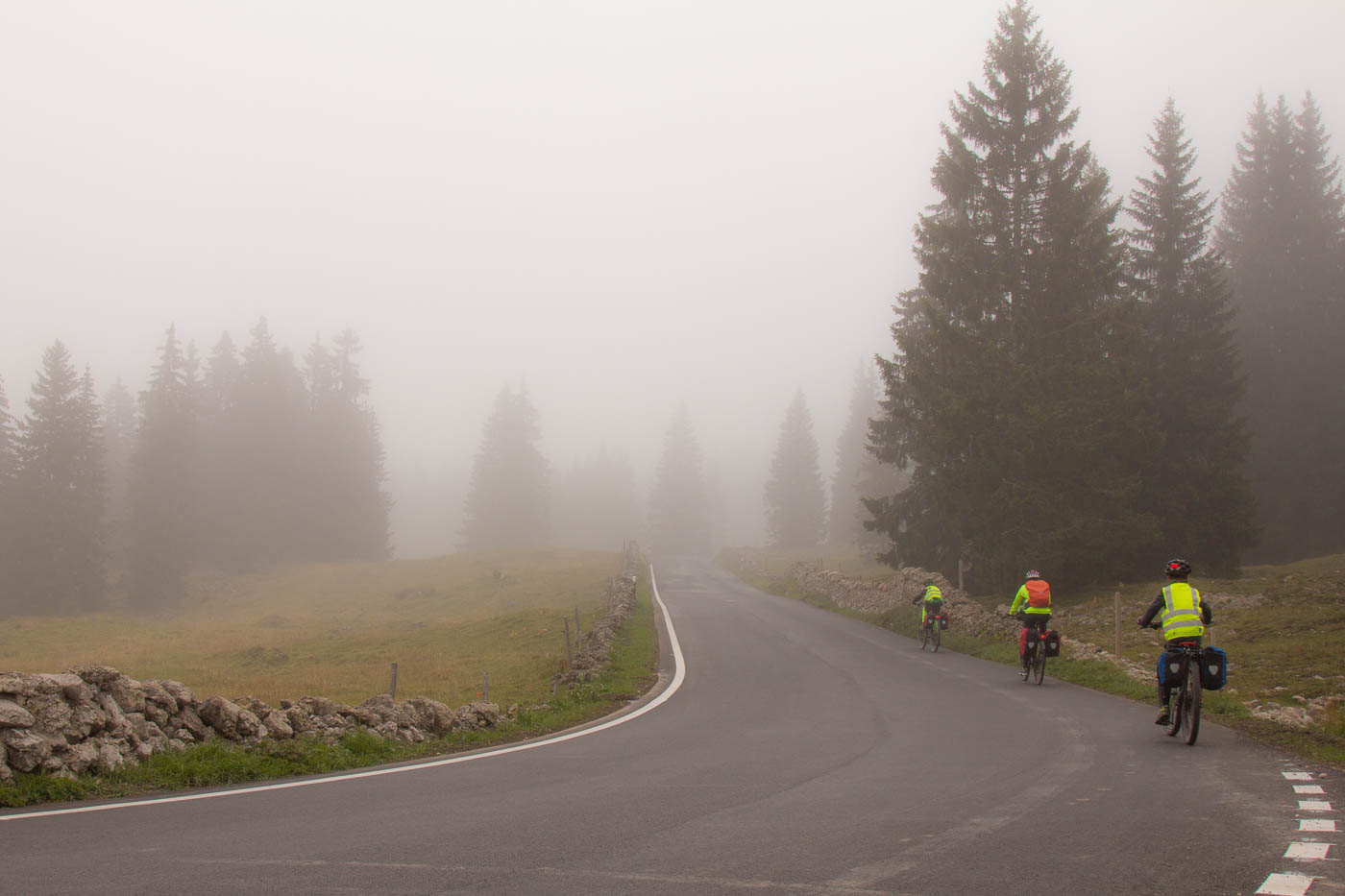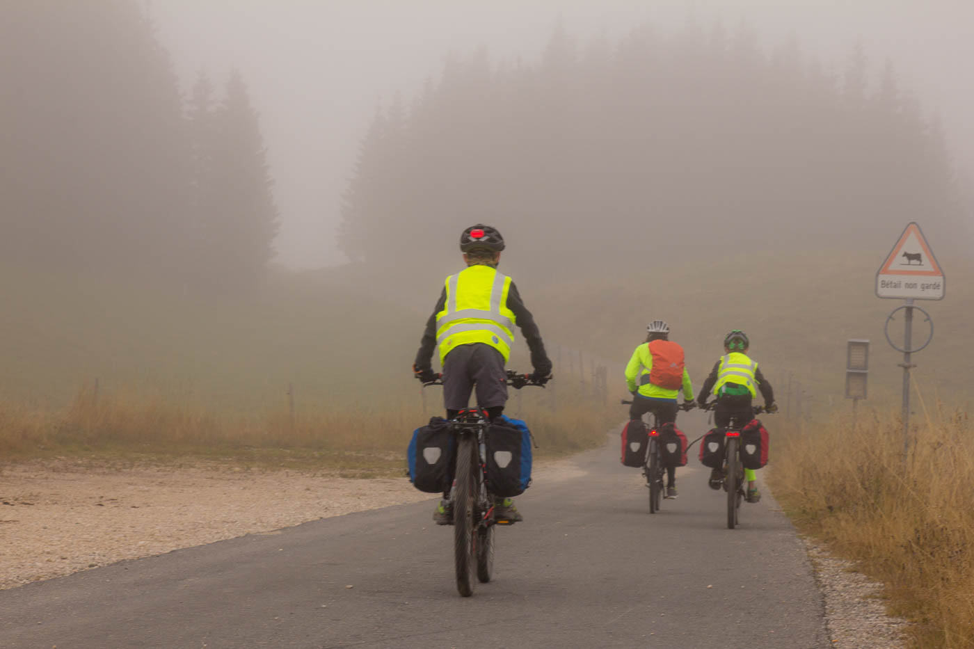Endlich fahren wir auf Nebenstrassen, gemütlich rollen wir durch die Landschaft. Milane ziehen am Himmel ihre Kreise, Kühe grasen, es ist einfach friedlich. Aber der kalte Wind zehrt schon an den Kräften. Das Licht ist irgendwie eigenartig, es erinnert eher an den Frühwinter als an den Frühherbst. Aber was ist heutzutage schon noch normal. L’Auberson, das wir durchfahren, hat schon einen sehr französischen Charakter. Wir biegen ab zum ersten wirklichen Pass, dem Pas de l’Aiguillon, also dem Adlerpass. Sanft steigt die Strasse an, bald radeln wir im Wald. Von l’Auberson her sind es nur knapp 200 Höhenmeter, die wir problemlos schaffen. Bei der Abfahrt passieren wir die Aiguilles des Baulmes, wo wir schon mal klettern waren. Beim Verlassen des Walds eine leise Entäuschung: Stockdicker Nebel! Wir kleiden uns noch besser ein und schalten die Lichter ein. Wer aufmerksam gelesen hat, hat festgestellt, dass wir bis jetzt immer brav der Route 7 auf Asphalt gefolgt waren.
