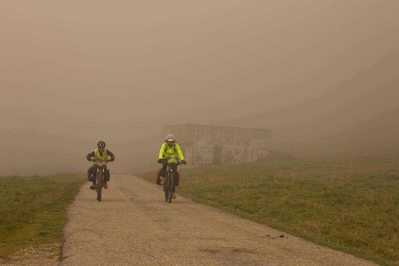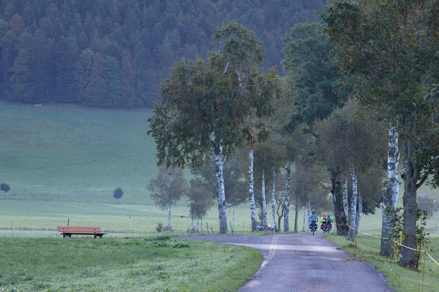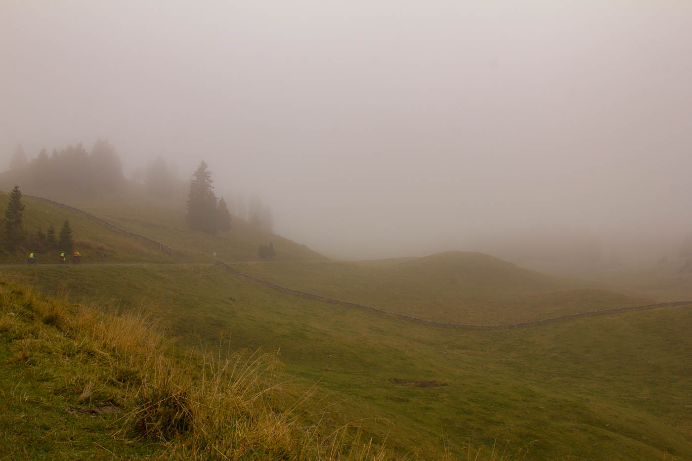 Endlich fahren wir auf Nebenstrassen, gemütlich rollen wir durch die Landschaft. Milane ziehen am Himmel ihre Kreise, Kühe grasen, es ist einfach friedlich. Aber der kalte Wind zehrt schon an den Kräften. Das Licht ist irgendwie eigenartig, es erinnert eher an den Frühwinter als an den Frühherbst. Aber was ist heutzutage schon noch normal. L’Auberson, das wir durchfahren, hat schon einen sehr französischen Charakter. Wir biegen ab zum ersten wirklichen Pass, dem Pas de l’Aiguillon, also dem Adlerpass. Sanft steigt die Strasse an, bald radeln wir im Wald. Von l’Auberson her sind es nur knapp 200 Höhenmeter, die wir problemlos schaffen. Bei der Abfahrt passieren wir die Aiguilles des Baulmes, wo wir schon mal klettern waren. Beim Verlassen des Walds eine leise Entäuschung: Stockdicker Nebel! Wir kleiden uns noch besser ein und schalten die Lichter ein. Wer aufmerksam gelesen hat, hat festgestellt, dass wir bis jetzt immer brav der Route 7 auf Asphalt gefolgt waren.