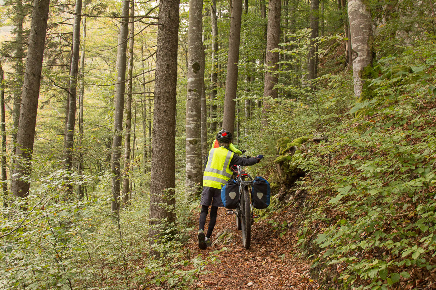 Zeit, dies zu ändern. Wir fahren nun auf der Bikeroute „Jurabike“. Passenderweise liegt an dieser die Alpwirtschaft „Grange Neuve“, wo wir uns einmal mehr aufwärmen können. Zwei ältere Damen am Nebentisch interessieren sich für unsere Unternehmung und sind ganz begeistert, was wir da machen. Mal schauen, ob die Kinder nach dieser Etappe es auch noch sind. Wir traten wieder in die Kälte und fuhren abwärts auf einem Alpweg, was den Kindern schon mal gefiel. Die Route drehte dann abrupt nach links, es wurde ruppig und steil, für uns mit dem Gepäck schon nicht mehr fahrbar. Willkommen bei „Kyburz on tour“. Schon bald mussten wir schieben, der Jüngere kam mit dem schweren Bike und Gepäck an den Anschlag. Ich schob ihm sein Velo hoch und wir legten eine Pause ein, bevor wir die letzten Höhenmeter in Angriff nahmen.
