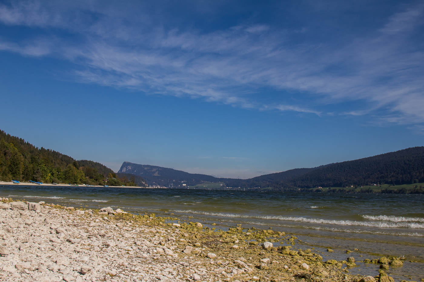 Irgendwann erreichten wir den Juraparc doch noch. Als allererstes wärmten wir uns im Restaurant auf, bevor wir auf den Rundgang gingen. Den Rückweg nach Le Pont nahmen wir nun auf der Strasse unter die Räder. Inzwischen zeigte sich die Sonne am blauen Himmel, so dass wir am See in Le Pont nochmals eine gemütliche Pause einlegten. Entgegen der Planung wählten wir den ganzen Weg der Route 7 entlang. Es hatte zwar wenig Verkehr, aber er nervte trotzdem. Wir waren deshalb froh, dass die Route bei Le Lieu (was für ein phantasievoller Name) die Hauptstrasse verliess und an den See hinunter führte. Ein Strand liess uns nochmals rasten. Die Bise blies immer noch heftig und liess die Wellen tanzen auf dem See, der Dent de Vaulion präsentierte sich nun in seiner ganzen Pracht. Schade, konnten wir ihn nicht besteigen, kommt aber auf unsere Ideenliste (inzwischen waren wir dort oben: Hoch über dem Vallée de Joux).