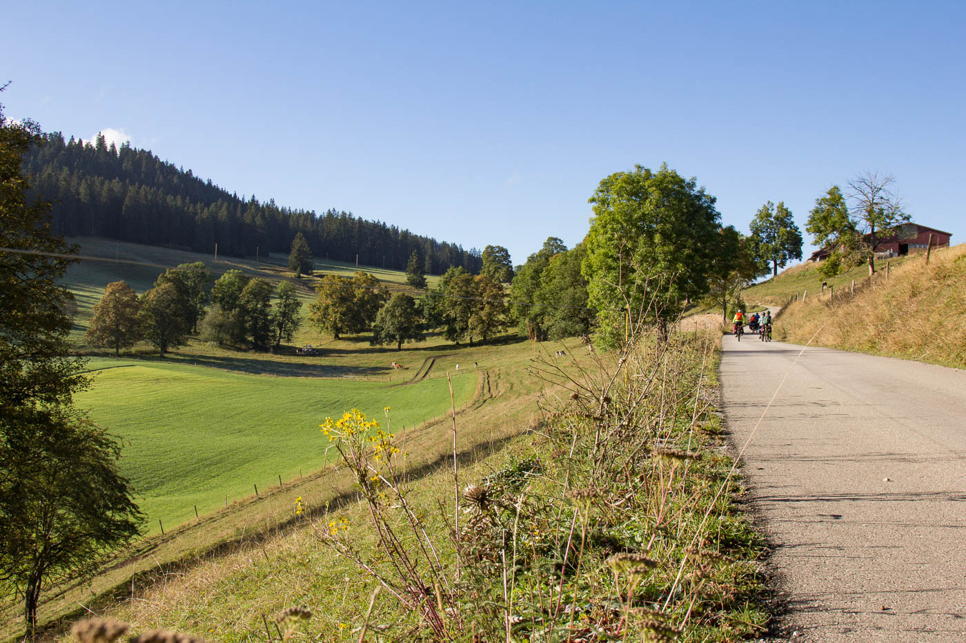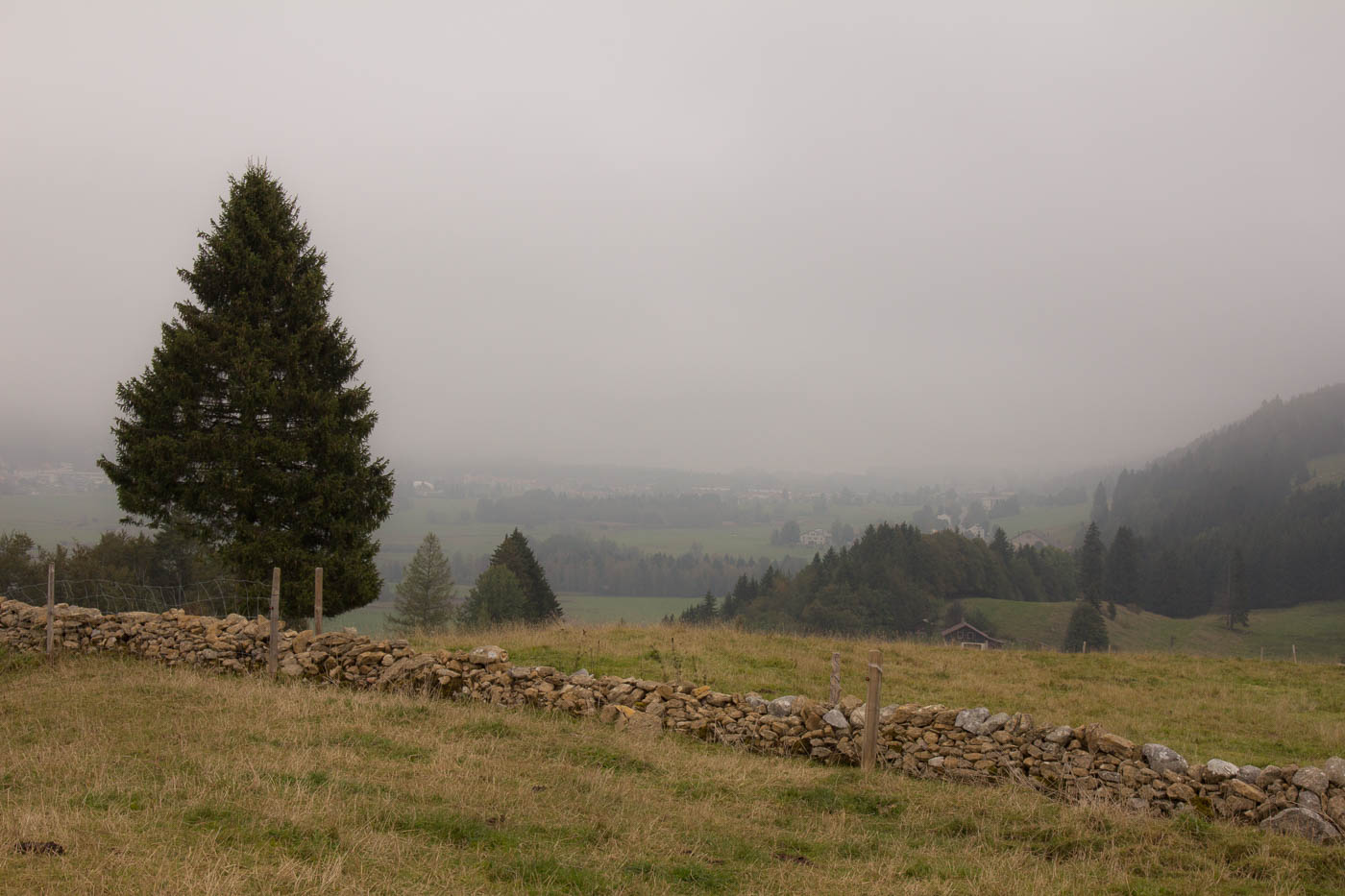 Die letzte Jura-Etappe, dann werden wir den Jura von Basel bis an den Genferse durchquert haben! Leider war der Himmel wieder wolkenverhangen, aber immerhin windete es nicht mehr wie tags zuvor. Zudem hatten wir sofort warm, mussten wir doch den Col du Marchairuz erklimmen. Die Strasse war steil, ab und an legten wir einen kurzen Halt ein. Die Wolkendecke kam immer näher, bis wir mittendrin waren: Nebel. Endlich konnten wir in das Combe des Amburnex einbiegen. Das Tälchen wäre wohl wunderschön, leider verbarg der Nebel die Schönheit vor unseren Augen, so dass wir diese nur erahnen konnten. Aber wir sahen mehr Tiere als Menschen, was doch schon sehr schön war. Ein Fuchs eilte vor uns über die Strasse, ein anderes Mal schlug sich einer in Büsche, er war wohl überrascht über unsere Anwesenheit.