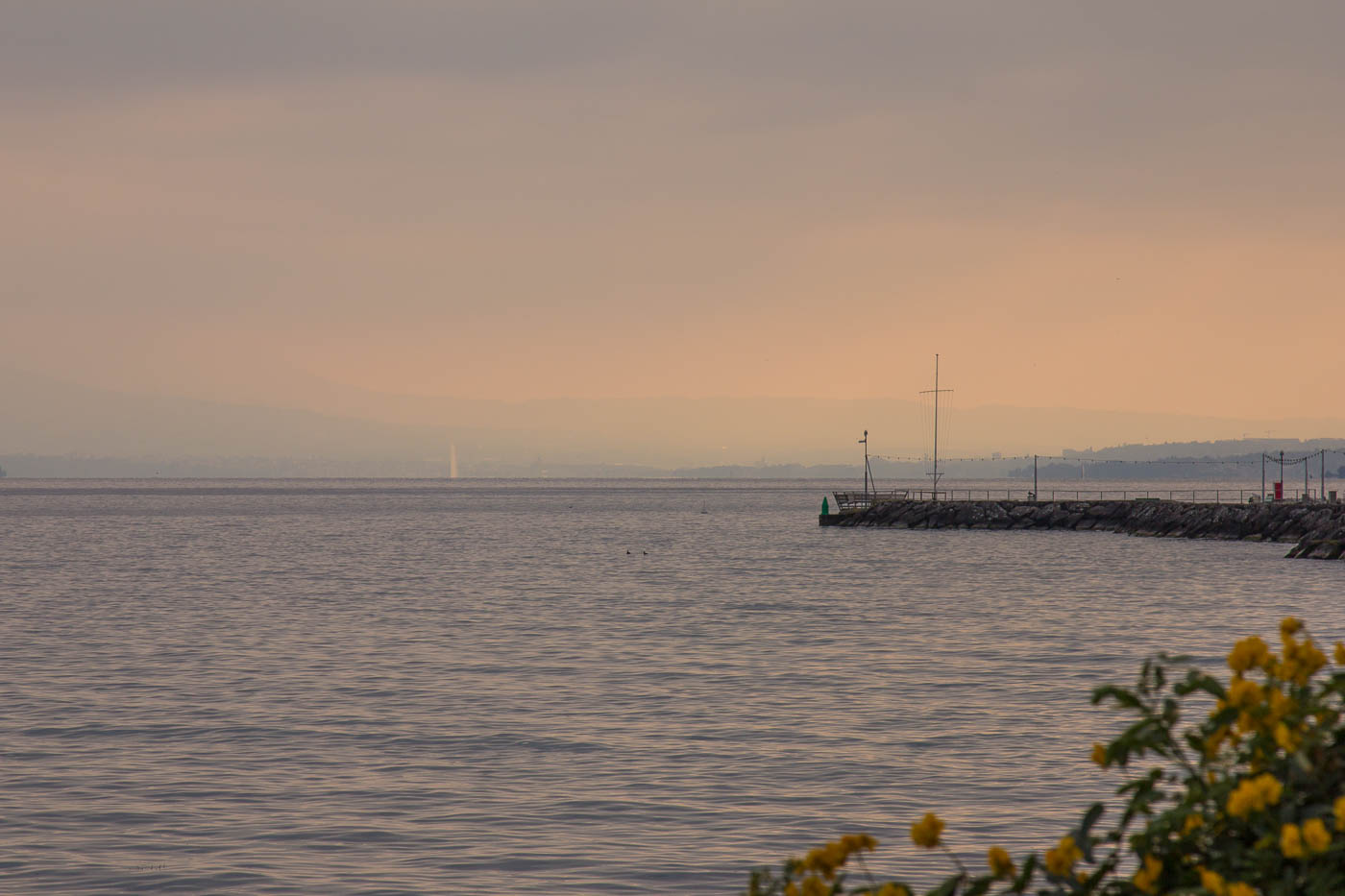 Nur abwärts fahren auf Asphalt ist zwar nicht so anstrengend, aber bei diesen Temperaturen hat man schnell kalt. Wir zogen an, was wir dabei hatten, trotzdem stieg das Verlangen nach einem warmen Ort. Diesen hofften wir in Bassins zu finden. Aber das einzige Restaurant vor Ort war geschlossen. Für immer. So fuhren wir halt abwärts in den nächsten Ort, Le Muids, wo es endlich eine Möglichkeit gab. Als unsere klammen Finger wieder einigermassen greifen konnten, setzten wir unsere Abfahrt fort, schliesslich mussten fast 1000 Höhenmeter vom Pass her vernichtet werden. Wir hatten nun den Jura endgültig verlassen und waren im Mittelland angelangt. In Nyon kam dann der Schock: Waren wir vorher praktisch alleine unterwegs, waren wir nun vom ganzen Verkehr fast überfordert. Wir retteten uns in die Fussgängerzone, um etwas zu verschnaufen. Das nächste Ziel war natürlich der See, wo wir die Durchquerung symbolisch abschlossen. Und da standen wir nun, blickten nach Frankreich rüber, so gut das bei dem Nebel ging. Und waren glücklich und stolz, es geschafft zu haben.