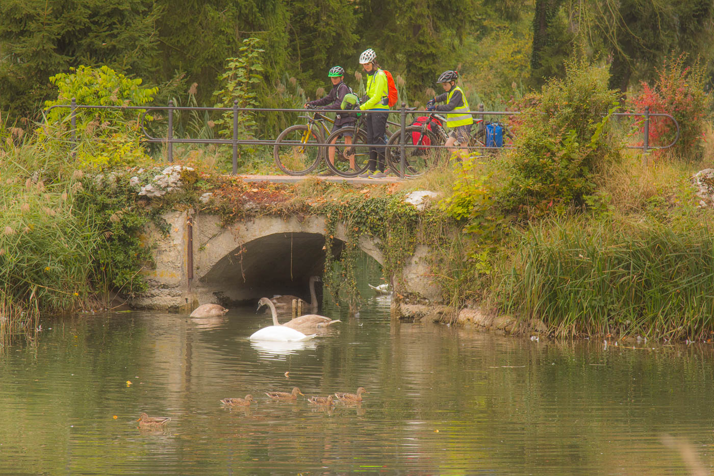 Eigentlich wollten wir unterwegs den Dent de Vaulion besteigen. Aber wie am Tag zuvor hatte es Hochnebel und es war wegen der Bise bitterkalt. Wir starteten natürlich trotzdem in Vallorbe, und schon bald verschluckte uns der Wald im Aufstieg nach Le Pont. Ich hatte gehofft, dass er uns vor der heissen Sonne schützt, nun hält er den giftigen Wind ab. Sei’s drum. Die Familie war unterschiedlich fit, entsprechend fuhren wir auch nicht zusammen, warteten aber immer wieder. Das Ziel Dent de Vaulion tauschten wir nun gegen den Juraparc. Nach der Abfahrt nach Le Pont hiess das nochmals einen Aufstieg zum Col du Mont d’Orzeires. Wegen dem vielen Verkehr wählten wir den nächstbesten Wanderweg. Das war nun nicht so eine gute Idee. Zu Beginn war es zwar eine Asphaltstrasse, dann eine Waldstrasse, die zum Weg wurde, dann ein Wegweiser, der hinunter zeigte. Über eine Treppe und über Wurzeln. Danach wieder eher waagrecht weiter, aber nicht minder herausfordernd. Also mit Gepäck am Rad nicht empfehlenswert.