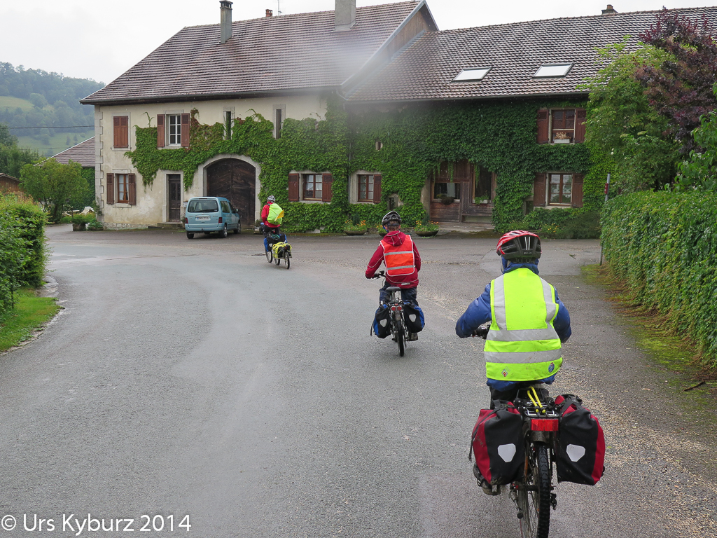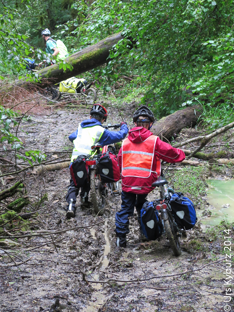 Irgendwann kam ein Gatter und die Asphaltstrasse ging in einen Feldweg über. Dieser wurde immer morastiger, und Pferde versperrten uns den Weg. Zum Glück gingen sie freiwillig zur Seite. Im Wald wurde es noch sumpfiger, bald konnten wir nicht mehr fahren, sondern mussten unsere Räder schieben. Und dann lag da auch noch ein Baum quer über den Weg. Den konnten wir zum Glück noch unterqueren, der nächste lag aber satt am Boden. Also Komposition auflösen und jedes Rad einzeln darüber hinweg tragen. Wir standen buchstäblich vor Dreck, die Räder waren völlig mit Schlamm zugekleistert. Wäre ich vor ein paar Tagen noch als Tourenleiter abgesetzt worden, wäre ich jetzt wohl gelyncht worden. Nicht so meine Familie, die fand das lustig. Ein kleiner Hoffnungsschimmer kam auf, als andere Wege einmündeten und der Zustand insgesamt besser zu werden schien. Auf einem Holzerplatz stand ein ganz normales Auto, und insgeheim waren wir froh, dieses zu sehen, denn mit dem Helikopter wurde es sicher nicht hier abgesetzt. Tatsächlich, die Strasse wurde immer besser, wir konnten wieder den Blick auf den Doubs geniessen. Das Wetter war noch nicht besser geworden, es regnete immer noch. Aber was solls, nass und dreckig wie wir waren, war uns dieses bisschen Feuchtigkeit egal.