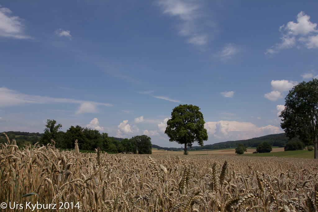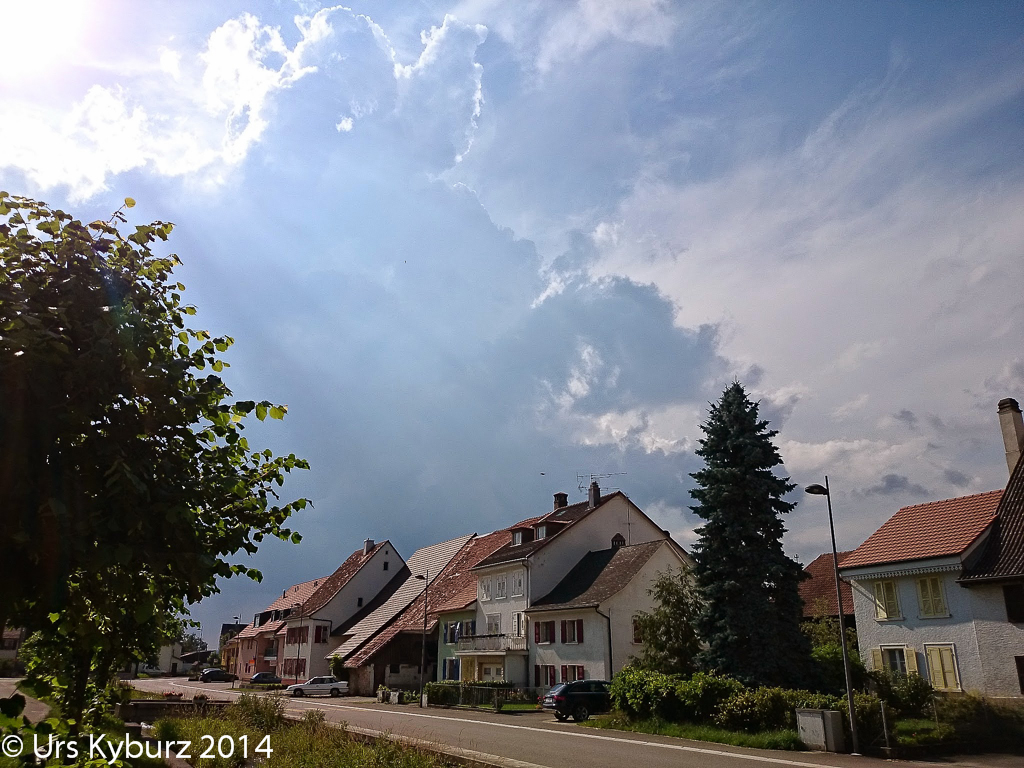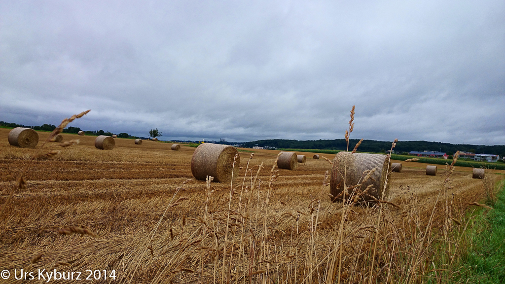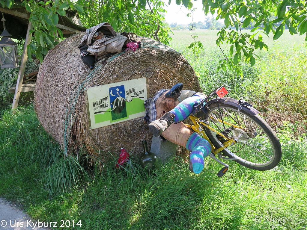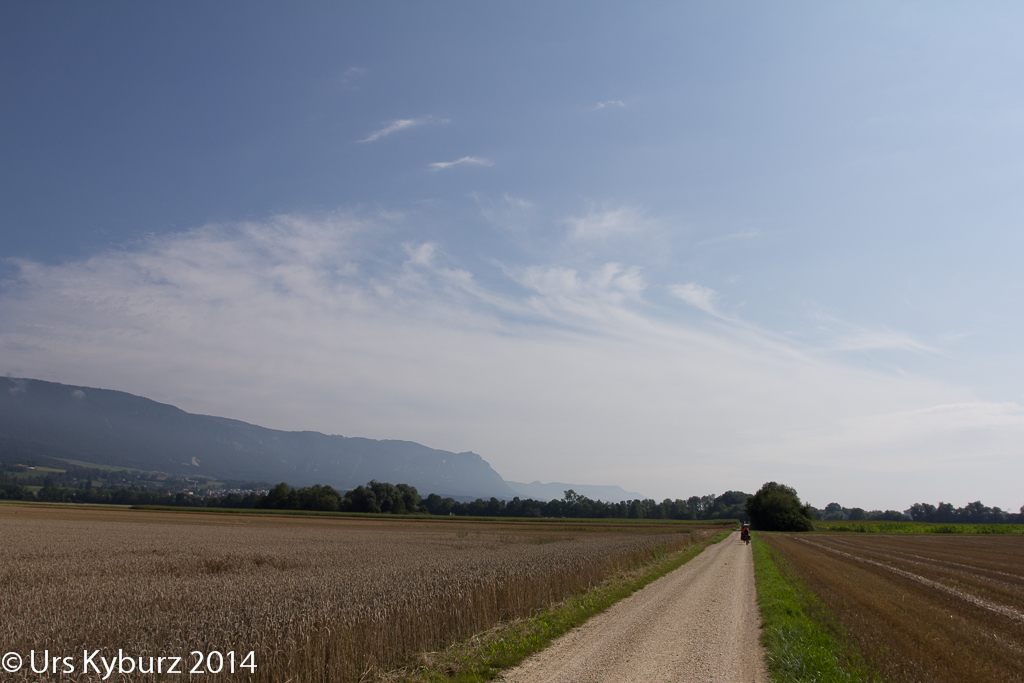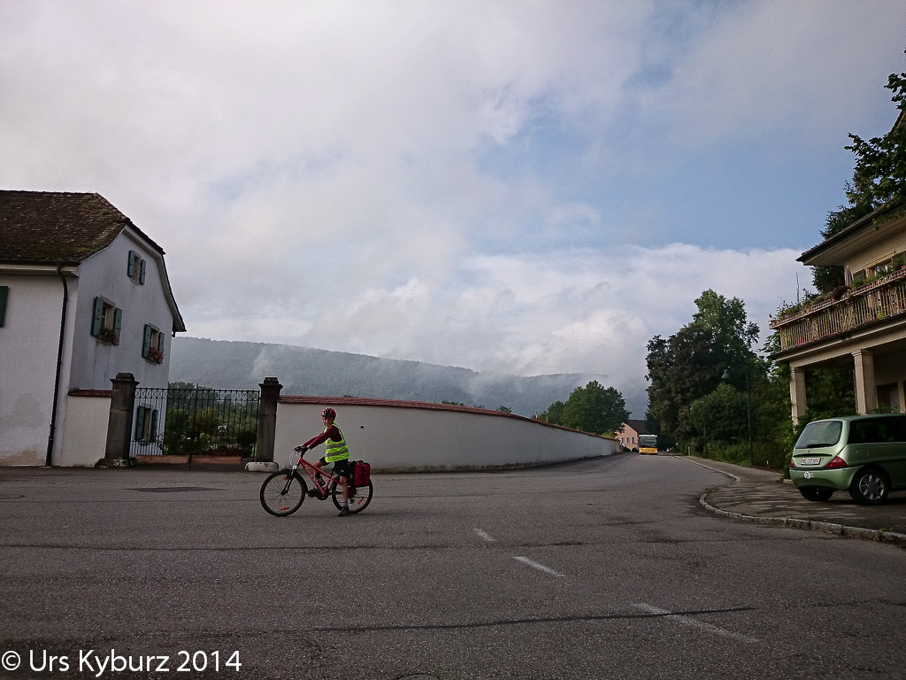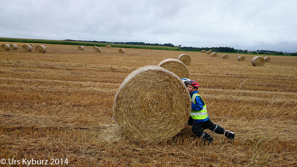 Wie üblich war die Anreise mit der SBB nervenaufreibend. Was für ein Zug kommt? Hat es nur Zweierabteile für die Fahrräder? Sind die noch frei? Wohin mit dem Anhänger? Letztlich ging aber alles gut, auch Dank der Hilfe einer freundlichen Dame. In Basel war das Wetter dann auch nicht besser als zu Hause. Wir packten uns also regensicher ein und fuhren los. Wir folgten den Wegweisern der Route 7. Von der Stadt gelangten wir in die Agglomeration, das zum Velofahren so langweilig ist wie es tönt. „In der Natur unterwegs“ waren wir definitiv noch nicht. Wie waren wir froh, als wir nach Therwil endlich über offenes Land fuhren. Am Himmel rüttelte ein Turmfalke, riesige Strohballen warteten darauf, ins Trockene gebracht zu werden.