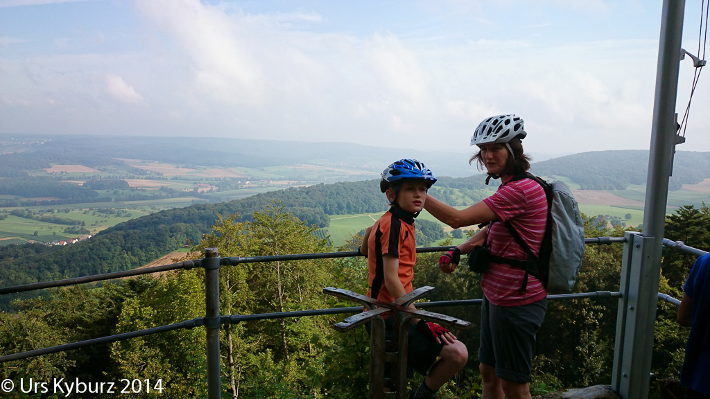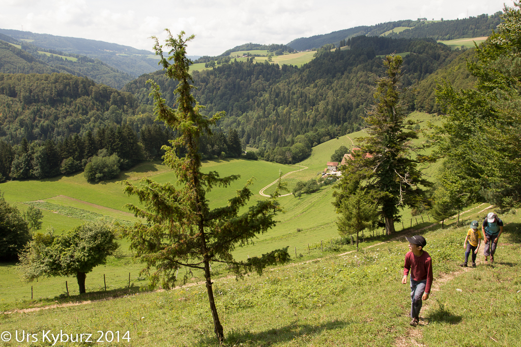 Nach einem weiteren Anstieg erreichten wir die Löwenburg, ein biologischer Agrarbetrieb der Christoph-Merian-Stiftung. Die Gebäude aus dem Mittelalter wirken auch heute noch imposant. Nach der Löwenburg stieg der Weg nochmals an, bevor es eben weiter ging. Und nach meinem Plan müsste jetzt ein gestrichelter Wanderweg kommen, das heisst, es ist wohl mehr ein Pfad. So war es denn auch. Aber runter kommen wir bestimmt irgendwie, dachte ich mir. So war es auch, es war ein handtuchbreiter Pfad, aber fahrbar, auch mit Anhänger. Nur die Bremsklötze werde ich wohl nach der Tourenwoche austauschen müssen. Von einer normalen Velogruppe wäre ich spätestens jetzt als Tourenleiter abgesetzt worden. Nicht jedoch von den Kindern. Die fanden, es hätte sich gelohnt. Noch einmal folgte ein Aufstieg, was die Kinder nicht gerade mit Freudengeschrei untermalten. Aber ich fand es immer noch besser, als auf der langweiligen und gefährlichen Hauptstrasse zu fahren, sie dann doch auch.