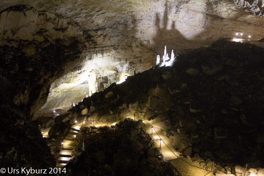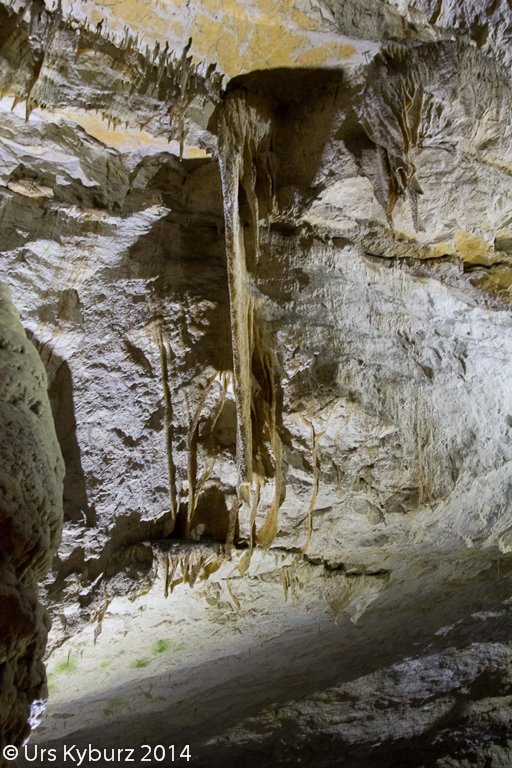Sie waren scheinbar so beeindruckt, dass sie allen einen Namen gaben. Da stehen „Schwiegermutter und Schwiegertochter“ Rücken an Rücken und haben sich scheinbar nichts zu sagen. Um auf diese Bezeichnung zu kommen, braucht es schon einen Hinweis der Führerin, aber es ist dann sofort klar, welches die Schwiegermutter ist… Weiter kamen wir beim „Orchester“ vorbei, einer Ansammlung von Stalagmiten mit dem Dirigenten. Des weiteren kamen wir an zwei „Ehepaaren“ vorbei, eines bei der Hochzeit nah zusammen, eines nach zwanzig Ehejahren sehr distanziert. Die Entdecker hatten scheinbar Spass daran, die Stalagmiten zu benennen. Der „Dom“ ist der grösste Tropfstein der Schweiz und 15 Meter hoch. Und Napoleon soll seinen Mantel hier auch vergessen haben. Jedenfalls ist die Höhle faszinierend und wunderschön anzuschauen. Ein Besuch lohnt sich auf jeden Fall, wenn es einen mal in die Gegend verschlägt.