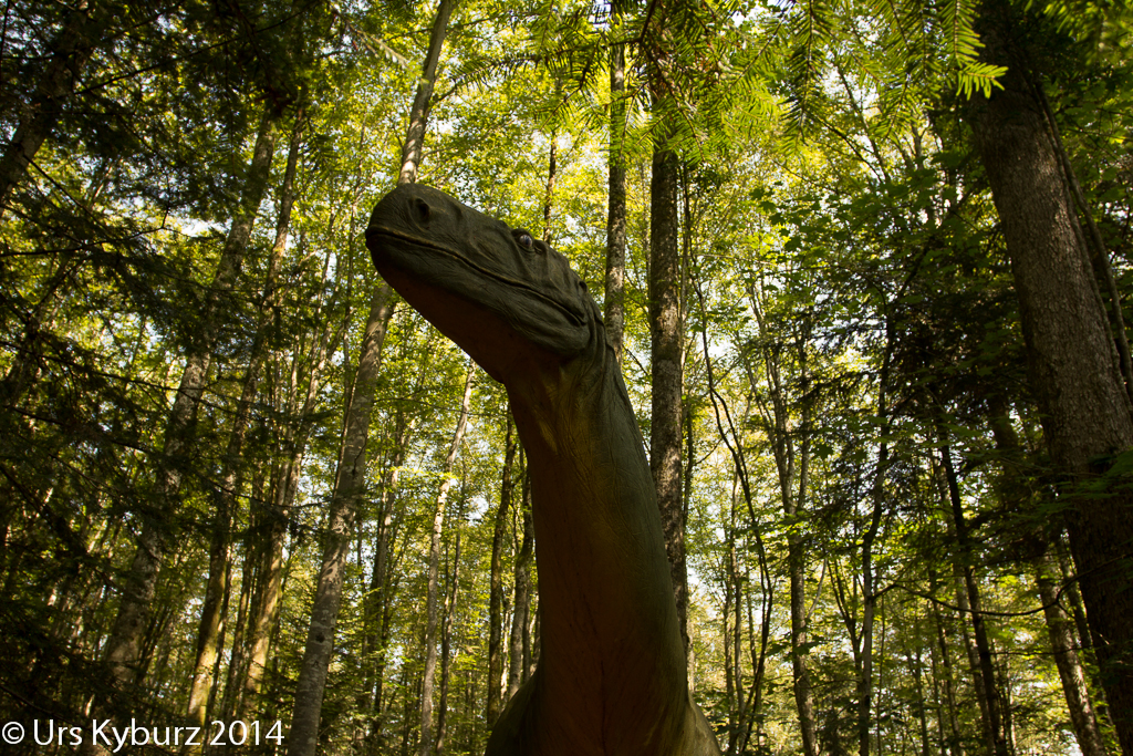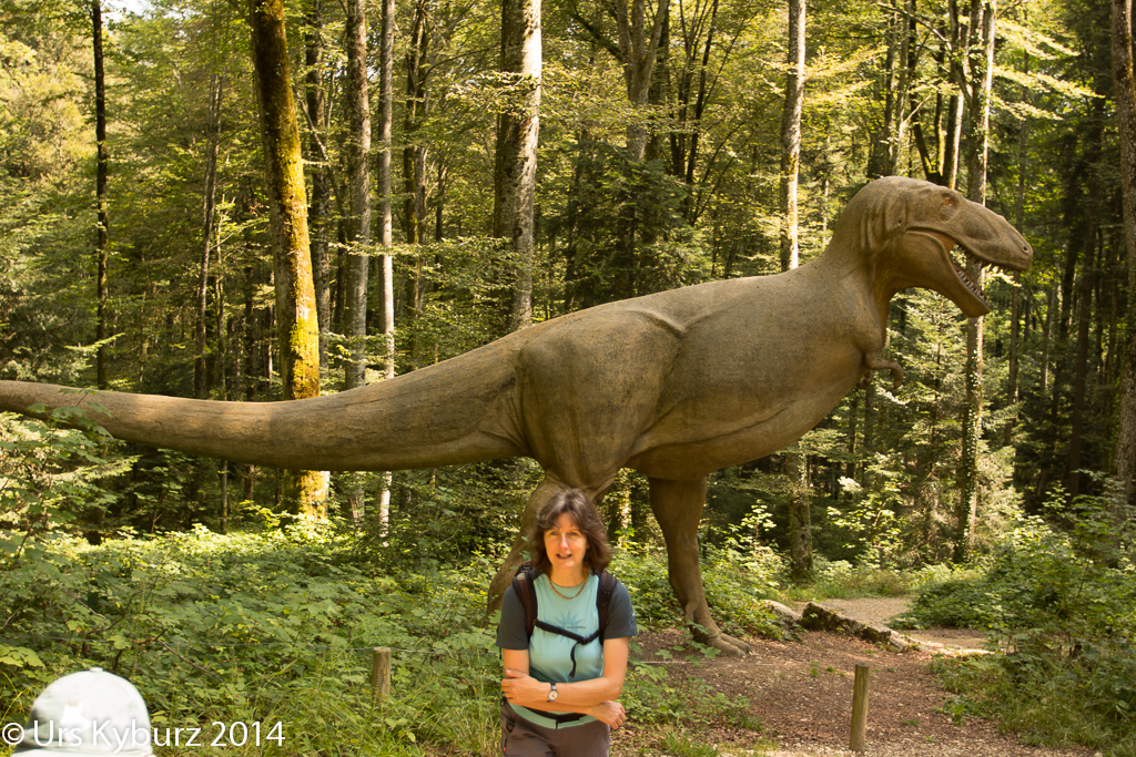 Kaum wieder draussen am Tageslicht, mussten wir sofort Jacke und Pullover ausziehen. Nun begaben wir uns auf den zwei Kilometer langen Rundgang durch den Préhisto-Park. Da lauerten an allen Ecken und Enden urtümliche Monster. Insgesamt 45 Nachbildungen in Lebensgrössen von Sauriern und anderen ausgestorbenen Lebewesen bevölkern den Park und lassen einen staunen. Ein Aussichtsturm gewährte uns einen Blick über die Wipfel hinweg ins enge Tal des Doubs, dem Fluss, der uns die nächsten Tage begleiten soll. Wer mal in diesem Zipfel der Schweiz unterwegs ist, sollte jedenfalls einen Abstecher in die Grotte und den Park machen.