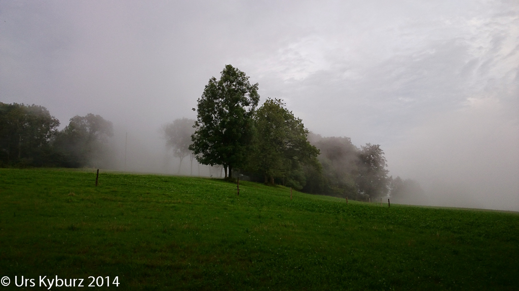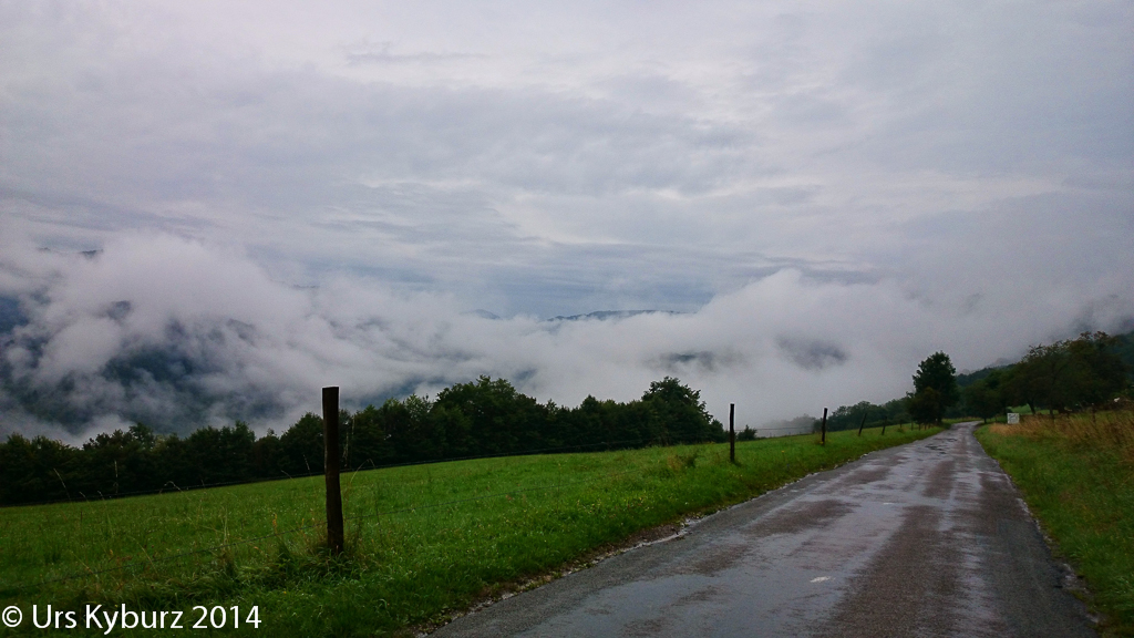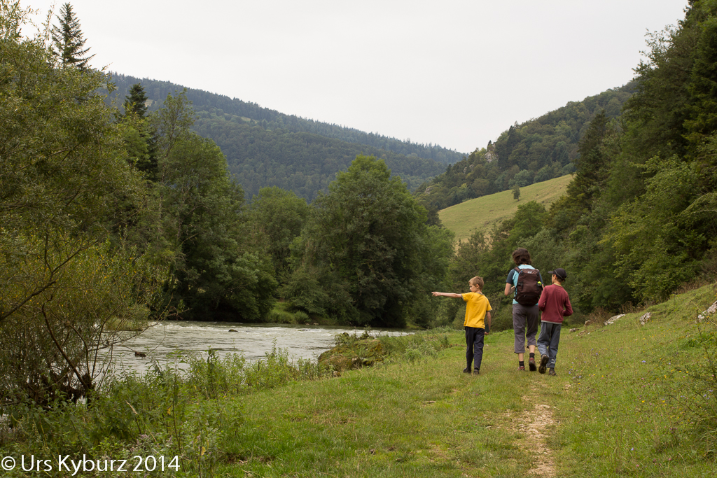 Bei der Abfahrt regnet es, entgegen der Vorhersage. Unter uns lag das Tal des Doubs, Nebel waberten über dem Fluss, Ruhe umgab uns. Kehre um Kehre fuhren wir hinunter, vorbei an extensiv bewirtschafteten Weiden, die mit Hecken durchsetzt sind und so dem Grünspecht einen idealen Lebensraum bieten, von dem wir gleich drei sehen und ihr charakteristisches Krächzen hören, das einem höhnischen Gelächter gleicht. Nach ein paar Kurven erreichten wir das Dörfchen Vaufrey. Die offizielle Route verläuft auf der Landstrasse, wir wählten wieder Kyburz spezial. Nach dem Überqueren der Brücke bogen wir links in ein Strässchen ein. Wir konnten so dem Lauf des Doubs entlang fahren, ohne von Autos gestört zu werden. Dass wir noch froh sein würden, eine dieser Blechkarrossen zu sehen, wussten wir noch nicht. Immer leicht auf und ab, war es ein Vergnügen, hier zu fahren, wenn auch gegen die Flussrichtung, was für uns ungewohnt war.