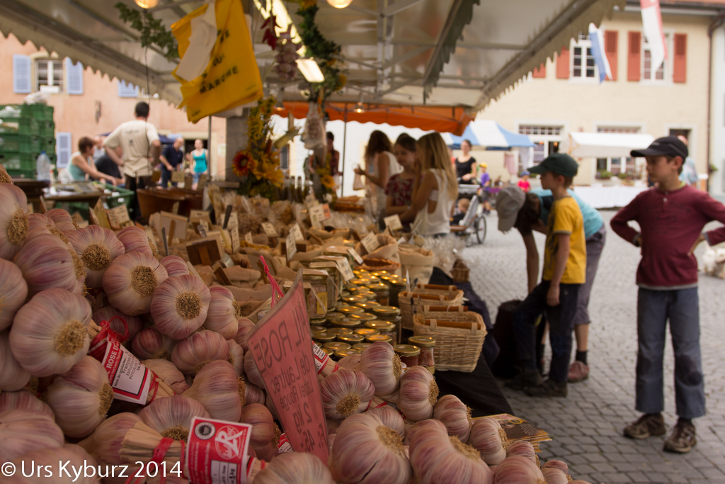 Heute war noch einmal schönes Wetter angesagt, wir wollten deshalb dem Doubs entlang wandern und über Montenol zurück nach St-Ursanne. Beim Start war es noch relativ kühl, der Himmel wolkenverhangen. Der Doubs hat sich hier tief ins Gestein gefressen, die Krete 500 Meter weiter oben lässt erahnen, wo die Freiberge liegen, der Hang heisst denn auch Haute Côte. Just als der Weg anstieg und sich vom Fluss entfernte, kam die Sonne zum Vorschein. Entsprechend heiss war denn auch der Aufstieg, aber wir waren wieder relativ einsam unterwegs, was uns natürlich überhaupt nicht störte. War der Aufstieg bei Châtillon vorbei noch an der prallen Sonne, verlief der Abstieg nach Montenol im Wald und entsprechend in der Kühle. Wir folgten dem Wegweiser nach St-Ursanne durch Kuhweiden und durch Wälder. Im Städtchen war ein Markt, und die Autos wurden endlich dorthin verbannt, wo sie hingehören, nämlich ausserhalb der Stadtmauern. Leider nur temporär. Wir genossen jedenfalls die Ambiance.