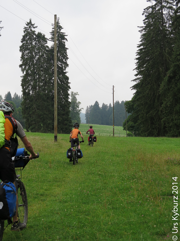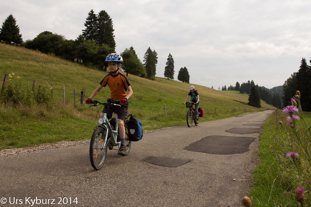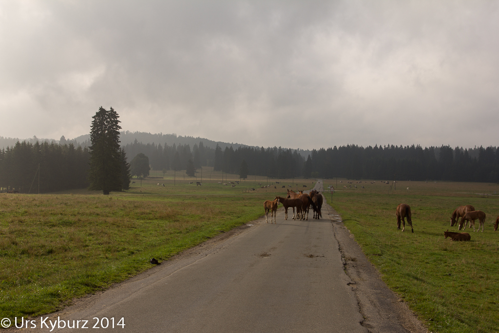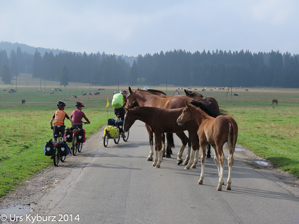 Zwei Tage regnete es in den Freibergen, langweilig wurde es uns trotzdem nicht. Im Hallenbad konnten die Kinder den letzten Dreck mal abwaschen, ich meine Bremsen am Bike reparieren lassen. Am zweiten Tag fuhren wir nach La-Chaux-de-Fonds ins Uhrenmuseum, ein lohnender Besuch. Nun sollte es aber endlich wieder einen regenfreien Tag geben, so dass wir unsere Tour fortsetzen konnten. Tatsächlich sandte die Sonne einen ersten scheuen Strahl zu uns. Wieder voll bepackt fuhren wir los, doch schon bald kamen wir in einen Freiberger Stau: Eine Gruppe Pferde stand mitten auf der Strasse, so dass wir aussen rum über die Weide fahren mussten. Ich musste schmunzeln, als ich an die Autofahrer am Gubrist dachte… In ständigem Auf und Ab, wie es für die Freiberge typisch ist, kamen wir vorwärts, die Sonne hielt sich aber bedeckt. Wir kamen an Orten vorbei mit so schönen Namen wie Les Cerlatez oder La Chaux-des-Breuleux, von denen ich nicht weiss, was sie bedeuten, aber an kulinarische Höhenflüge erinnern.