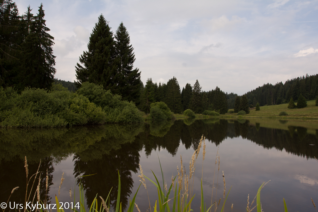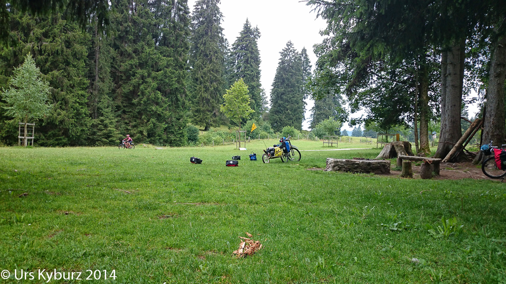 Eine kleine Asphaltstrasse führte uns durch die Gegend, bald jedoch wich diese einem Feldweg, unserem bevorzugten Untergrund. Gemütlich radelten wir durch die wunderschöne Landschaft. Gesteigert wurde der Eindruck durch den Torfsee, der am Weg lag. Die Sonne schickte sich an, durch die Wolken zu brechen, die mächtigen Tannen spiegelten sich im dunkeln See. Wir fuhren weiter Richtung Pré Petitjean, legten aber vorher noch eine Rast ein an einem schönen Picknickplatz. Gegen Montfaucon stieg die Strasse ziemlich an, aber verglichen mit den bisherigen Steigungen war das zu vernachlässigen. Genau, Montfaucon. Kurz vor den Ferien schauten die Kinder ein Fotoalbum von mir an. Von Ferien in Montfaucon. Vor über dreissig Jahren. Kinder, wie die Zeit vergeht.
