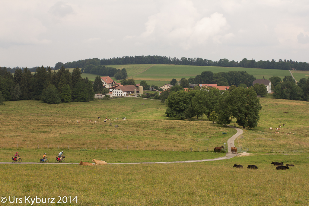 Auf der Passhöhe zweigte ein Waldweg rechts ab, so dass wir endlich die Strasse verlassen konnten. Einsam fuhren wir über den Höhenzug der Challhöchi und hinunter nach Kleinlützel. Dort diskutierten wir, ob wir meiner Variante folgen sollen oder der offiziellen Route. Angesichts der Steigung meiner Variante folgten wir brav der offiziellen Ausschilderung auf der Hauptstrasse. Schon wieder. Bei der Abzweigung nach Roggenburg hatten wir endgültig genug davon und fuhren dort hoch, um weiter meiner Variante zu folgen. Die Sicht von oben erweitert halt den Horizont schon enorm, und sei es nur der visuelle. Wo das Auge auch hinblickte, man sah nur bewaldete Hügelzüge und Felder, kaum Siedlungen. Und auf der anderen Hangseite war bereits Frankreich. So nah ist manchmal das Ausland, und trotzdem haben viele Angst davor.