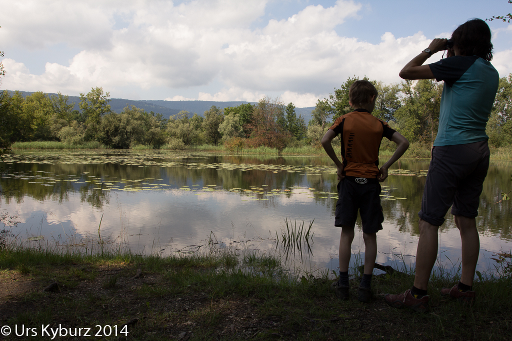 In Biel suchten wir nun nach den Wegweisern der Route 8, der Aareroute, und fühlten uns fast ein bisschen heimisch, radelten wir hier doch vor bald drei Jahren schon mal hier durch. In der Häfti am alten Aarelauf wollten wir wieder auf den Beobachtungsturm, aber der Weg dorthin war überschwemmt. So schauten wir halt vom Boden aus und sahen prompt einen Eisvogel. Wenig später fuhren wir zu unserer Unterkunft auf der anderen Aareseite, wo wir wieder im Stroh übernachteten. Am Abend unternahmen wir einen Spaziergang am Meienriedloch, einem weiteren alten Aarelauf, der bei der Juragewässerkorrektion abgeschnitten wurde vom Fluss. Wir freuten uns über die Beobachtung von Silberreihern, Rehen und eines Wanderfalken, allerdings freuten sich auch die Stechmücken, die regelrecht über uns herfielen.