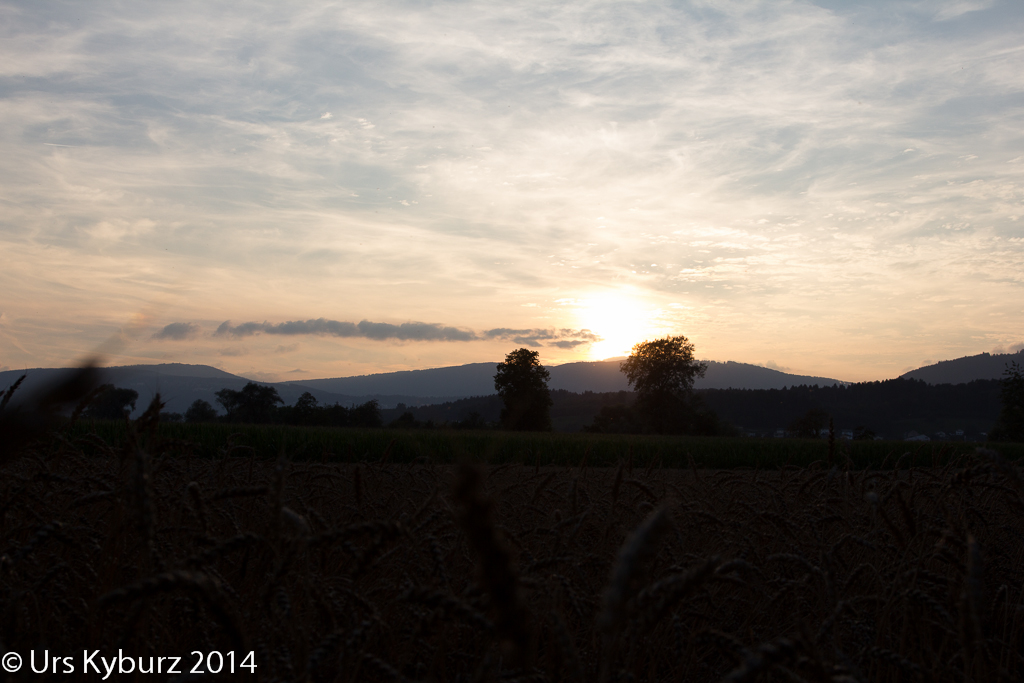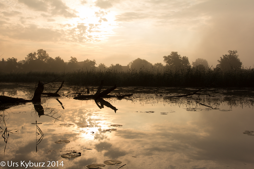 Unser letzter Tag. Ich stehe am Morgen relativ früh auf und spaziere wieder zum Meienriedloch, wo eine wunderschöne Morgenstimmung herrscht. Nach dem reichhaltigen Bauernfrühstück packten wir zusammen und brachen auf nach Büren an der Aare. Über die Holzbrücke radelten wir auf die offizielle Route zurück. Wir durchquerten die Grenchner Witi, die auch als Hasenkammer der Schweiz bekannt ist. Aber leider ist auch hier seit den siebziger Jahren ein drastischer Bestandesrückgang zu verzeichnen. Weite dominierte hier die Landschaft am Fusse des Juras, den wir gestern verlassen hatten. Allmählich müssten wir Störche sichten, denn wir näherten uns Altreu, der bekannten Storchenstation. Unser Jüngster entdeckte zuerst einen, bald sahen wir über ein Dutzend auf einem Feld.