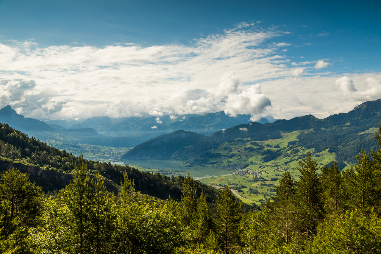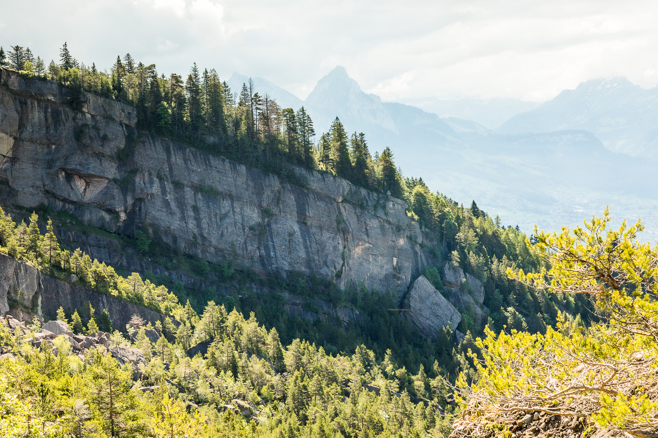 Steil geht es aufwärts, der Weg ist nach den vorangegangenen Regenfällen dreckig und schmierig. Nach zwei Stunden wandern ändert sich die Szenerie, der bisherige Laubwald weicht einem lichten Föhrenwald. Endlich sehen wir auch mal etwas von der weiteren Umgebung, und das lässt sich wahrlich sehen. Aber das ist ja nichts neues in der Schweiz. Wir sind nun mitten im Bergsturzgebiet, man sieht die Narben immer noch und wird sie immer sehen. Wir sind beeindruckt, was müssen da für Massen abgegangen sein! Der Weg ist ebenso wild wie die Umgebung. Zwischendurch wähnen wir uns auf einem Vulkan, so festgebacken ist der Sand, auf dem wir uns bewegen. Und dann finden wir doch noch einen: Ein Frauenschuh, der blüht. Müsste dann nicht noch irgendwo ein Aschenputtel sein?