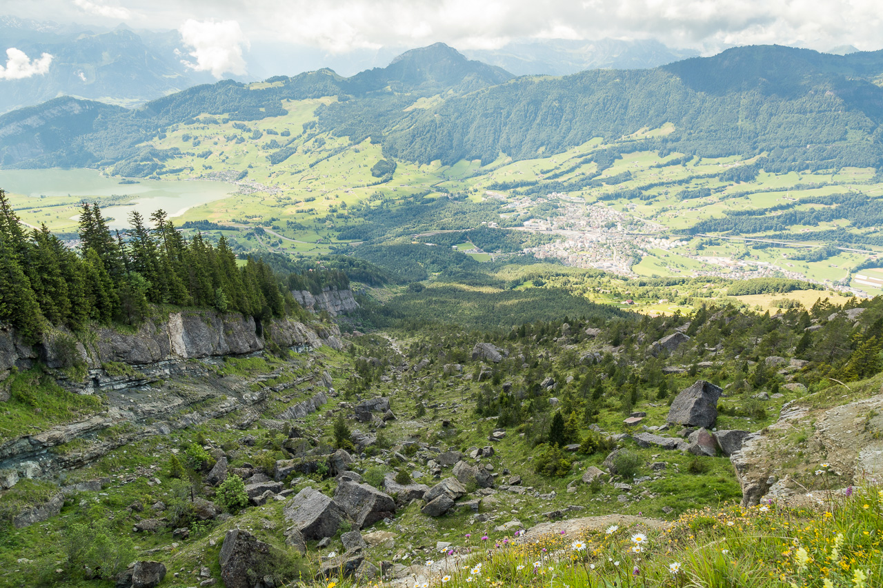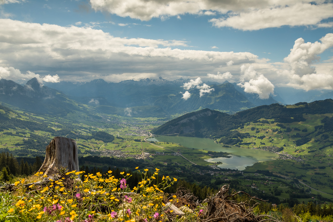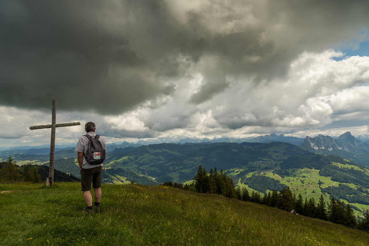 Was für ein Kontrast, als wir beim Kreuz eintreffen, das bereits von Goldau aus zu sehen ist! Eine liebliche Wiese, voller Blumen, empfängt uns oben. Silvan ist hin und weg: „Boaaah, diese Blumen!“ Und schon kriecht er am Boden herum, fotografiert Blume um Blume. Er hat gar kein Auge für die Aussicht. Diese geniessen wir dafür. Fantastisch, was man alles sieht von hier oben, trotz den Wolken in den Bergen. Der ganze Jurabogen zeichnet sich im Westen am Horizont ab, die Mittellandseen können wir schwach erkennen. Und dann der Blick von oben ins Bergsturzgebiet, ein Frösteln läuft einem über den Rücken, wenn man daran denkt, was damals passierte.