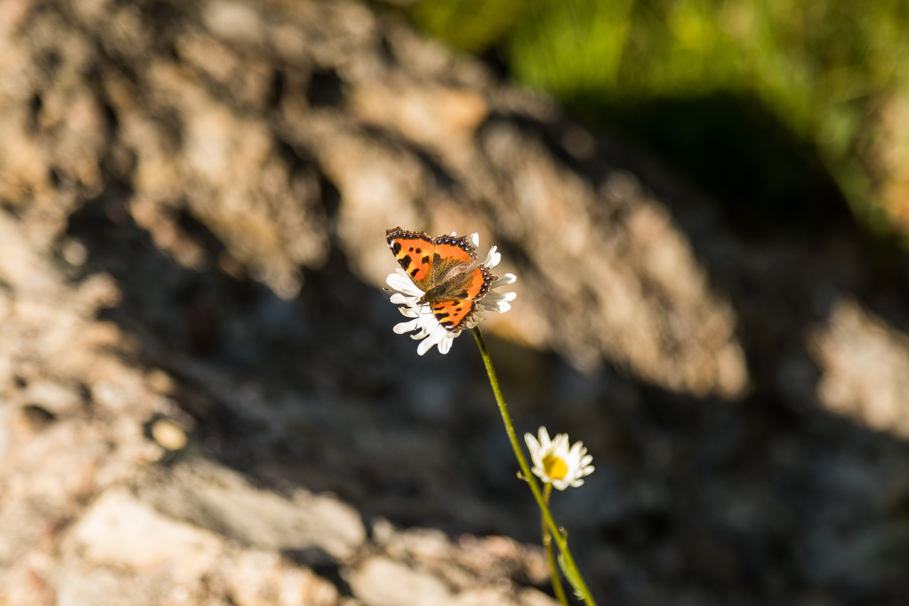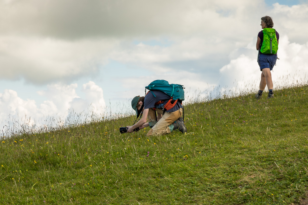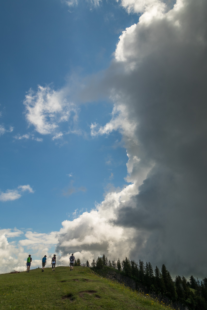 Was für ein Kontrast, als wir beim Kreuz eintreffen, das bereits von Goldau aus zu sehen ist! Eine liebliche Wiese, voller Blumen, empfängt uns oben. Silvan ist hin und weg: „Boaaah, diese Blumen!“ Und schon kriecht er am Boden herum, fotografiert Blume um Blume. Er hat gar kein Auge für die Aussicht. Diese geniessen wir dafür. Fantastisch, was man alles sieht von hier oben, trotz den Wolken in den Bergen. Der ganze Jurabogen zeichnet sich im Westen am Horizont ab, die Mittellandseen können wir schwach erkennen. Und dann der Blick von oben ins Bergsturzgebiet, ein Frösteln läuft einem über den Rücken, wenn man daran denkt, was damals passierte.