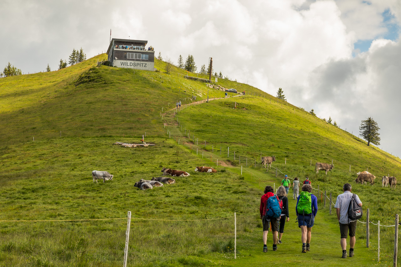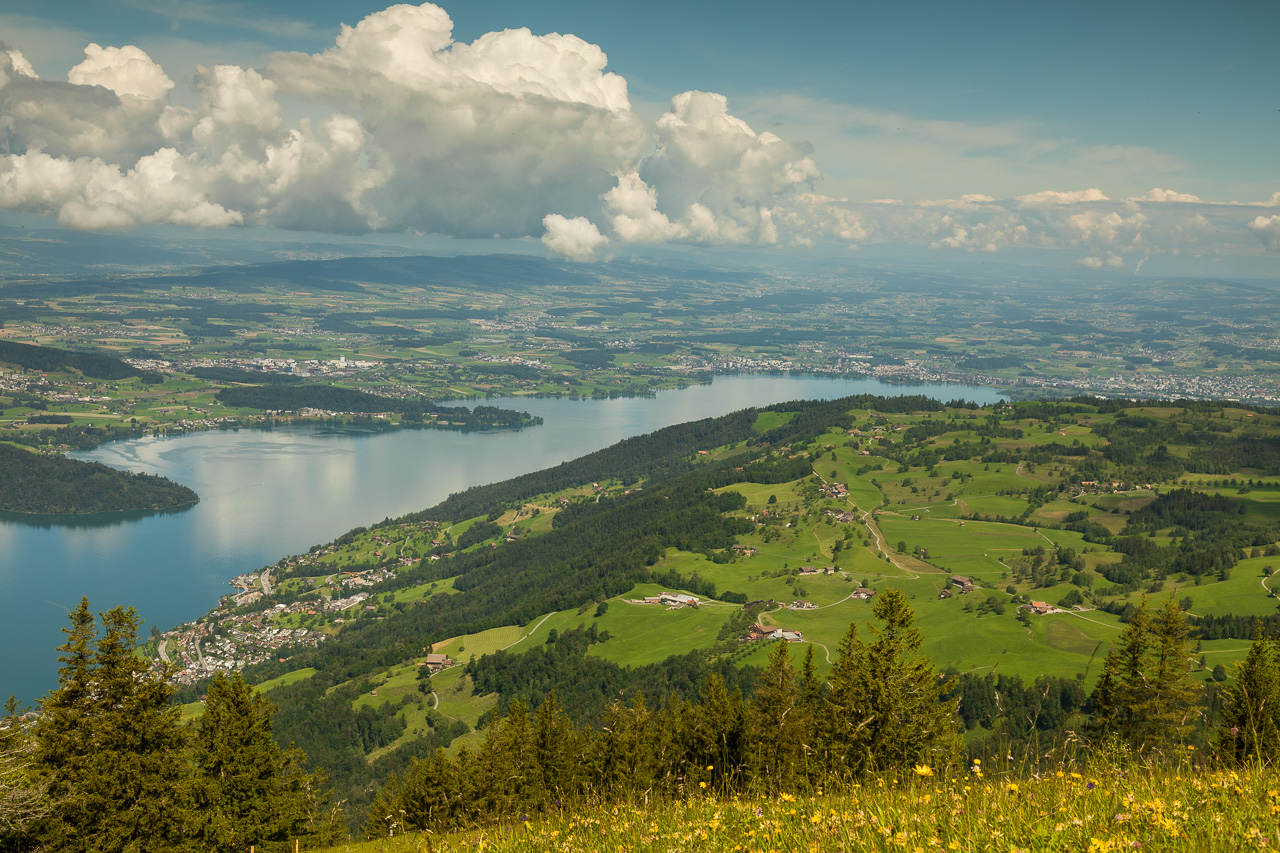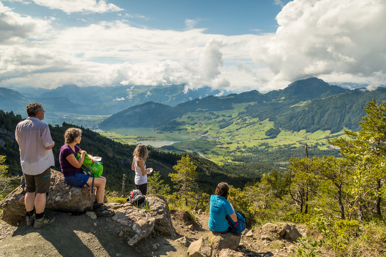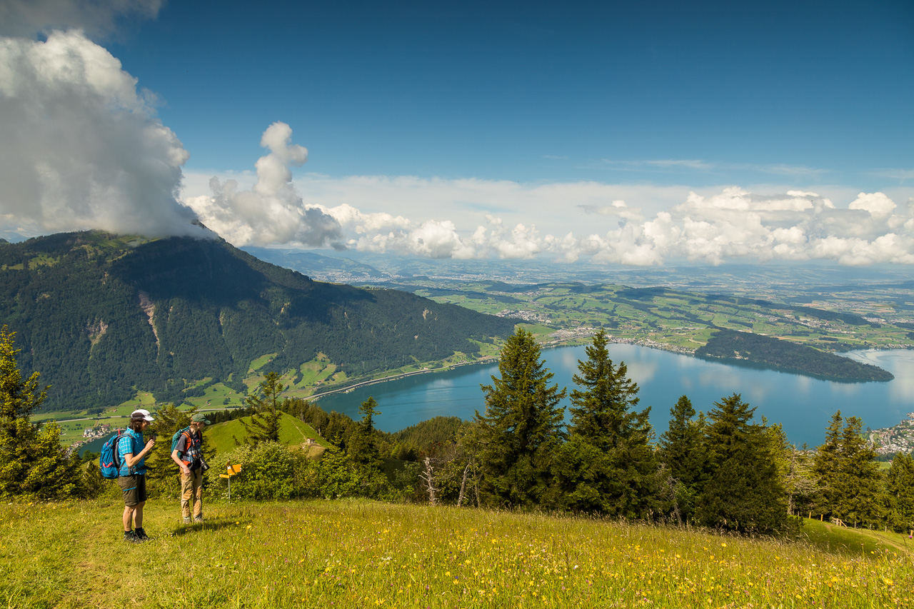 Der Weg ist nun angenehm zu gehen, die Aussicht phänomenal auf die Mythen-Seite. Bevor wir zum zweiten Gipfel, dem Wildspitz, aufsteigen, legen wir die Mittagspause ein. Nach der Stärkung fehlt nur noch der Kaffee. Kein Problem, das Bergrestaurant „Wildspitz“ ist in Sichtweite, zehn Minuten später finden wir sofort einen Platz auf der Terrasse und lassen uns das Gebräu schmecken. Danach stürmen wir aber den Gipfel. Das ist nicht schwierig, denn der ist gleich hinter dem Restaurant und bietet wiederum eine überwältigende Aussicht. Wir haben mal die Seen aufgezählt, die man von dort sieht: Lauerzersee, Zugersee, Sempachersee, Baldeggersee, Zürichsee und Ägerisee. Nur den grössten der Region sieht man nicht, den Vierwaldstätersee, er wird von der Rigi verdeckt. Ich erinnere meine Gspänli daran, dass wir hier auf dem höchsten Zuger Berg stehen, 1580 Meter hoch.