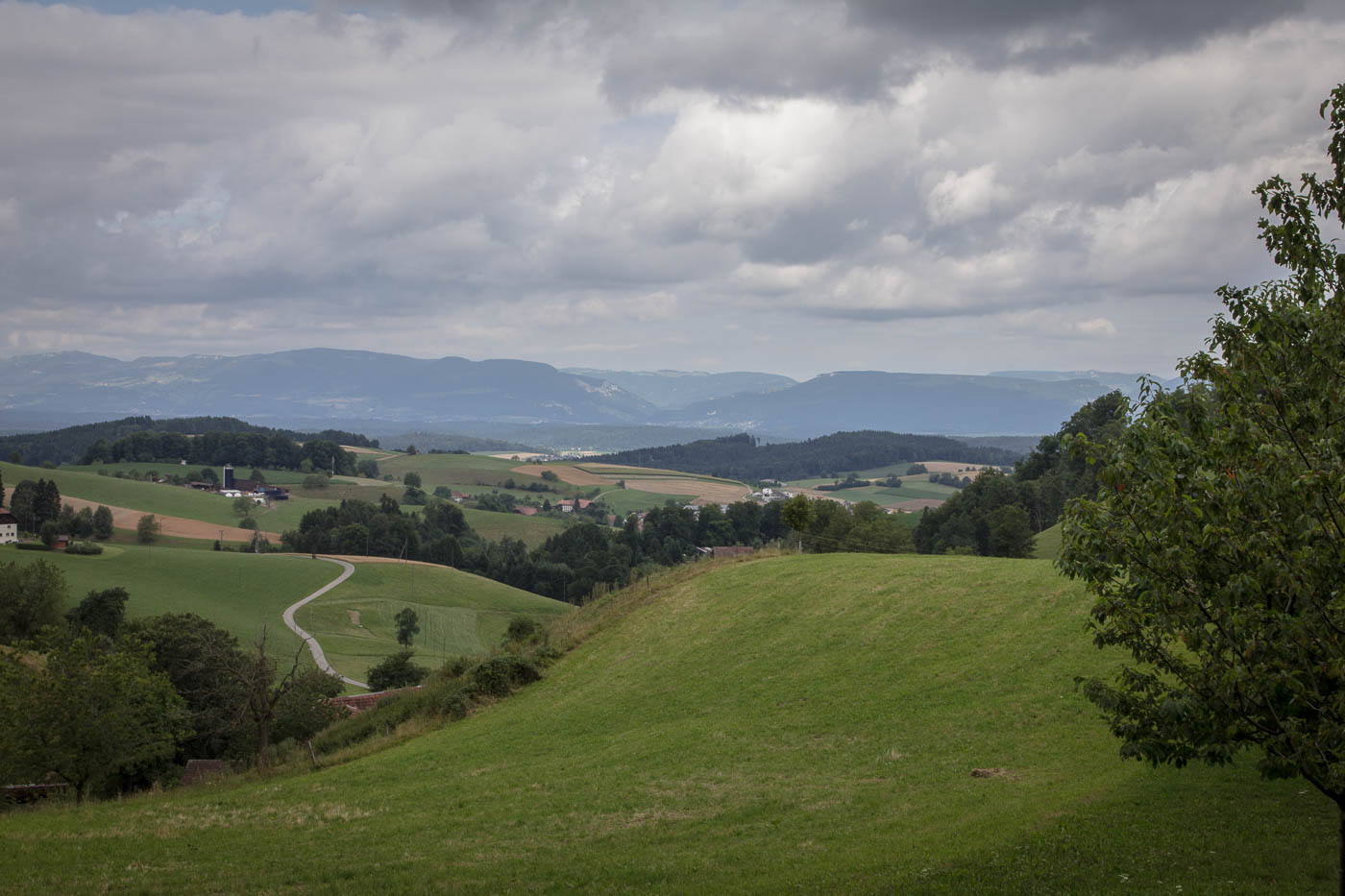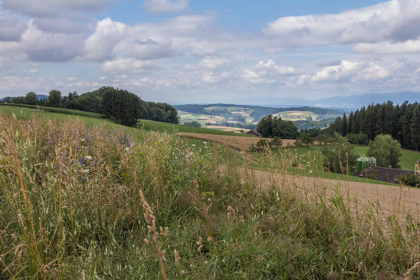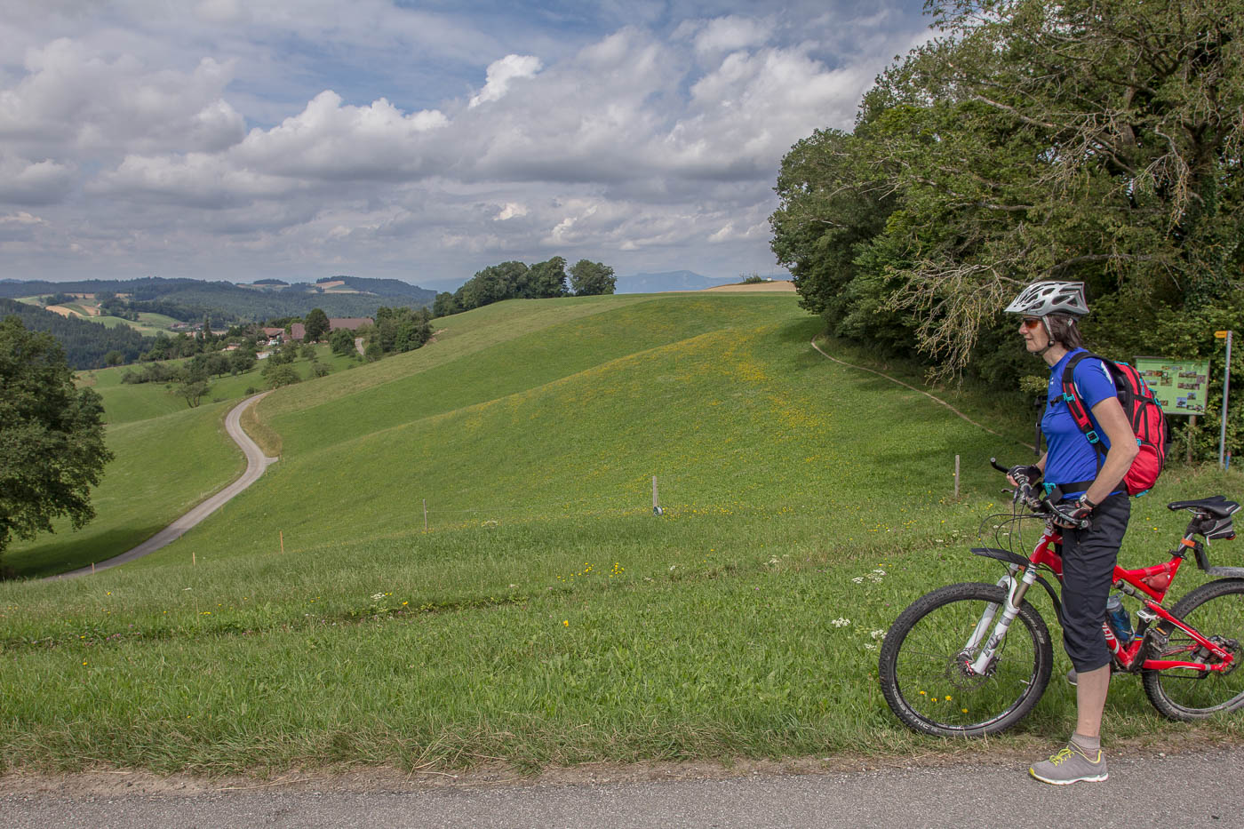 Nun geht es aber auf der anderen Talseite gleich wieder aufwärts, hoch zum Chlämpewald. Oben eröffnet sich uns eine wunderbare Weitsicht in den Jura, wir erblicken den Roggen, den wir letzten Herbst erwanderten. Ab jetzt haben wir keine anstrengenden Steigungen mehr, in sanftem Auf und Ab radeln wir über den Höhenzug. Beim Bellevue ist es Zeit für eine Pause, hier können wir über die Hügellandschaft blicken, der Blick in die Alpen bleibt uns jedoch verwehrt, zu viele Wolken versperren die Sicht.