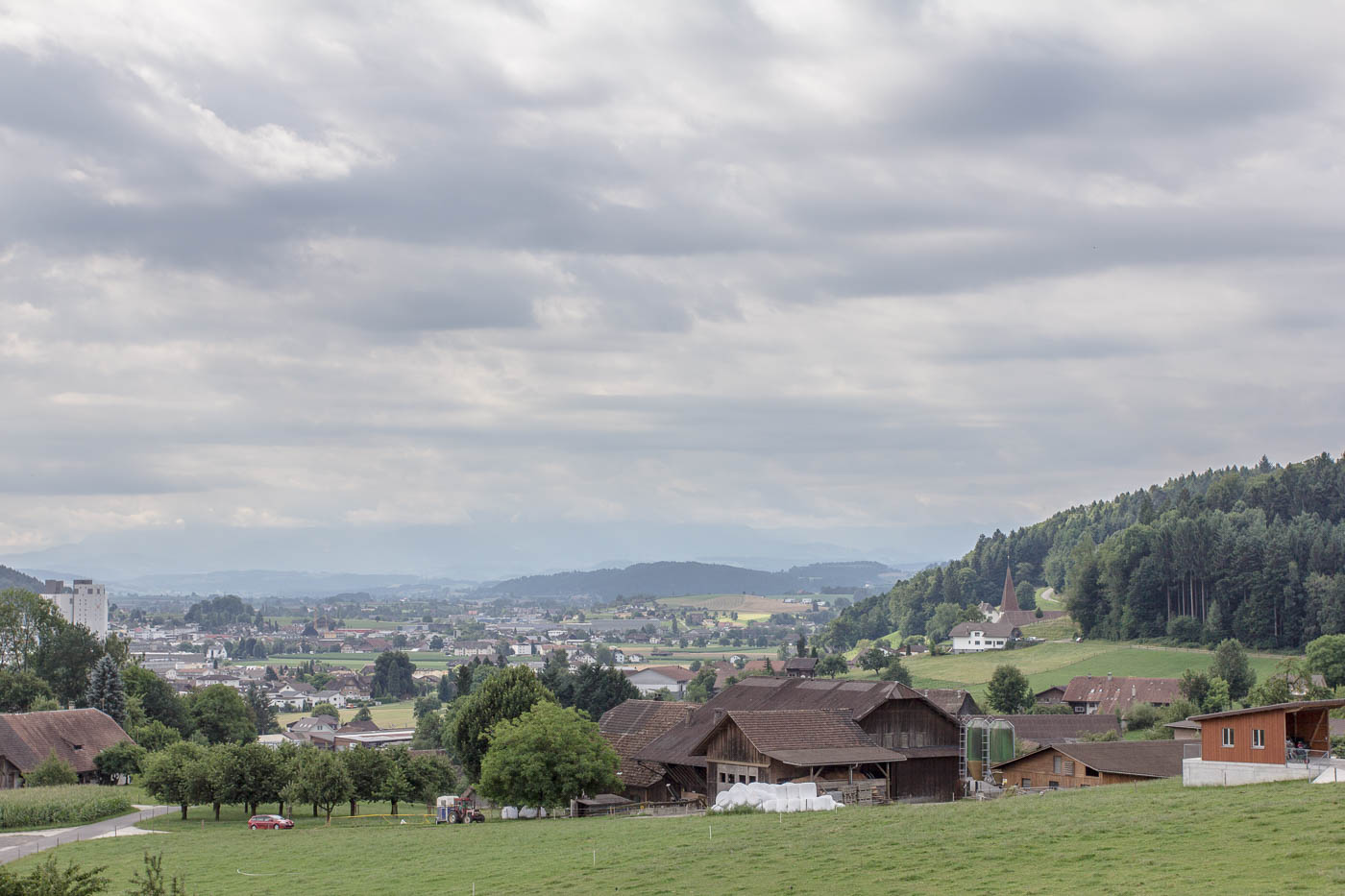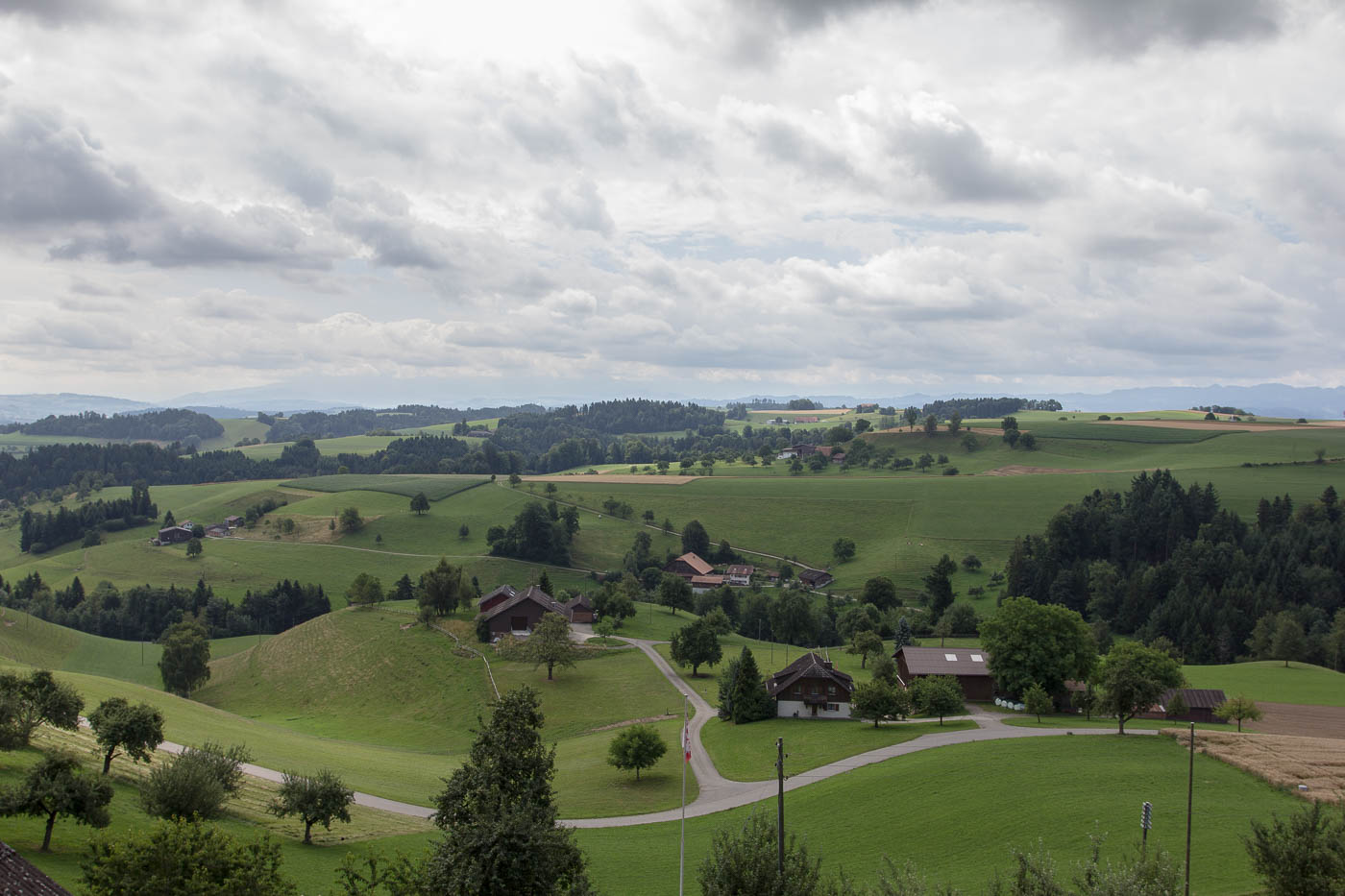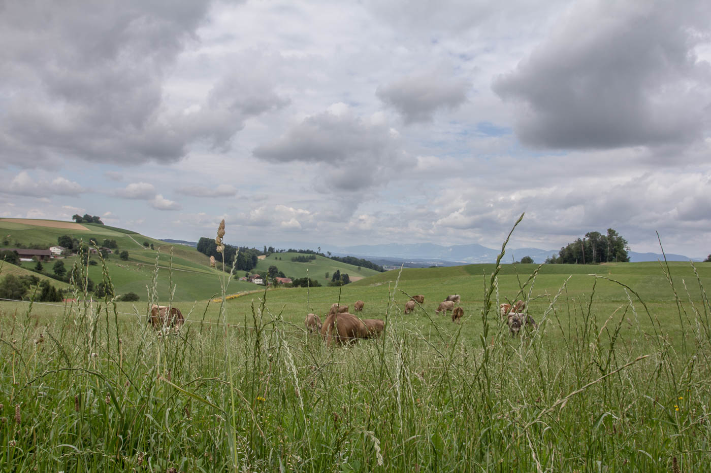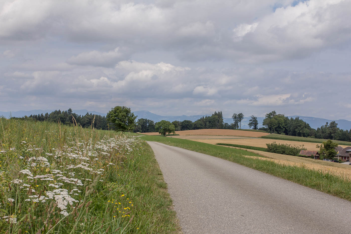 Nun geht es aber auf der anderen Talseite gleich wieder aufwärts, hoch zum Chlämpewald. Oben eröffnet sich uns eine wunderbare Weitsicht in den Jura, wir erblicken den Roggen, den wir letzten Herbst erwanderten. Ab jetzt haben wir keine anstrengenden Steigungen mehr, in sanftem Auf und Ab radeln wir über den Höhenzug. Beim Bellevue ist es Zeit für eine Pause, hier können wir über die Hügellandschaft blicken, der Blick in die Alpen bleibt uns jedoch verwehrt, zu viele Wolken versperren die Sicht.