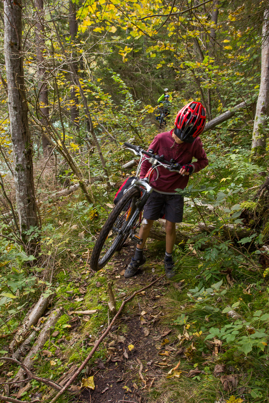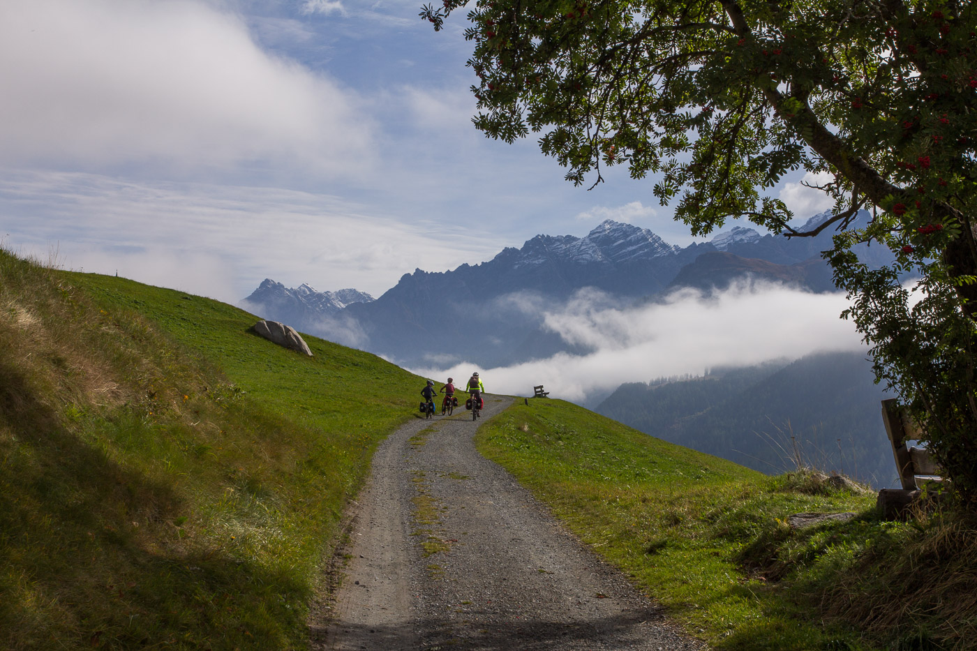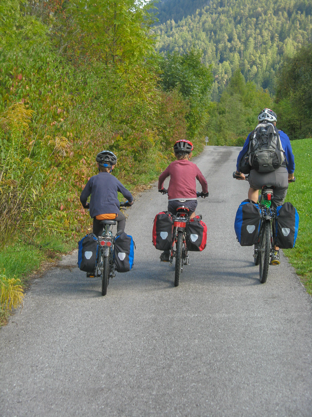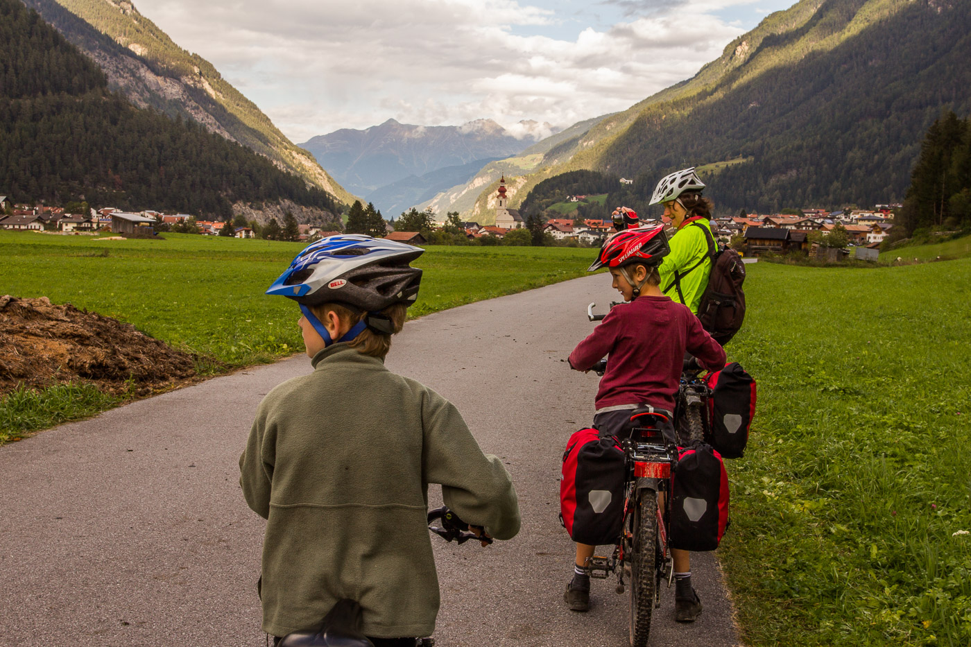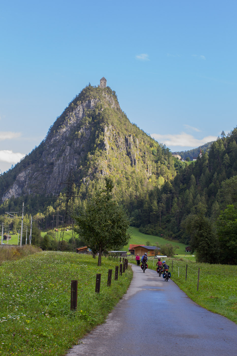 Unsere letzte Etappe. Topographisch nicht anspruchsvoll, aber lang. Knapp 70 Kilometer stehen uns bevor. Ob das die Kinder mitmachen? Wir starten zuerst einmal mit einem Singletrail von der Unterkunft zur Strasse hinunter. Auf dem gestrigen Radweg fahren wir weiter, am Bahnhof vorbei durch eine Schlucht. Links steile Felsen, dann der Inn, der Radweg, die Bahn, dann geht es wieder steil hoch. Richtig idyllisch ohne Motorenlärm!
