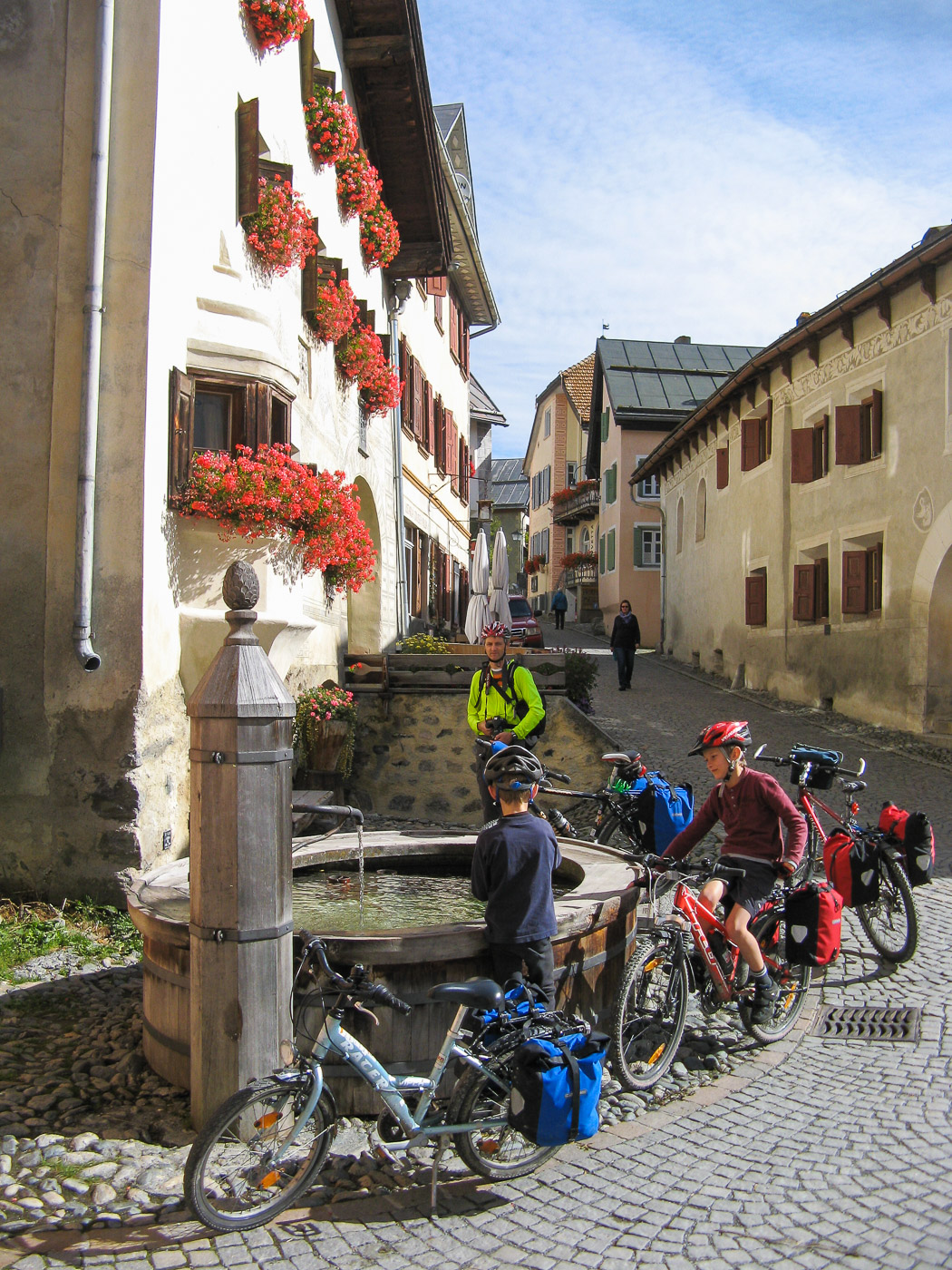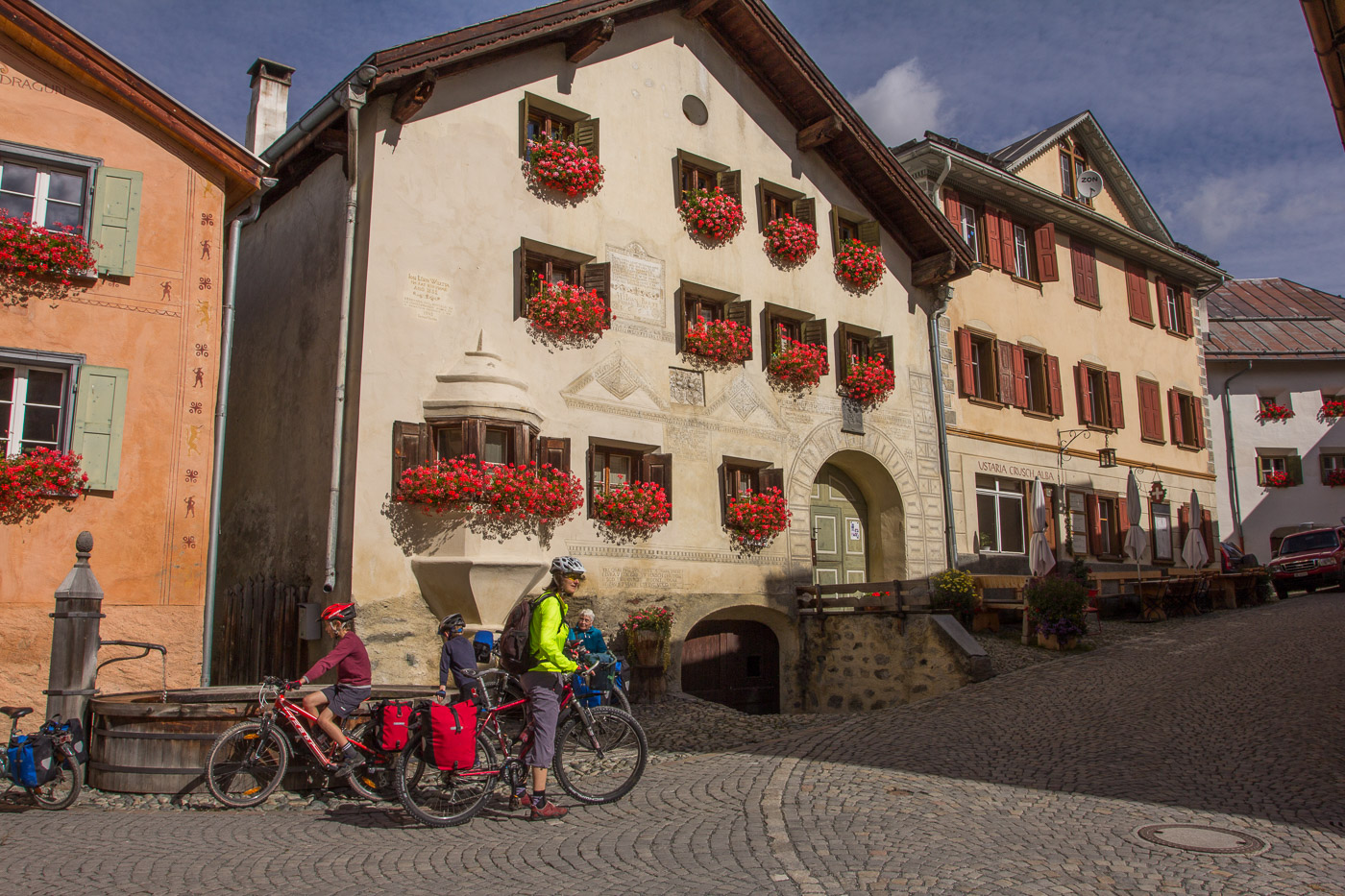 Der heutige Tag verspricht wieder viel Höhenmeter. Und viel Naturbelag. Und viele landschaftliche Schönheiten. Der Start ist wieder relativ gemütlich, wenn auch weiterhin kühl. Über Wiesen und durch Wälder fahren wir nach Susch und weiter dem Inn entlang bis Lavin. Von der Brücke her, die den Inn überquert, müssen wir sehr steil ins Dorf hoch fahren.
