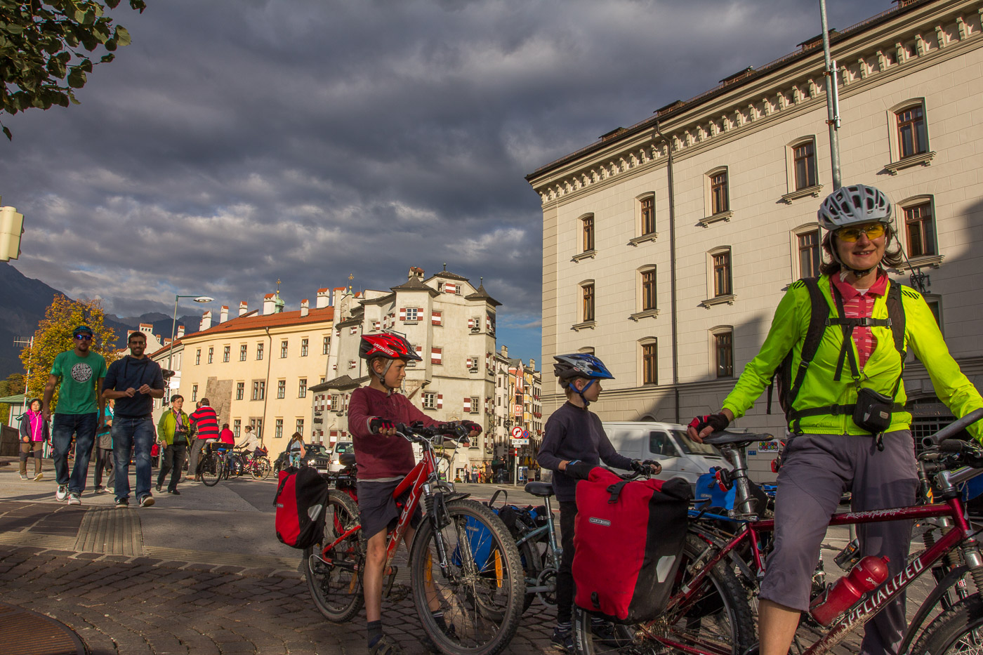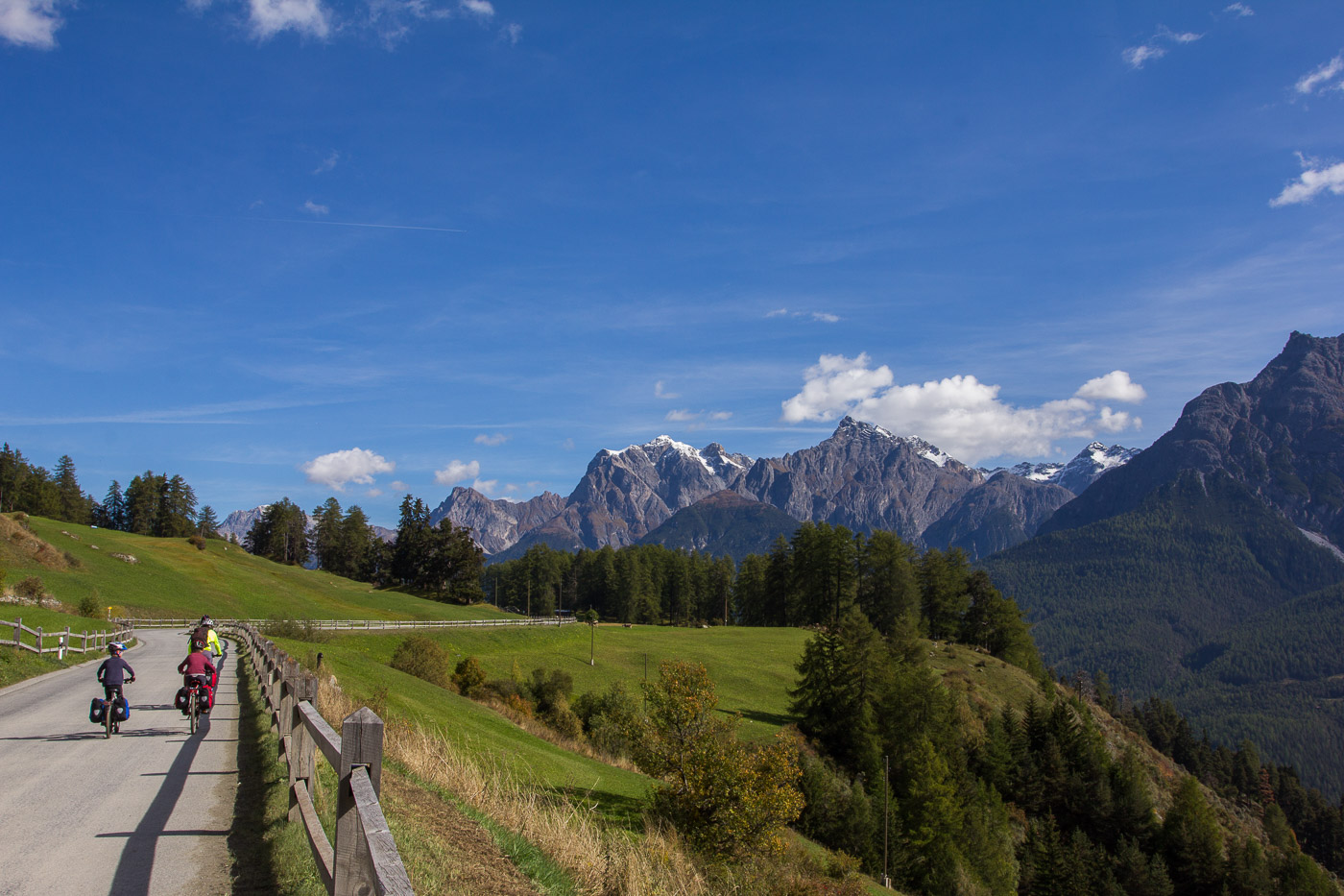Endlich: Wir sind wieder einmal auf Veloreise. Es ist jedes Mal ein besonderes Erlebnis, mit der Familie ein oder zwei Wochen unterwegs zu sein, von Ort zu Ort zu ziehen, mit Sack und Pack auf dem Velo. Diesmal fahren wir von St. Moritz dem Inn entlang bis Innsbruck. In mehreren Etappen durchfahren wir das wunderbar herbstliche Engadin und das österreichische Inntal. Und als Vorwarnung: Wer nicht gern auf Naturbelag fährt und Steigungen ebenfalls verabscheut, muss sich gar nicht erst an die Planung dieser Reise machen resp. sich auf die zweite Hälfte ab Pfunds beschränken.