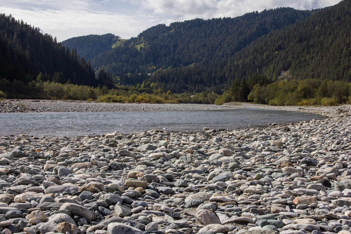 Wir fahren weiter auf Naturstrassen durch Wälder und über Felder, mal nah, mal fern dem Inn. Dass die Erosion auch hier zuschlägt, wird uns deutlich, als der Weg plötzlich abgesperrt ist und ein Brücklein notdürftig über den Abgrund hilft. Bei Sur En besteht erstmals die Möglichkeit, sich in einem Restaurant aufzuwärmen. Wir fahren aber tapfer daran vorbei. Nach dem Campingplatz beginnt ein Skulpturenweg mit Werken von verschiedenen Künstlern. Vis-à-vis von Ramosch sind wir wieder am Inn. An einer geeigneten Stelle, einer Kiesbank im Fluss, legen wir eine Pause ein. Wir nutzen diese zum Essen, die Kinder zum Spielen, was sich später noch rächen wird. Sie bauen aus Schwemmholz einen Laden für Bodenplatten und einen für Boote, bezahlt wird in Steinen. Wer braucht schon Designer-Spielgeräte?