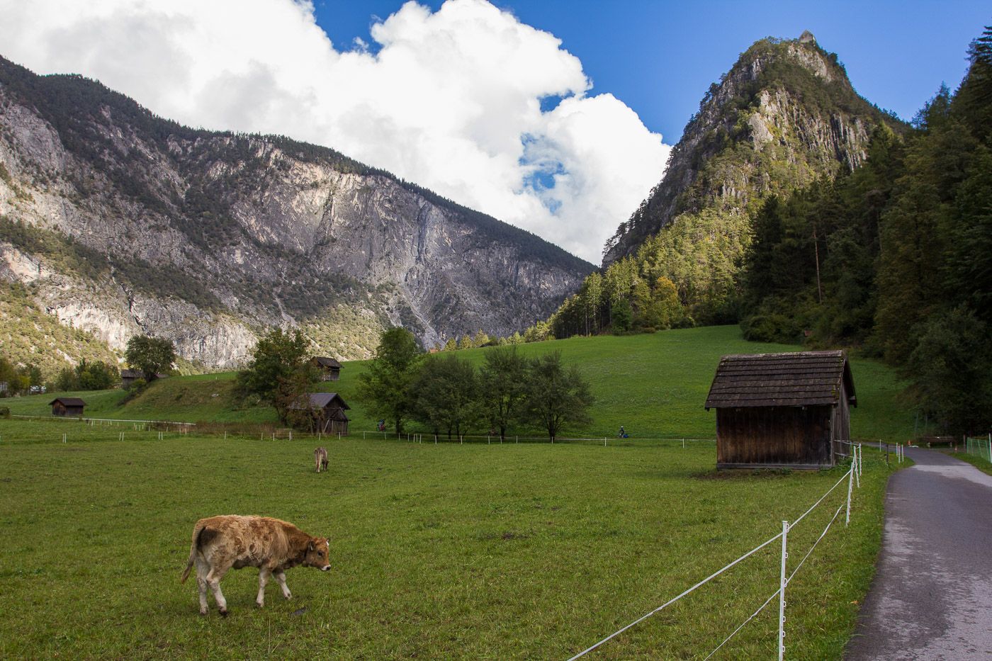 Nun steht uns noch mals ein scharfer Uphill bevor. Steil und lang zieht er sich hoch bis zum Gehöft Raschvella, von wo man eine schöne Aussicht talaufwärts hat.