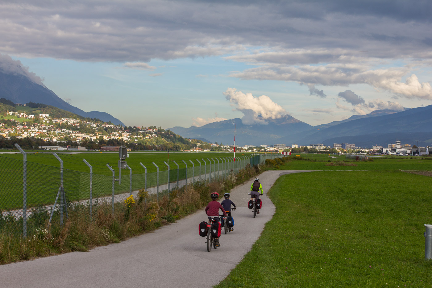 Nach dieser Stärkung fahren wir weiter nach Rietz. Inzwischen hat sich die Sonne durchgesetzt, entsprechend sind die Temperaturen moderater geworden. Wir suchen den Weg auf die ursprüngliche Innroute. Über Felder geht es weiter dem Inn entlang. Das Ziel ist nicht mehr fern. Unglaublich die Energie der Kinder: Schon fast 60 Kilometer geradelt und keiner reklamiert auch nur ansatzweise. An einer geeigneten Stelle machen wir nochmals eine Pause, bevor wir unser Ziel vor Augen kriegen: Innsbruck.