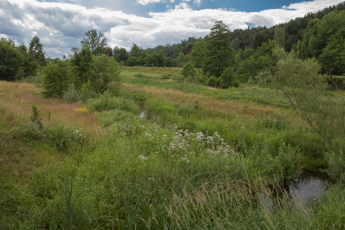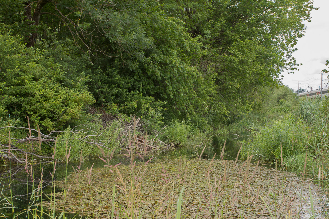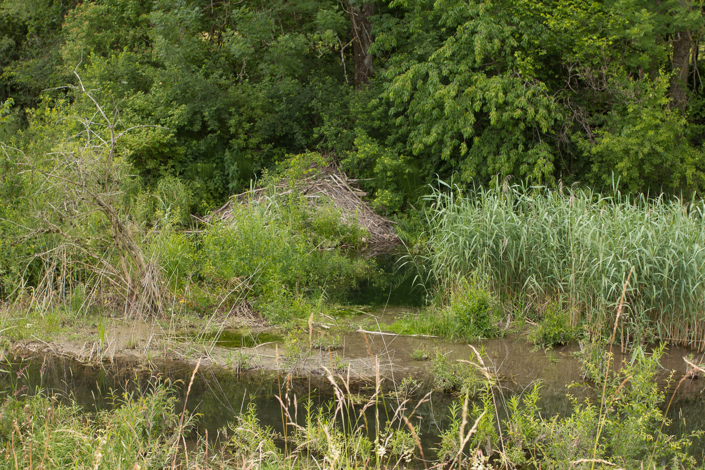 Die letzten Kilometer stehen an. Bald schon sind wir in Aarwangen an unserem Treffpunkt. Da es in Aarwangen aber mehrere Bahnhöfe gibt, ist es nicht ganz einfach, sich zu treffen. Aber wir schaffen es noch. Wir besuchen nun mit dem Biberspezialisten von Pro Natura ein Gebiet, das der Nager zu seinen Gunsten umgestaltet hat. Der Spezialist vermittelt uns viel Spannendes über das nachtaktive Nagetier. Schon bald finden wir Spuren: Angenagte Bäume, eine Biberburg und Dämme. Der Biber ist der beste Landschaftsarchitekt, wenn es um Renaturierungen geht. Überlässt man ihm ein Gebiet, erhöht sich die Biodiversität fast explosionsartig.