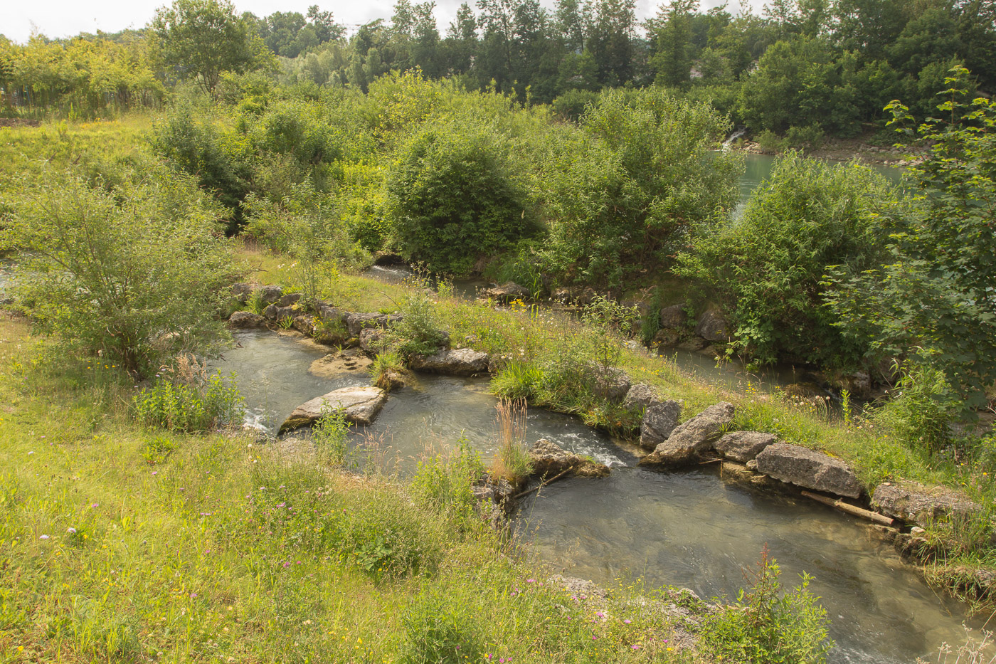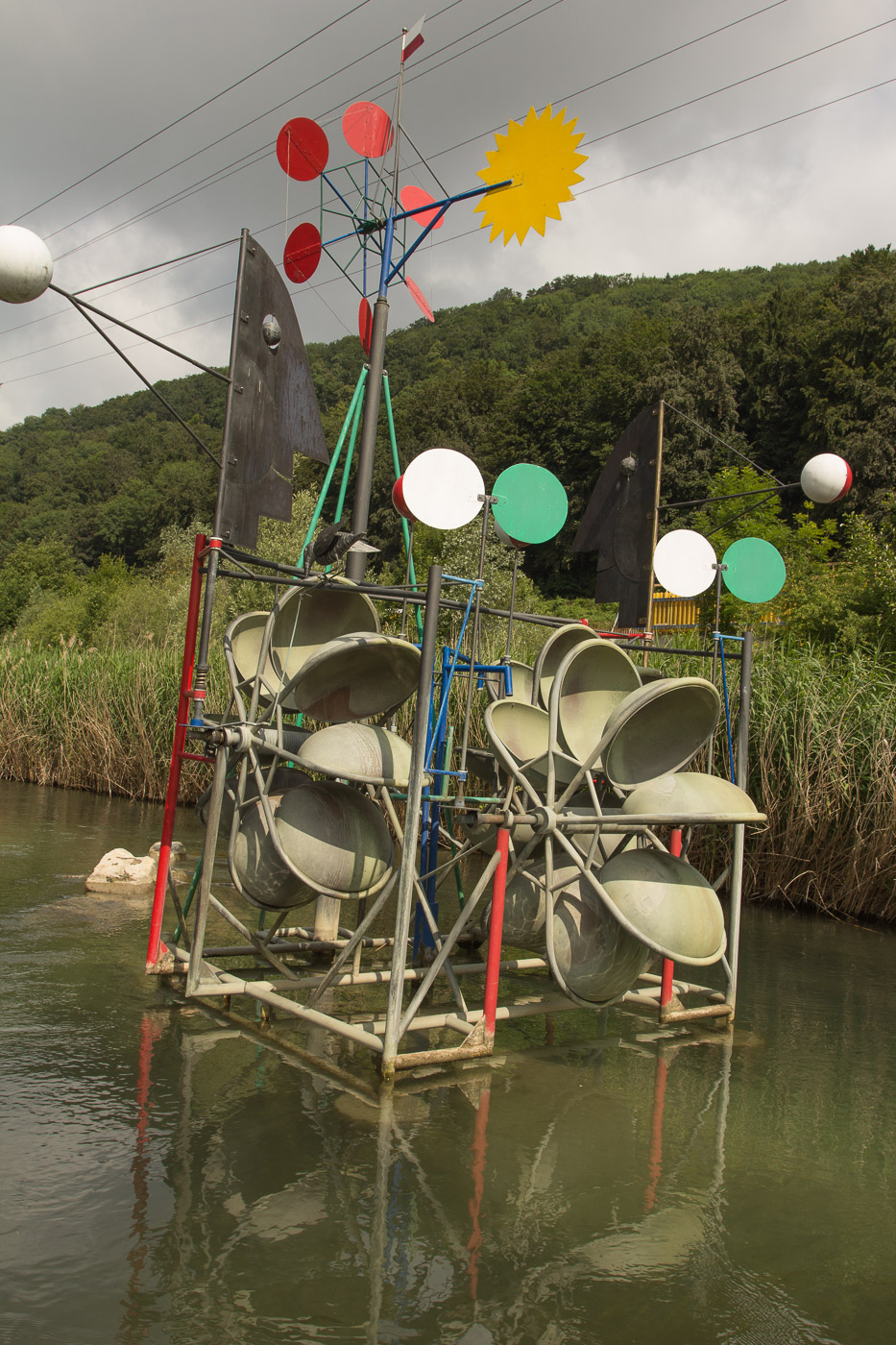 Weiter geht die Fahrt der Hauptstrasse entlang zum Kraftwerk Ruppoldingen. Eine Fischtreppe ermöglicht es den Fischen, das neue Kraftwerk zu umgehen (resp. umschwimmen). Weniger beeindruckt dürften sie vom Kunstwerk sein, das diesen Kanal ziert.