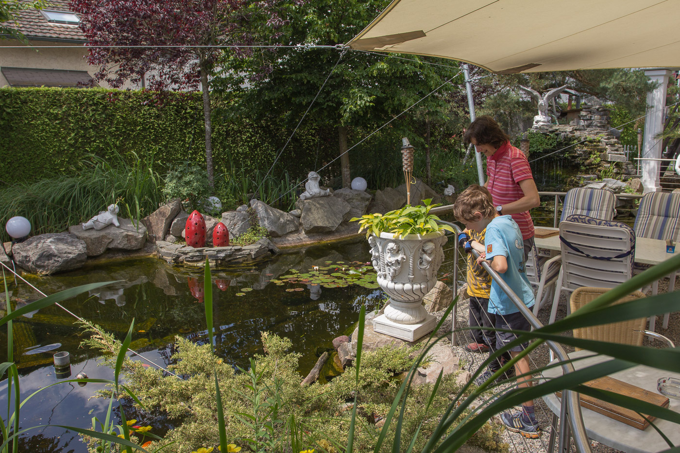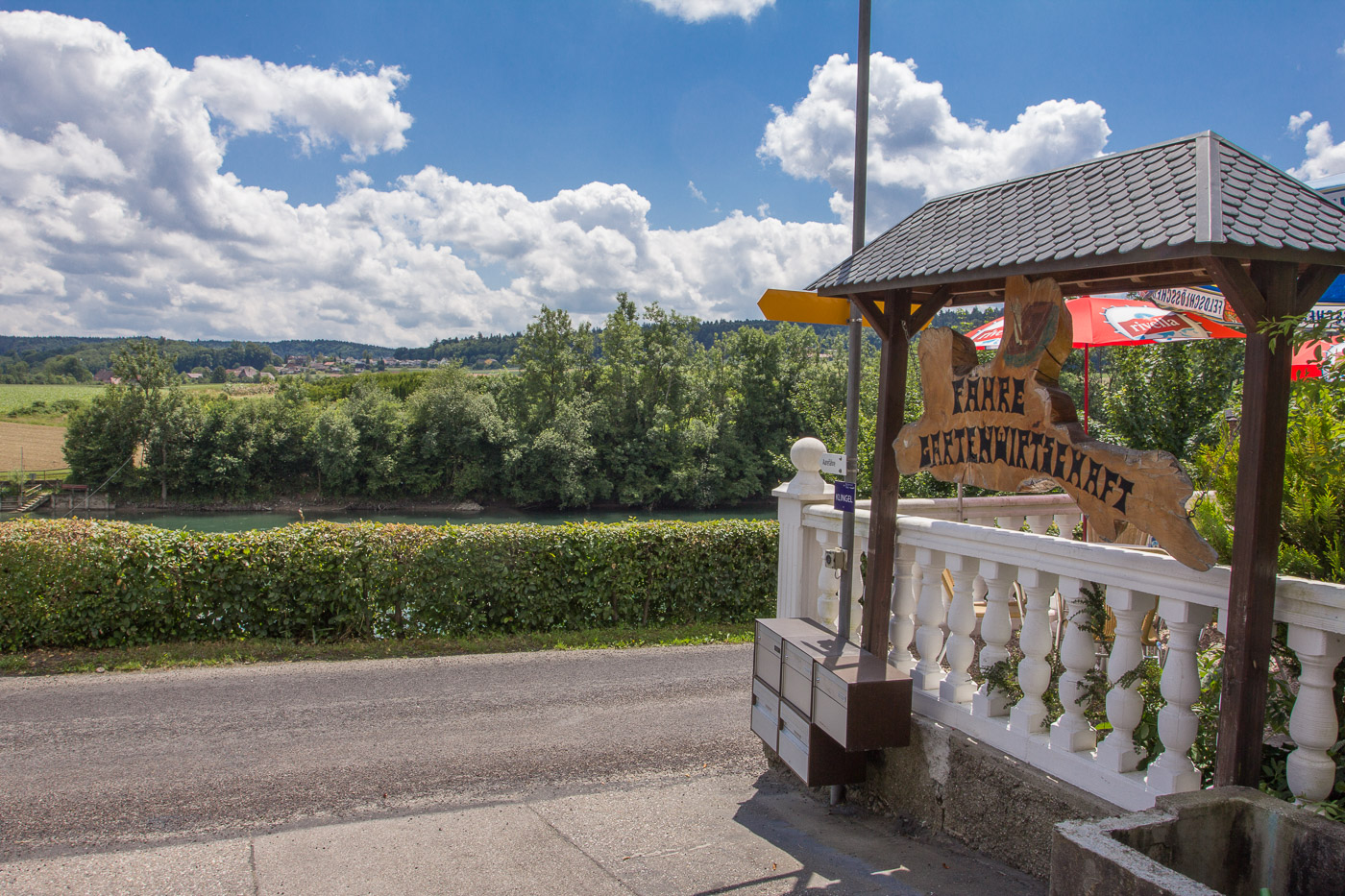 Wir durchfahren das sehr ländliche Boningen, das mit wunderschönen renovierte Bauernhäuser aufwartet. Wir durchqueren einen Wald und eine grosse Kiesgrube, die einen längeren Aufenthalt wert wäre, sieht sie doch ökologisch interessant aus. Da wir aber einen Termin haben, müssen wir weiter. Die Aare sehen wir nicht, wir sind relativ weit entfernt von ihr. An Fulenbach vorbei gelangen wir bei Wolfwil wieder an die Aare. Da wir noch viel Zeit haben bis zu unserem Meeting, kehren wir in der „Fähre“-Gartenwirtschaft ein, einem romantische Beizli. Am Fluss unten kann man auf einer richtigen Fähre selbigen überqueren.