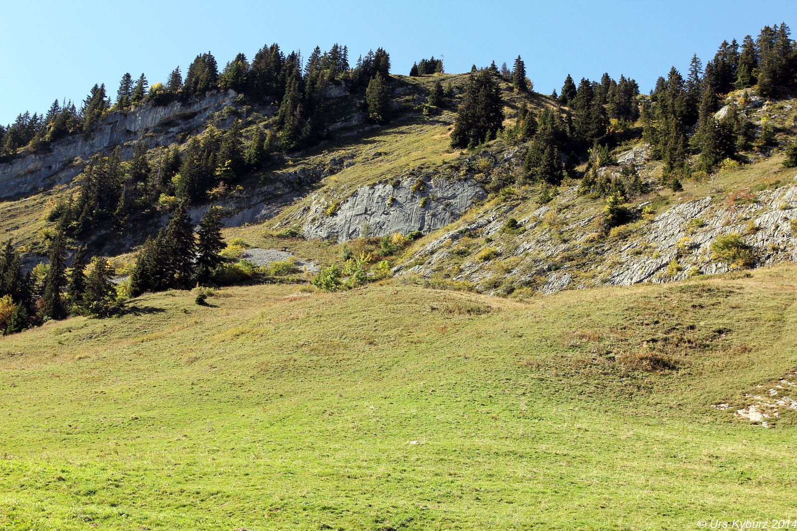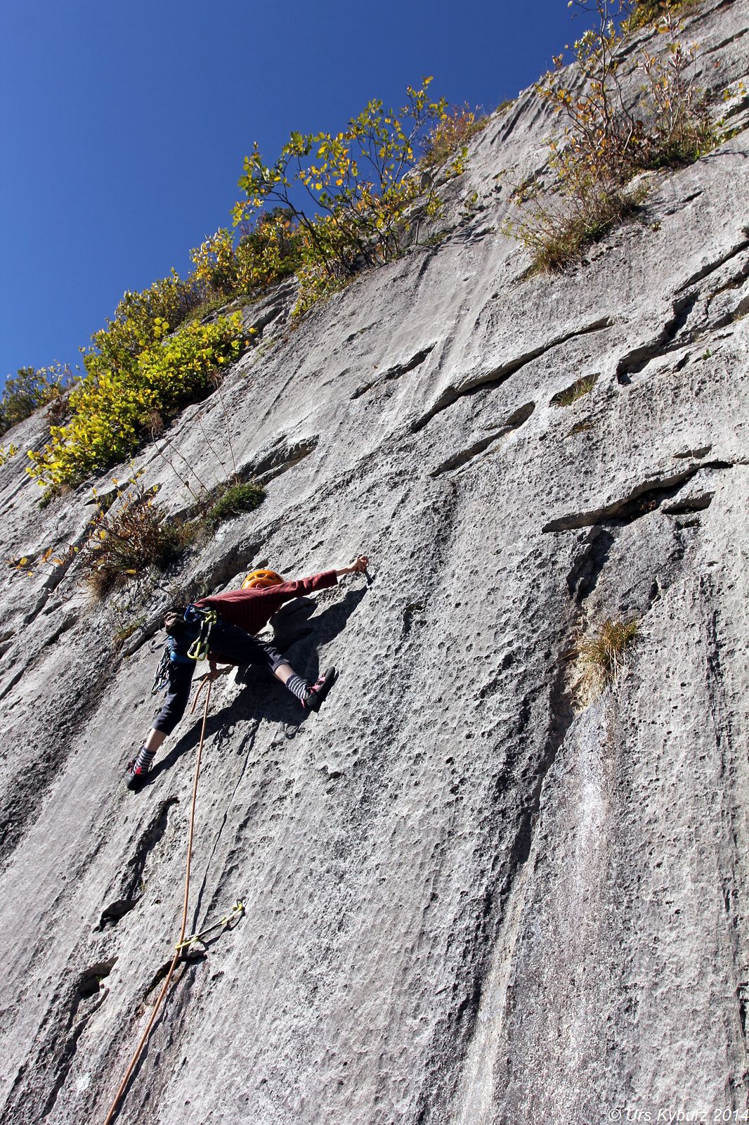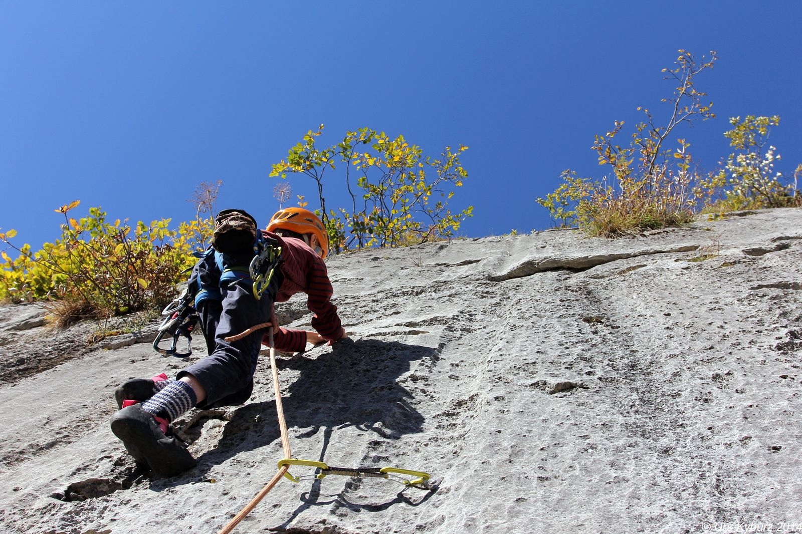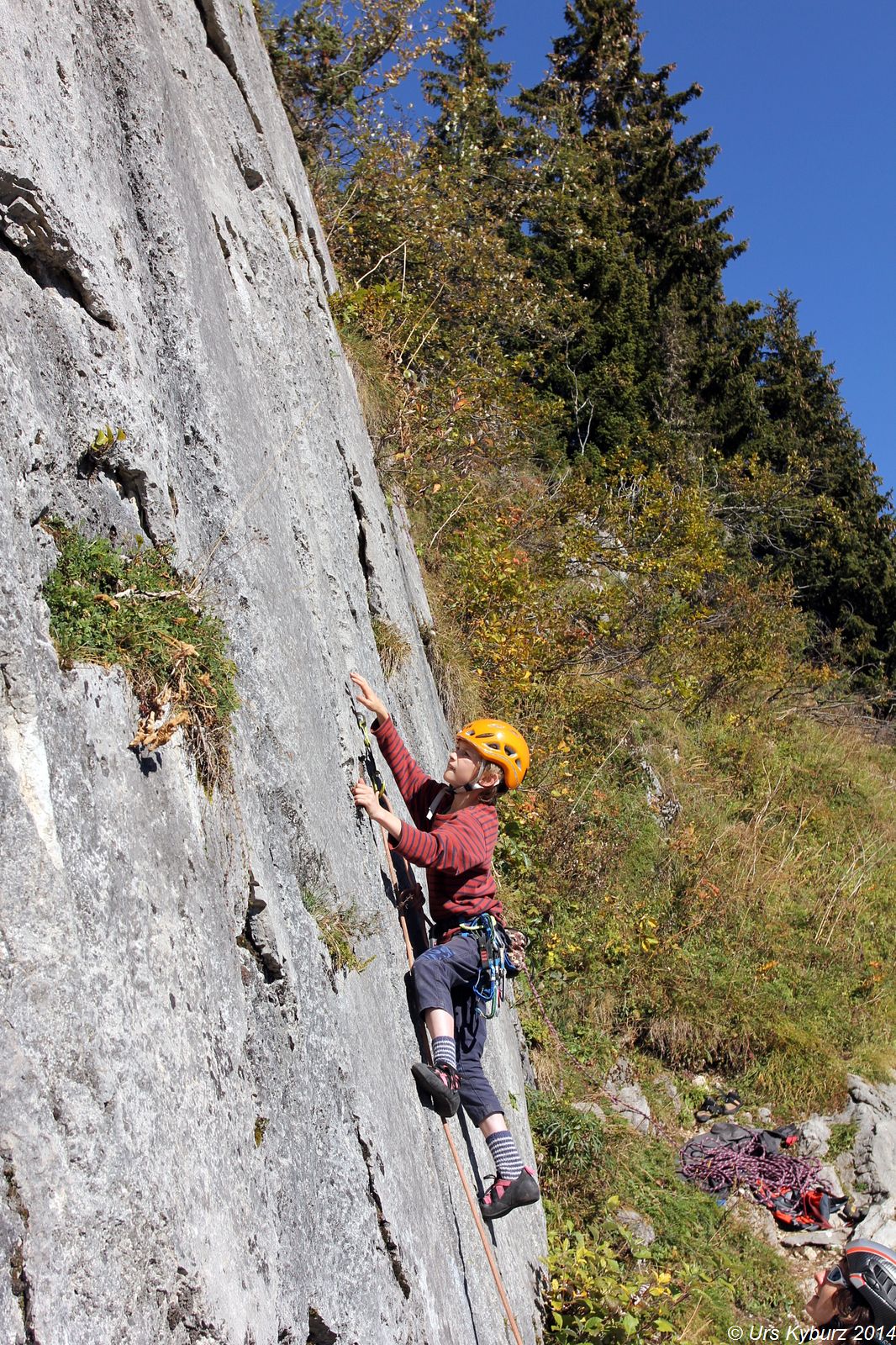 Die Wand sahen wir vom Parkplatz her. Wie man aber dort hin kommt, war uns noch nicht ganz klar, also stiegen wir einfach am Rand der Weide hoch. Nach einer Viertelstunde erreichten wir den Wandfuss. Voller Eifer machten sich die Kinder bereit, beide wollten vorsteigen. Also gut, schliesslich soll das ja ein kinderfreundliches Gebiet sein. Die Hakenabstände sahen sportlich aus, aber vielleicht waren die Routen ja nicht so schwer. Bald kamen sie aber nicht mehr weiter. Wir Eltern beendeten dann die Route. Und sahen, woran sie scheiterten. Wenn man 180 Zentimeter lang ist, sind die Routen tatsächlich 4b oder 4c, für die Kinder allerdings waren die Griffe ausserhalb jeder Reichweite. So ging es auch mit den weiteren Routen. Für uns Eltern machbar, aber für die Kinder war es schon eine Herausforderung oder gar unmöglich. Aber der Fels war top, unten Löcherfels, oben Rillen, die wie versteinerte Wellen aussahen. Und sehr griffig. Wir versuchten oder kletterten noch ein, zwei Routen, dann packten wir wieder zusammen. Die Hitze machte uns zusätzlich schlapp, die Sonne strahlte vom wolkenlosen Himmel.