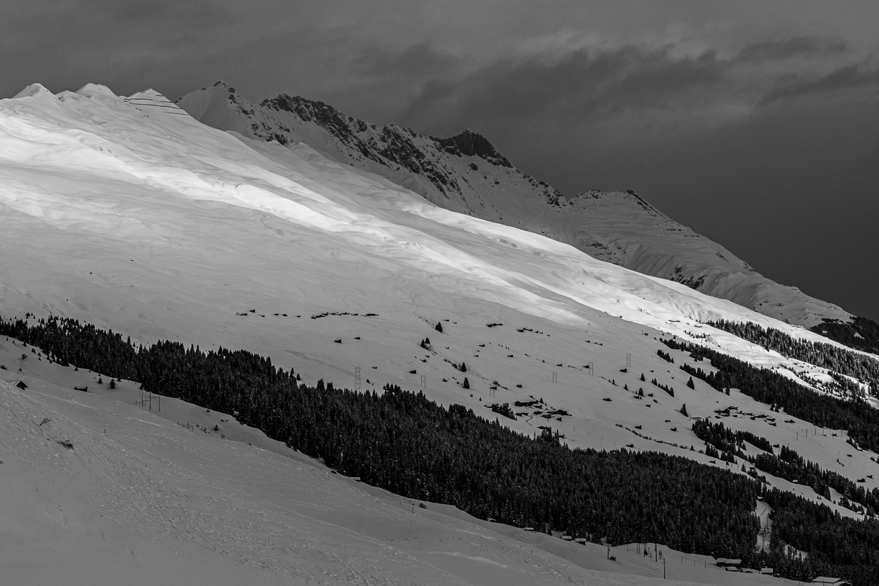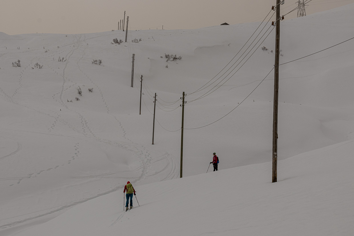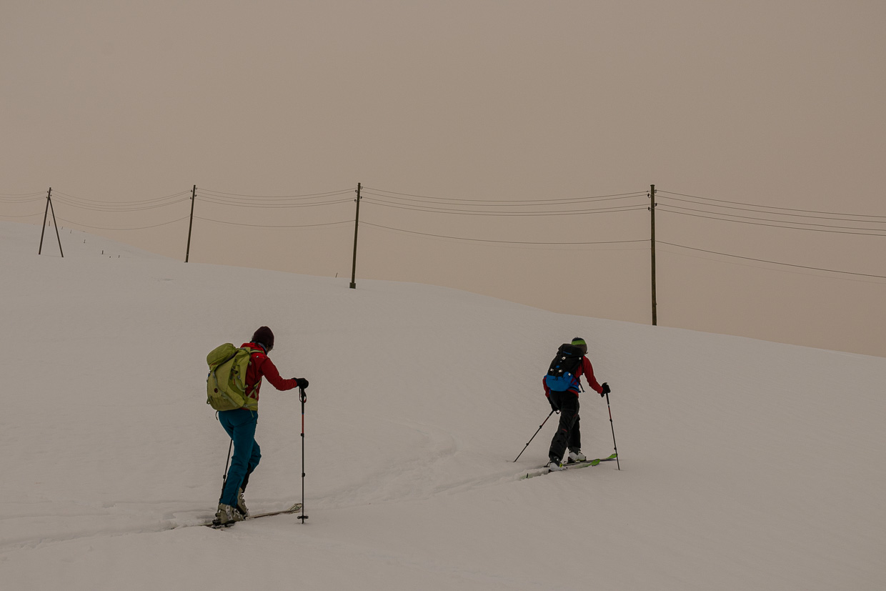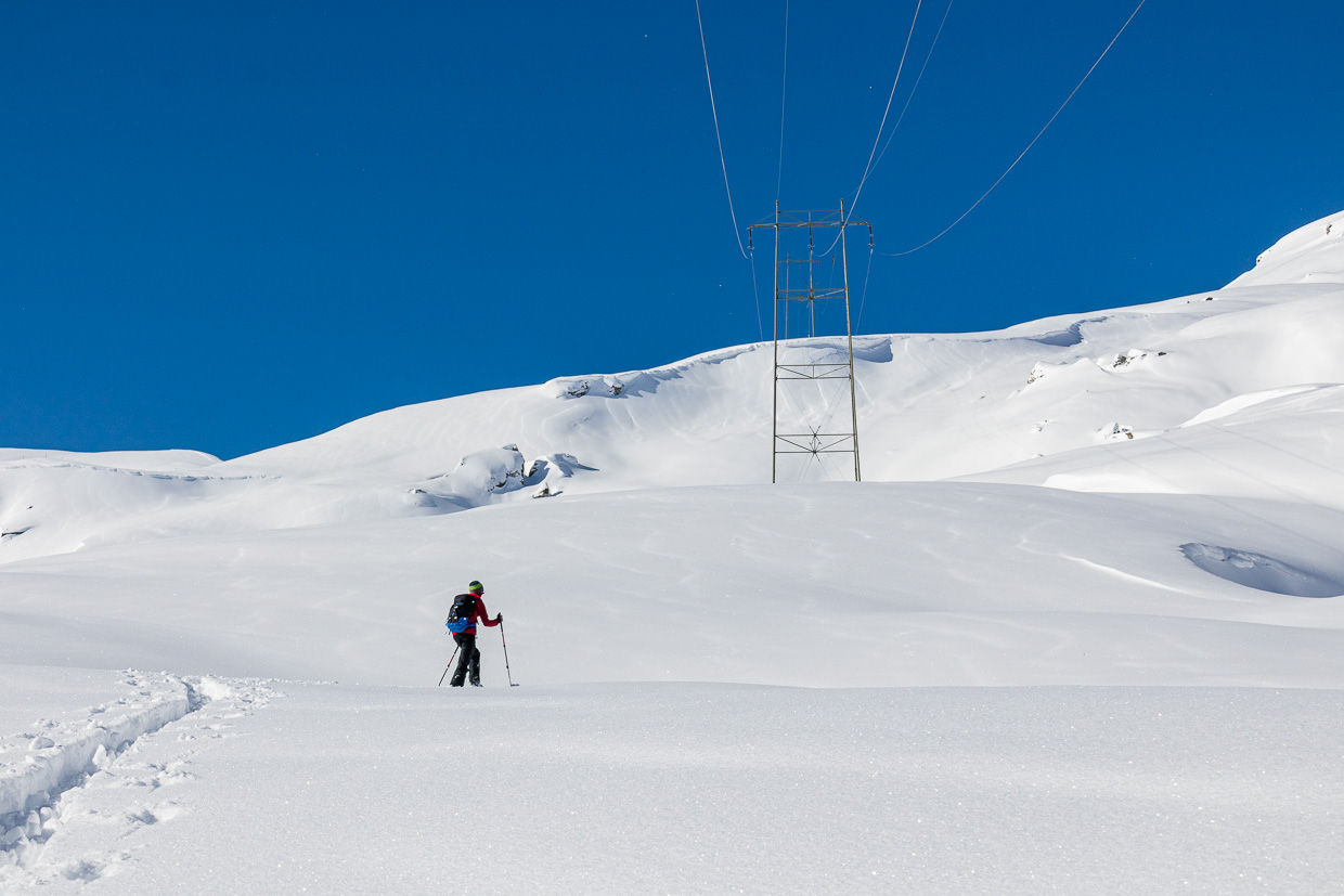 Wir erreichen eine erste Ebene, schauen auf die Karte, schauen das Gelände an. Die Lawinengefahr ist auf der Stufe „erheblich“. Wir suchen uns den Weg durch Gelände, das nicht über 30 Grad steil ist. Das Strätscherhora wäre ein Ziel, das weitgehend durch Gelände unter der kritischen Steilheit führt, aber eben nicht nur. Da wir die Route nicht kennen, legen wir ein unspektakuläres Ziel fest, einen Strommasten. Bis dort hin ist das Gelände relativ flach und unbedenklich.