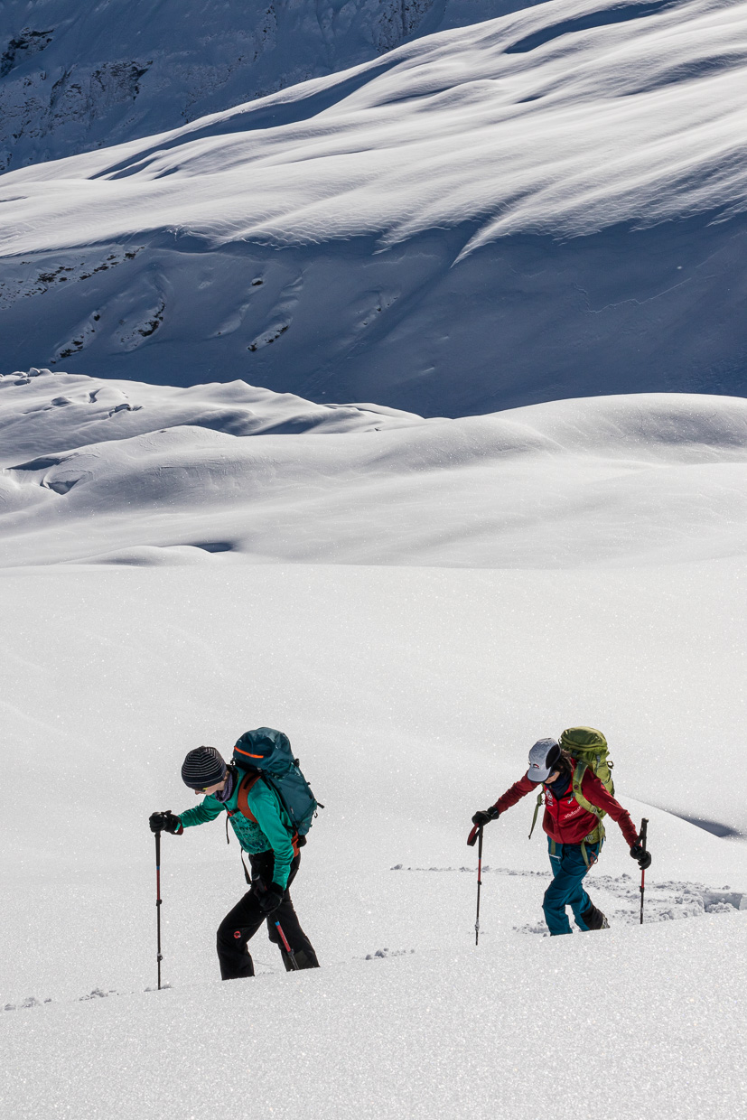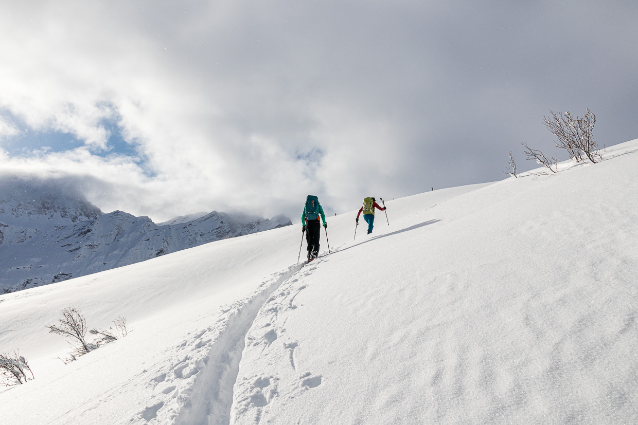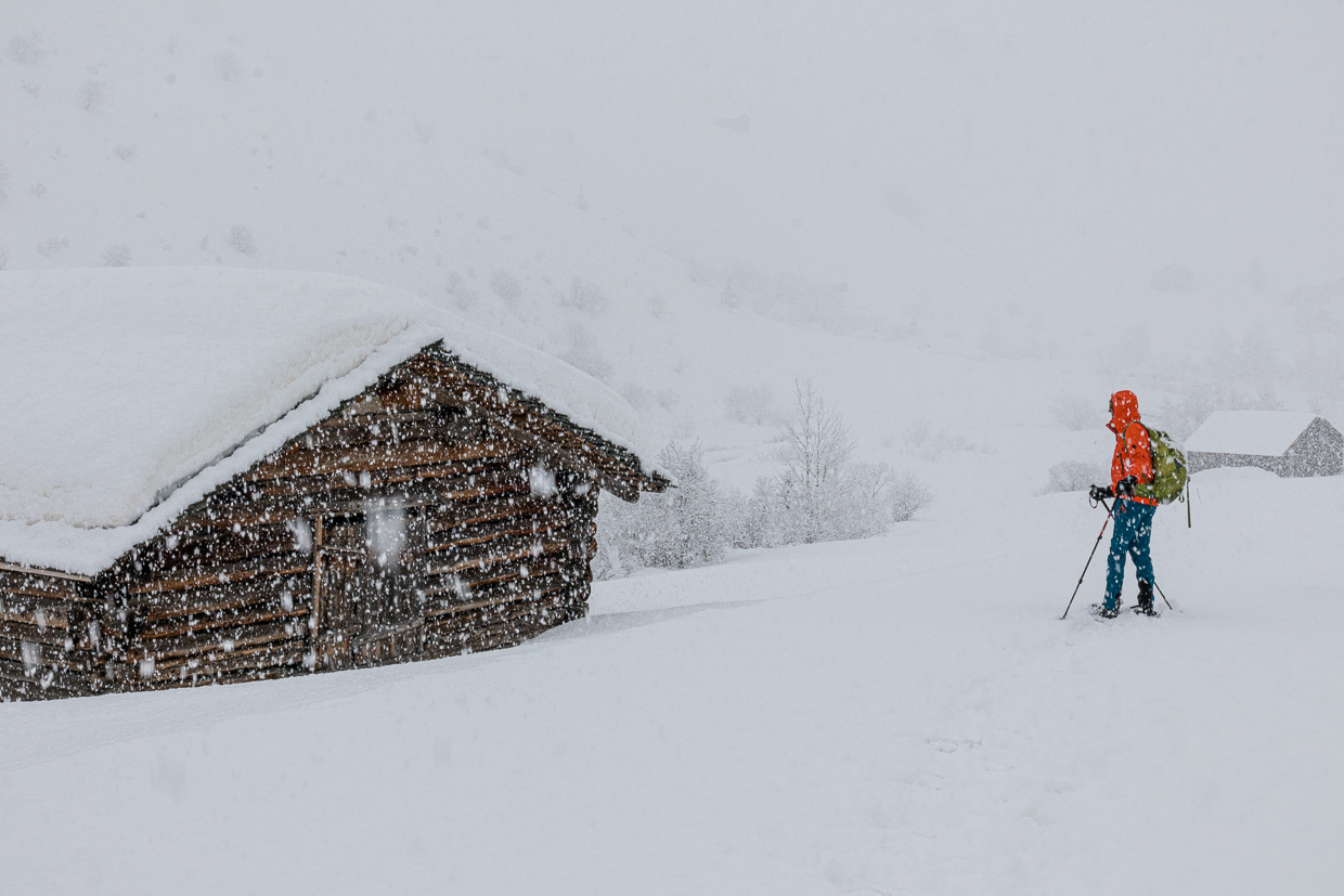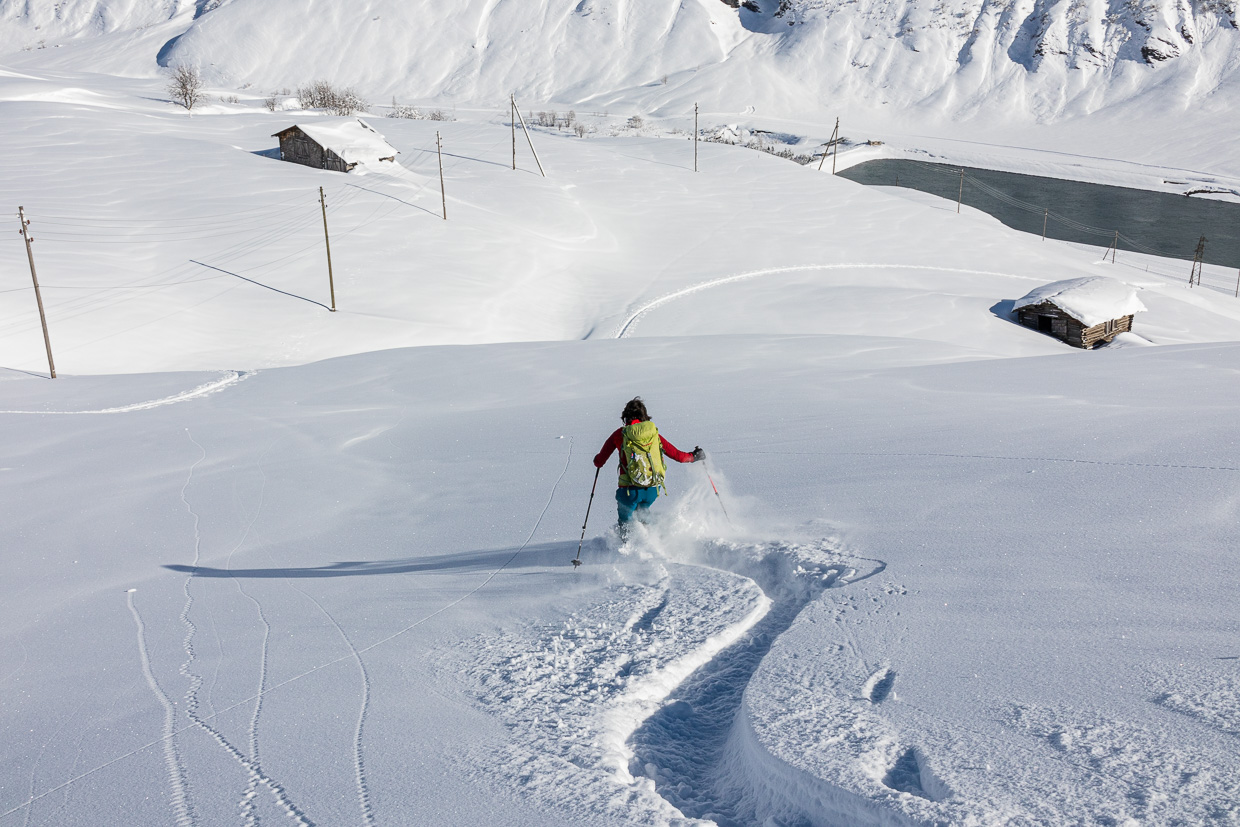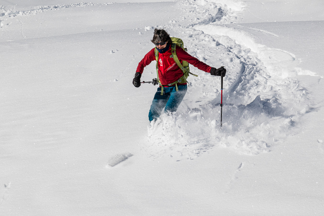 Wir starten vor der Haustüre, ich spure durch knietiefen Pulverschnee. Ein grosses Versprechen für die Abfahrt! Aber es ist anstrengend. Ich suche die flachsten Stellen für die Spur, der erste Tag nach Schneefällen ist bekanntlich immer der gefährlichste, da passieren die meisten Lawinenunfälle, das möchten wir selbstverständlich vermeiden. Nach ungefähr 150 Höhenmeter trete ich zur Seite und lasse Fabian spuren. Dieser geht wie eine Maschine voran, legt eine gute Spur. Bei den Alphütten, die wir am ersten Tag erreichten, machen wir wieder eine Pause, danach führt uns die Frau weiter hoch.