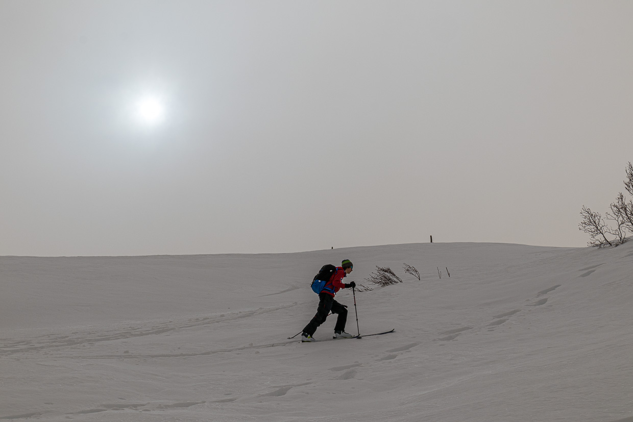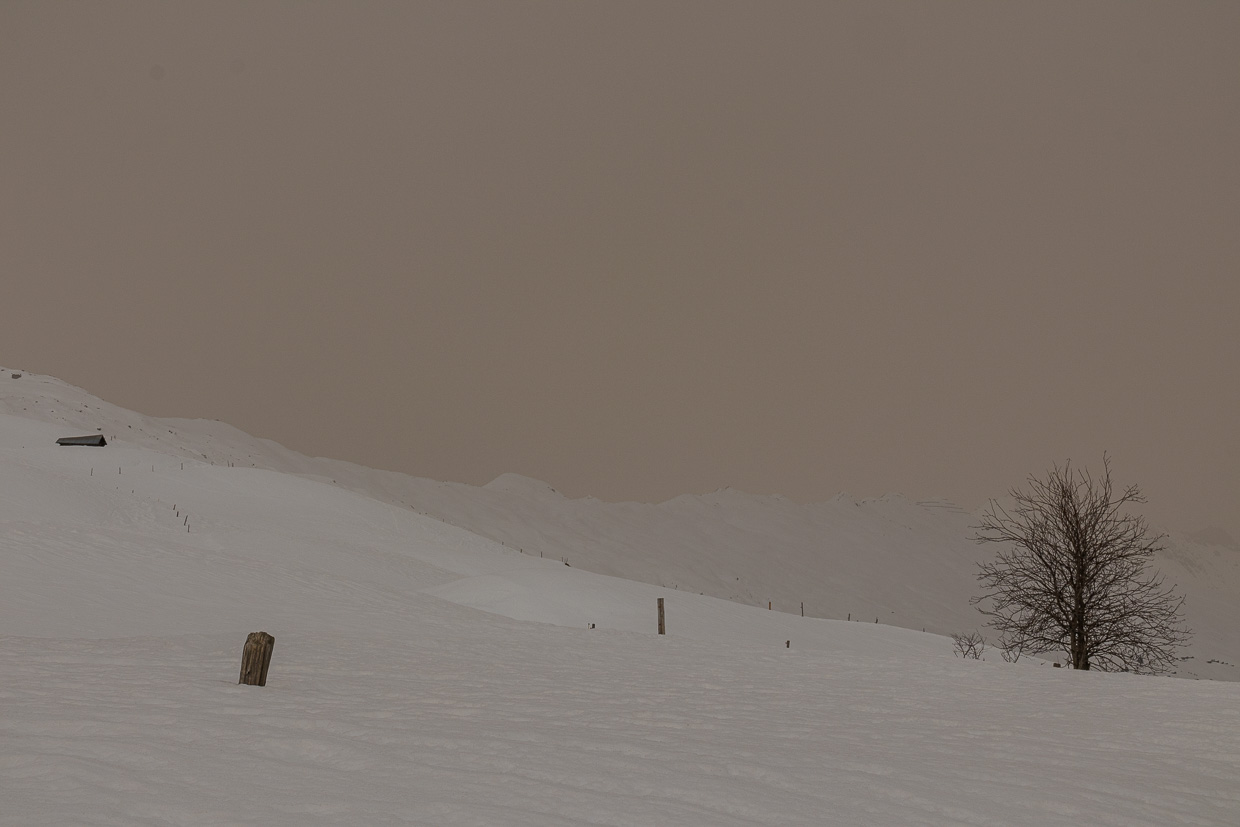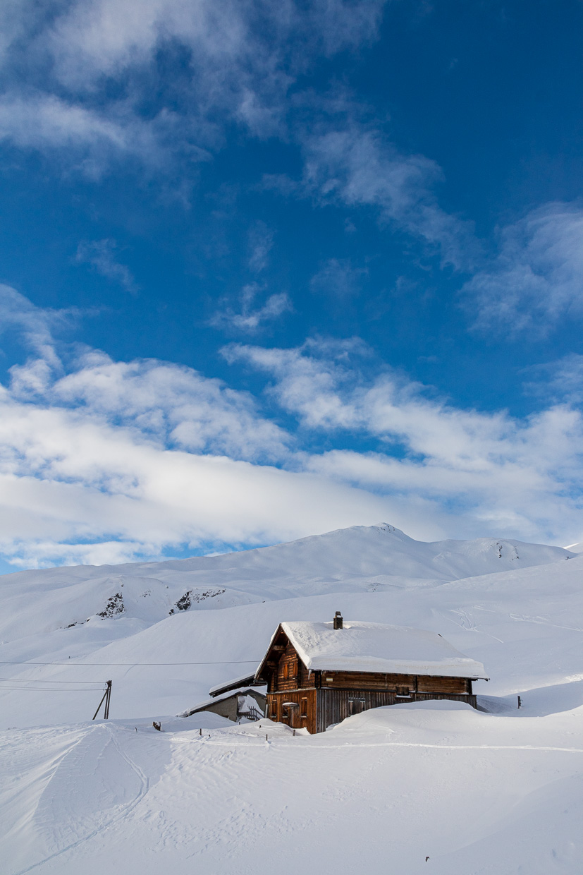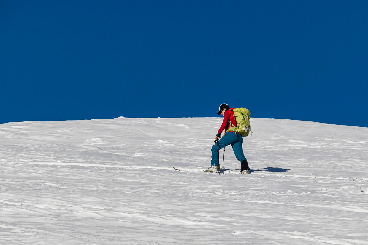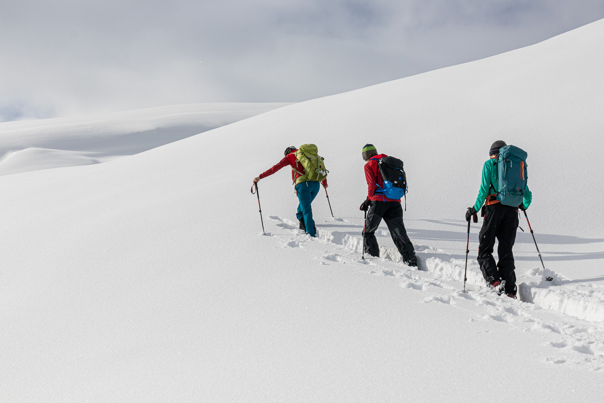 Wir starten vor der Haustüre, ich spure durch knietiefen Pulverschnee. Ein grosses Versprechen für die Abfahrt! Aber es ist anstrengend. Ich suche die flachsten Stellen für die Spur, der erste Tag nach Schneefällen ist bekanntlich immer der gefährlichste, da passieren die meisten Lawinenunfälle, das möchten wir selbstverständlich vermeiden. Nach ungefähr 150 Höhenmeter trete ich zur Seite und lasse Fabian spuren. Dieser geht wie eine Maschine voran, legt eine gute Spur. Bei den Alphütten, die wir am ersten Tag erreichten, machen wir wieder eine Pause, danach führt uns die Frau weiter hoch.