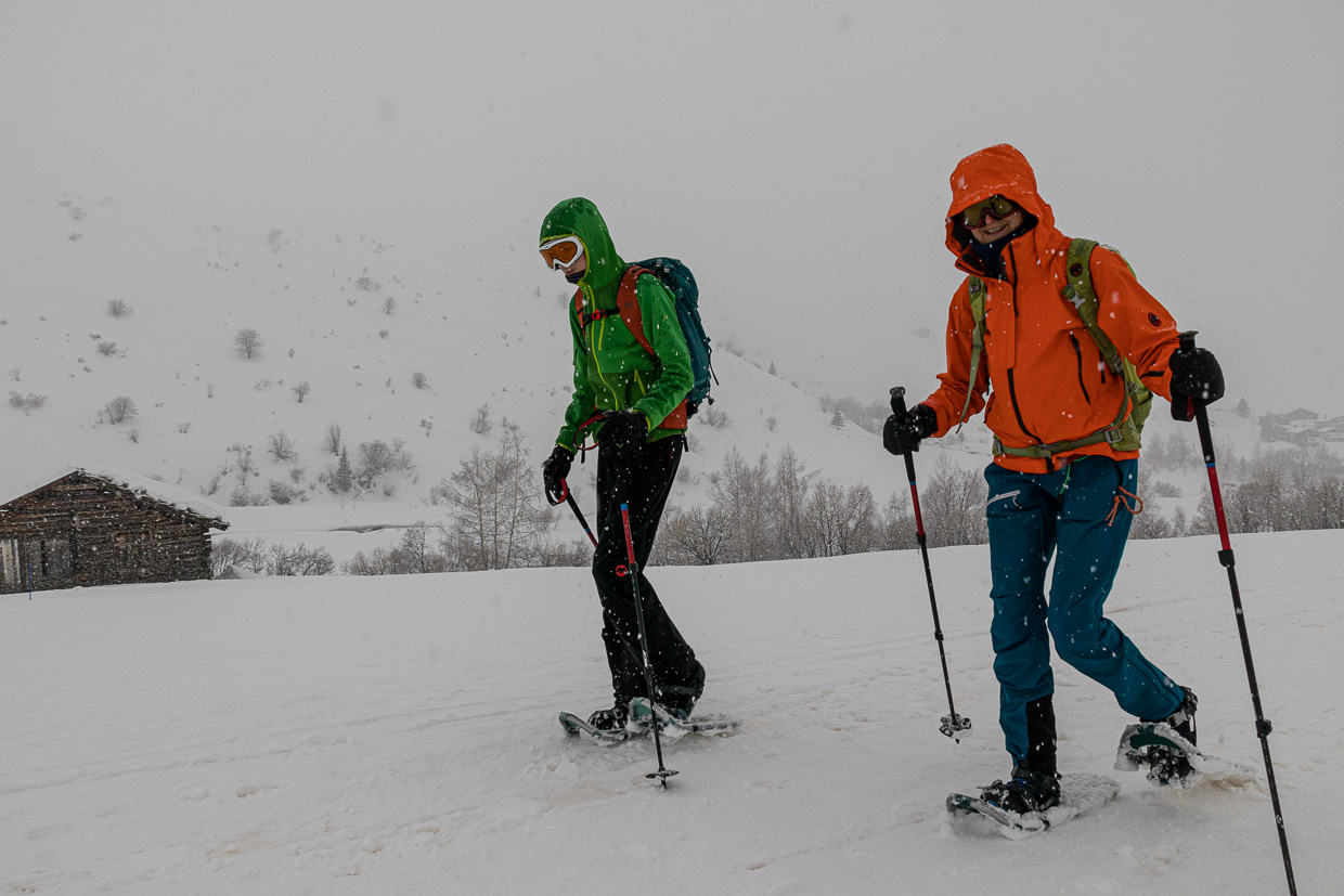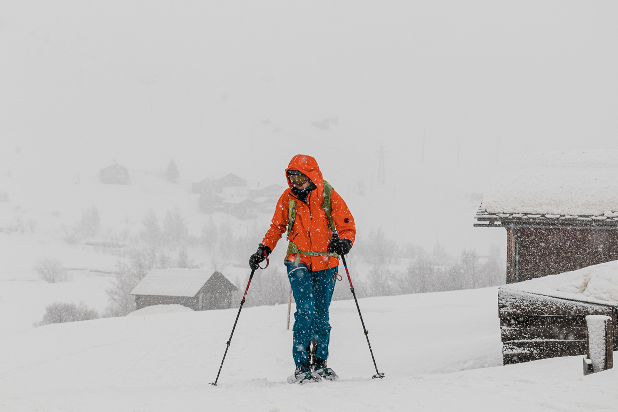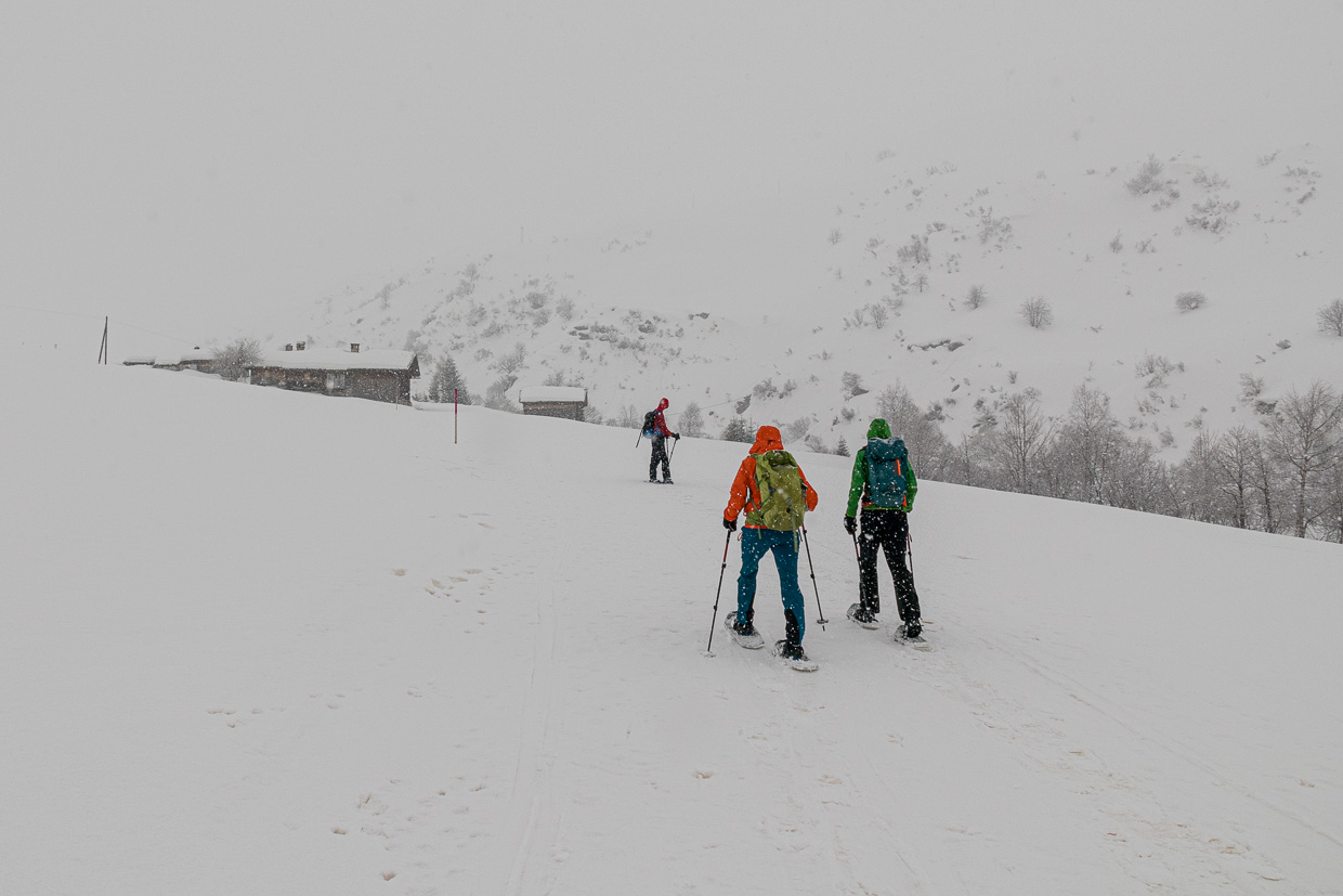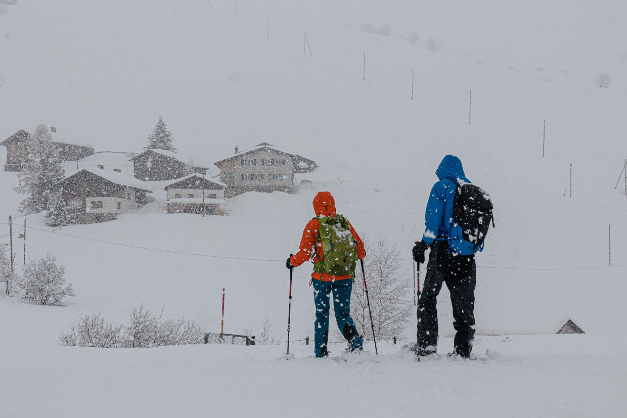 Für den Sonntag ist am Morgen noch besseres Wetter angesagt, gegen Nachmittag soll es schneien. Als wir am Morgen aus dem Fenster schauen, schneeregnet es noch, kurz darauf fallen aber schon grosse Flocken vom Himmel. Und das wird so bleiben, den ganzen Tag. Wir haben keine Lust auf Skitour, zu schlecht ist die Sicht in diesem unbekannten Gelände. Da bietet uns der Gastgeber seine Schneeschuhe an, vier Paar. Top!